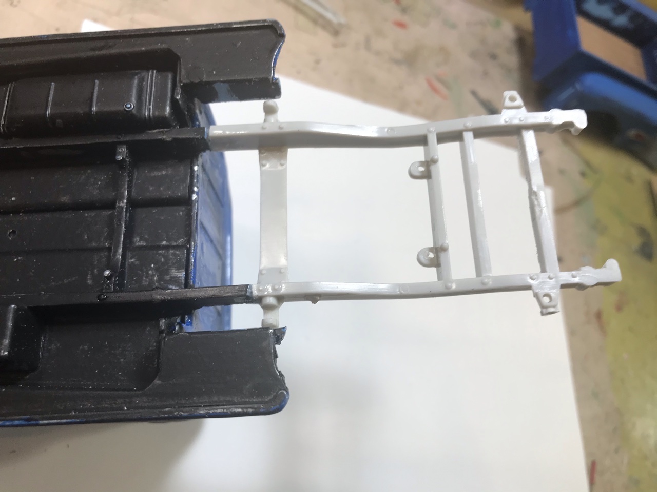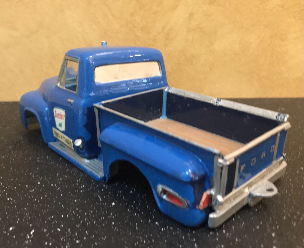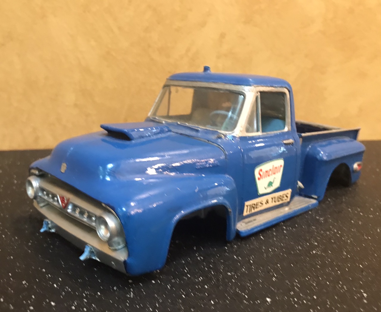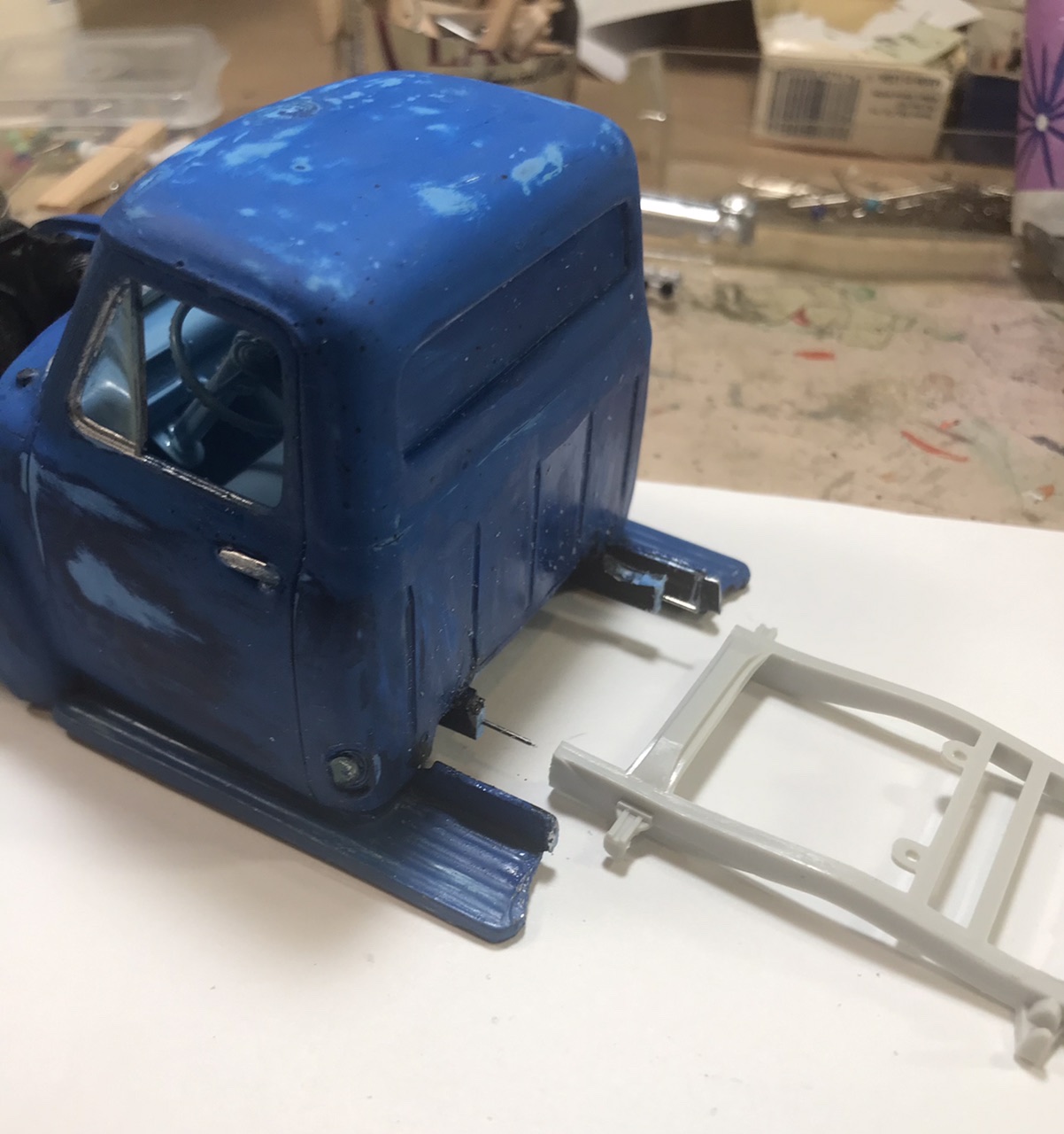 This old relic had been hiding in my 50s Ford Pickup junkyard box for a long time. I don’t even remember it’s origin. In model room maneuvers it wound up sitting on top of my TV where it sat and taunted me. So with the consensus of some Facebook friends I decided to bring her back over this rainy holiday weekend. Brish painted, chassis and all under hood panels painted silver... And some serious glue welding! There is no way to get it apart. That leaves me working around fixed glass and interior. It had no suspension at all. I did get the bed off and engine out. Some kid’s best work. So let’s see if we can make it smile... A bit of quality time at the sink and I wet sanded all the lumpy brush paint. I found an additional coat of dark blue underneath, which works fine for our intent. Added some more blue paint, and gave it all a coat of Testors Dullcote to see where we stand. I thought I’d leave a few of the signature bits.. kept the hood scoop and Chevy rear fenders with custom tail lights. It will retain the Desoto Hemi. My goal for today was to get it up on wheels. I went fishing in my parts box for new suspension parts and that’s when I found two issues.. our model’s chassis was broken on one side and it had no rear suspension mounts. So I fished out a new chassis and spliced the back half in. Note two things in the above photo.. I cut the chassis at two different points.. the break was the one closest to the cab, while the other was directly in front of the suspension mount. I wanted to eliminate a weak point on the frame from parallel cuts. I also drilled and pinned, then glued it all with gap filling thick CA. And all fixed! Splice is probably tougher than the rest of the frame. I will pop on the suspension in the morning.. I want to fiddle with ride height a bit! Just having fun...