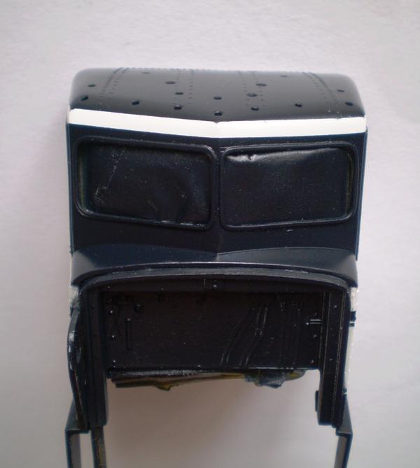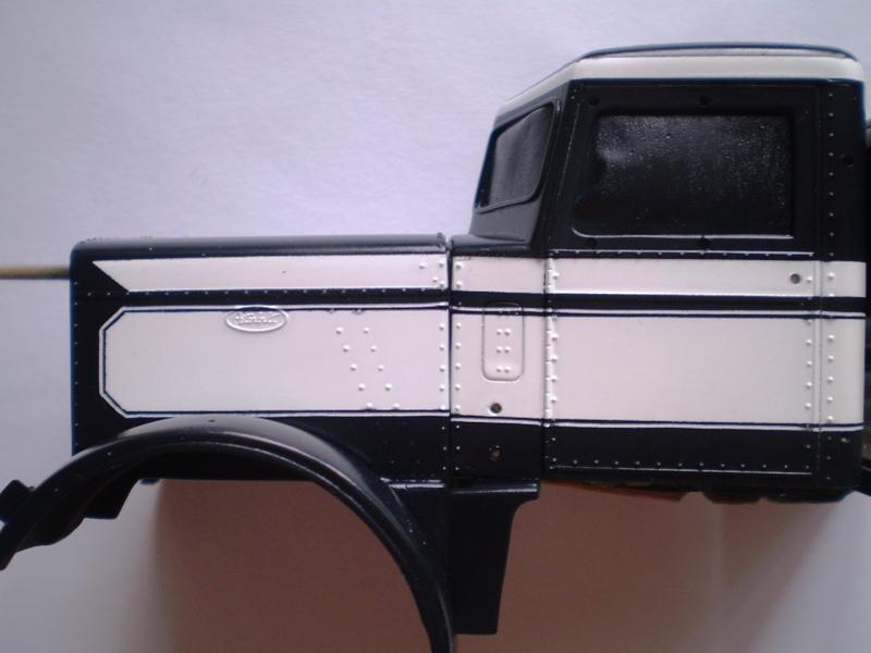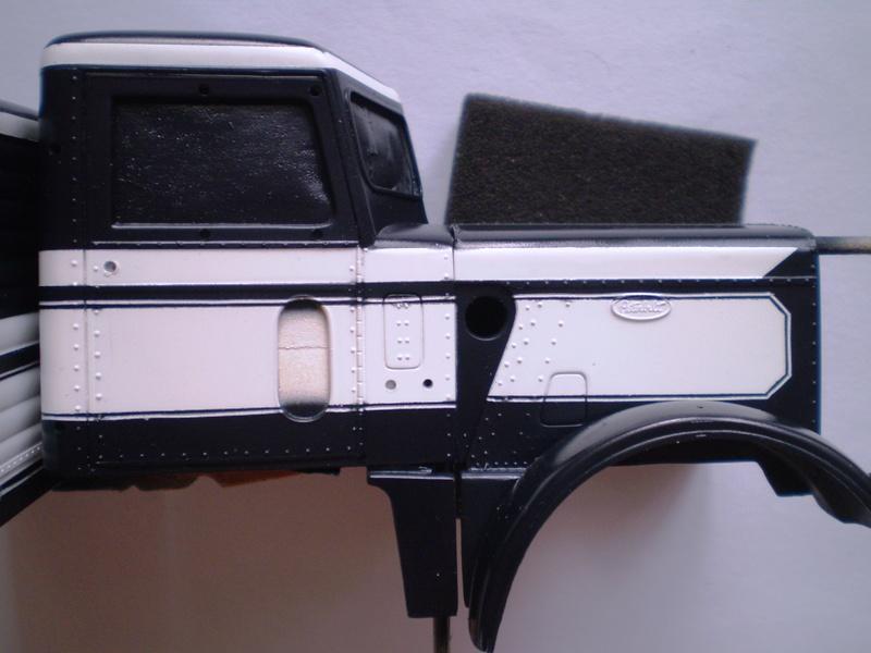 I have not posted here for a while because I was fighting the painting job. The skin of the cab / sleeper full of rivets, grooves and diamond pattern is not ideal for the paint scheme I chose. Masking over rivets and such is anything but wise. This is my second attempt in spraying the white and dark-dark blue combination. The surface is anything but smooth but I believe I can polish it with a fine paste. But first I have to repair all the imperfections. It is going to take a bit more time to finish the paint job. Be patient with me please.
