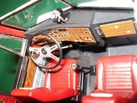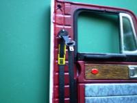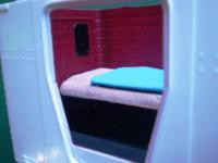 A little bit of progress on the interior. Another nice detail on the PE sheet for Peterbilt is a pair of the seat belt buckles and comfort latches. Unfortunately, the belt retractors and the shoulder sash guides are missing. So are the belts. I made mine out of paper painted black and scratch built the missing parts. The wood grain patterns that you can see on the door panels are painted brown over yellow using a sponge. I produced the red oval logos using decals as templates and placed them to the seats and the floor mat in front of the passanger seat. The PE sheet brings even such a tiny detail like the shifting pattern on top of the gear stick. I added a CB and FM radio to the interior details of the ultra-roof. I did not take too much care of the sleeper interior as I won´t open it. But I did not like the molded mattress, so I covered it with a sheet and blanket. -