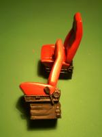 Painting the seat frames is almost as amusing as cutting them off the sprue and cleaning. The frames are painted with chrome alclad and red humbrol. The alclad requires a black undercoat which I sprayed over the frames at once. I tried to minimize the waste of alclad colour, so I painted the frames one by one this time. And then I painted red humbrol with a brush. Two layers because the black undercoat made the red look a bit dull. I started painting the seats today. I will post pictures when they are finished. I hope I won´t mess the decals.