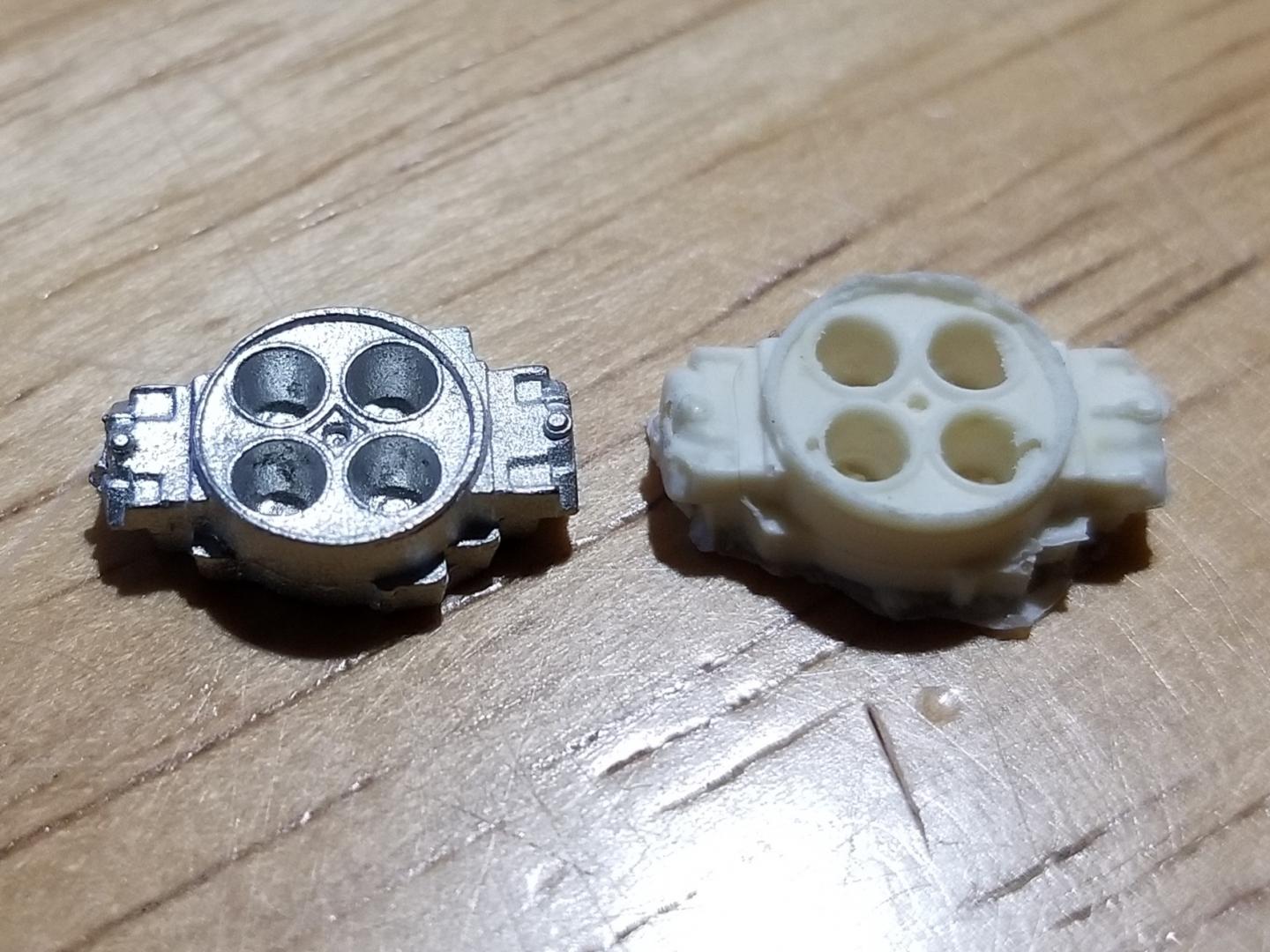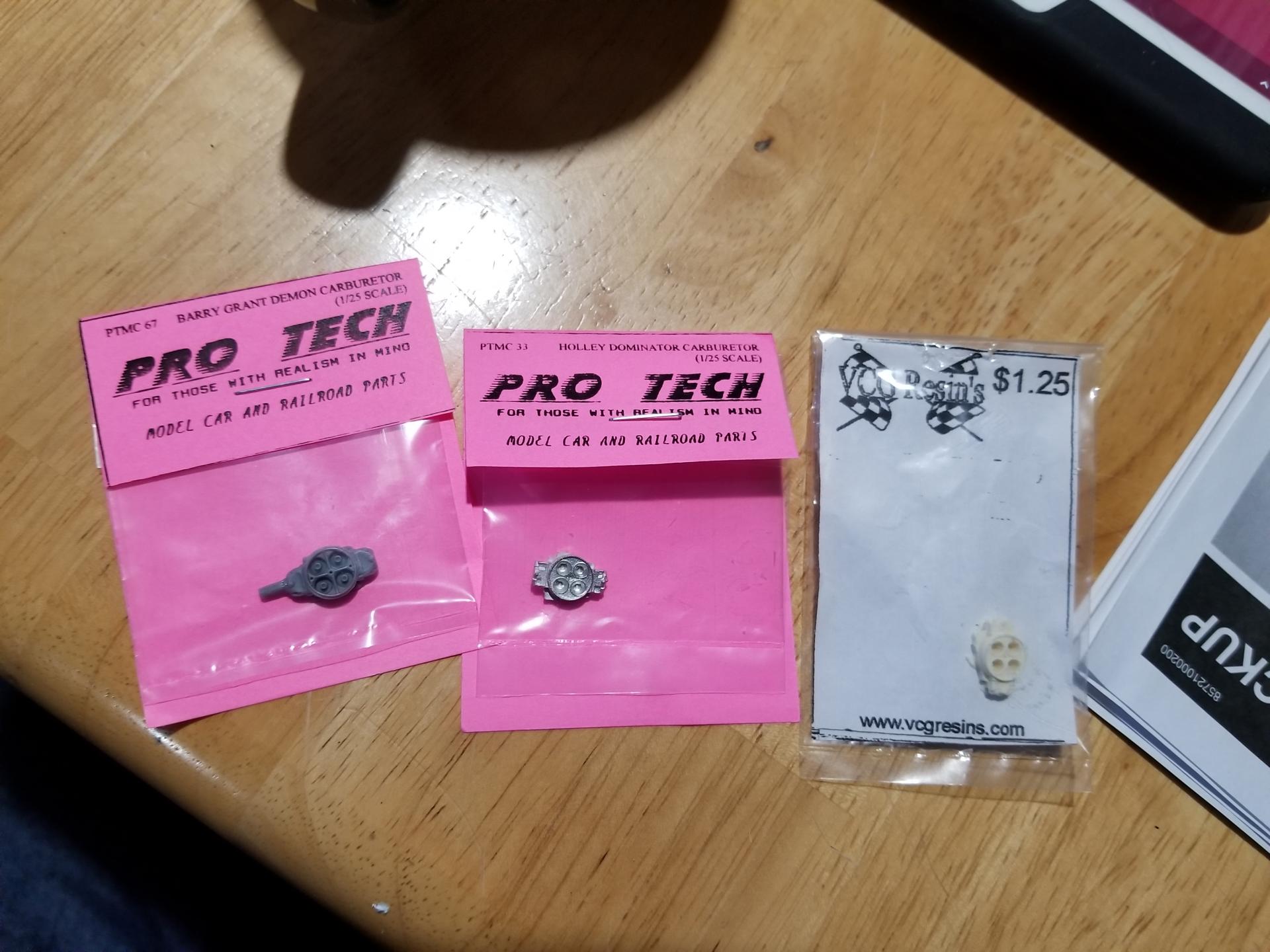 Bought a few carbs from Ted's Modeling Marketplace. First one is a Pro-tech Barry Grand Demon carb. Details are amazingly crisp and very nice piece (wish I would have bought a few more). Second is a Pro-Tech metal Holley Dominator. Again, great detail but will be harder to detail since its metal and not resin. Third is a copy of the Holley Dominator casted by VCG Resins. They obviously made a cast of the Pro-Texh unit and made it out of resin. While it's a direct copy, it isnt the greatest quality. Lots of extra flash everywhere and crisp details were lost in the cast. Maybe they should make new molds out of better material? Not sure. This is the 1st piece I've gotten from VCG but since they have a store, I hope they improve their casting. Not trying to bash them, just giving my own review and opinions. I have never cast something but would like to give it a shot sometime for my own personal use, not to copy other's work and sell them. Anyway, I highly recommend Pro-Tech stuff. VCG wasnt junk by any means...I can clean it up and use it, but I'd rather spend an extra dollar to use something I dont have to clean up to make look better.