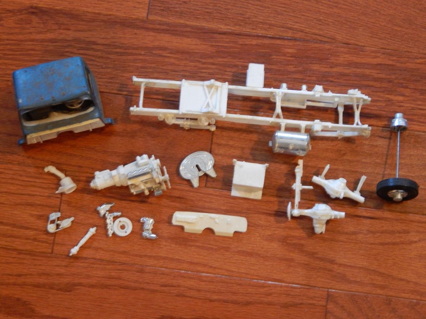 It started out as an ebay buy of a mess of "parts". The cub,hood interior and front I beam/rims and tires are from the Louisville box truck, The mirrors and stack as well as the rear tires are from an IH S-series 2575. The cab lights are out of a revell snap Peterbilt. The front bumper is sourced from a DM 600 kit .It still needs a rear rim and a few minor parts/paint and it will be finished. Picture one is What i got it like and the other pictures are what I managed to do to save this kit.