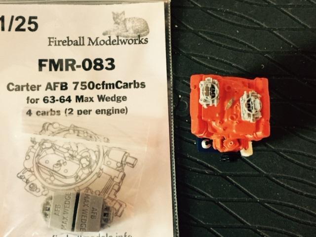 I got my Carter AFB carbs for my Max Wedge 426 Plymouth Super Stock today from Fireball Modelworks and all I can say is...Holy Moly!! Joseph has done it again. We never had such detail in carburetors like these. Couldn't wait to test mount on my cross ram wedge, take a look. They are dead on compared to the actual picture. I always look forward to Fireball's new stuff.