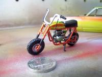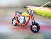 This is a box-stock Taco minibike from the TD Vandal kit,I would build an army of these is I could but there so darned hard to find,hopefully with the Vandal being re-issued I can stockpile as many of these as possible.I did a pretty basic build up on it,Striped off the chrome and paint,then sprayed a base of tamiya chrome silver and misted clear red and yellow then hand painted everything green.
