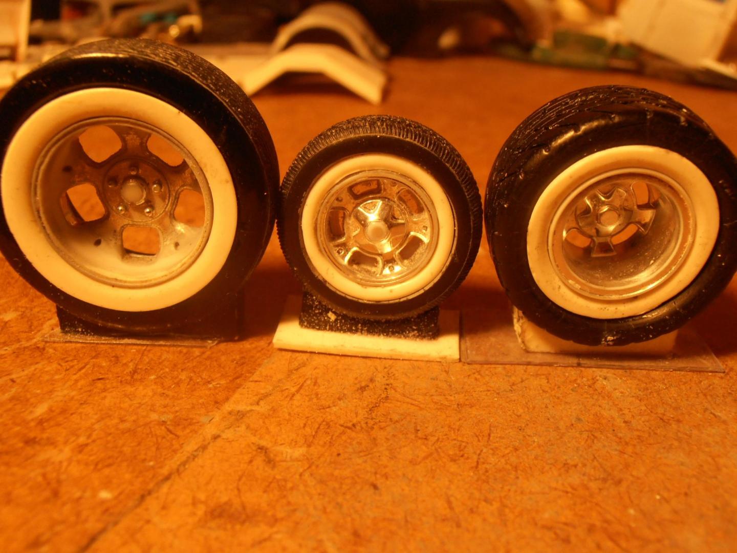Hey Guys ! It has been a while but I was finally able to finish the masters for the wheels and tyres. The version on the far right is a mild pro street configuration. All the whitewalls are separate inserts. I have been wanting to create a set of standout big n little wheels for a long time only to find myself thwarted when it came to the design of the tyre. For the high profile tyres it was a case of splicing a second tyre into the existing one to raise the diameter. For the small one in the middle, the centre had to be carved out to fit the whitewall inserts. The other side of this tyre also takes a larger front wheel not shown, that has the same pattern as this one. The larger wheel on the left was widened by 2mm and the diameter was reduced by 1mm. These wheels work out to around 19 inches in 1:1 scale. With the slightly reduced diameter and deeper offset the overall effect is closer to what I originally set out to do and that was replicate the style used on Bobby Alloways 34's he built in the mid nineties.