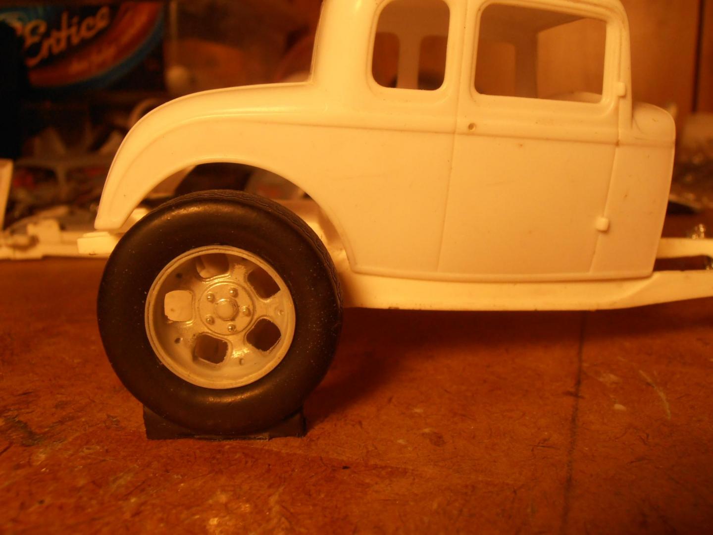 Here is another image of the same wheel in a different tyre, this is one of the resin tyres that was painted up. I have been casting all the wheels as well as an adapter that attaches to the large wheel hub, that replicates the star cap shaped hub on the small wheel shown in the first image. The only remaining task know is to make the backs for both wheels and the brakes for the rear ones and cast them up too. Once these tasks are complete, I can finish work on the five spoke versions that will run the same outer rim as these ones. These wheels fit neatly under all the Model A, 32 and 34 Kits I have tried out, with or with out fenders. I will have more photos once I have finished the five spoke versions.