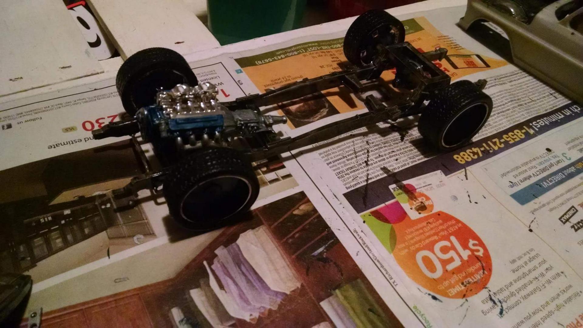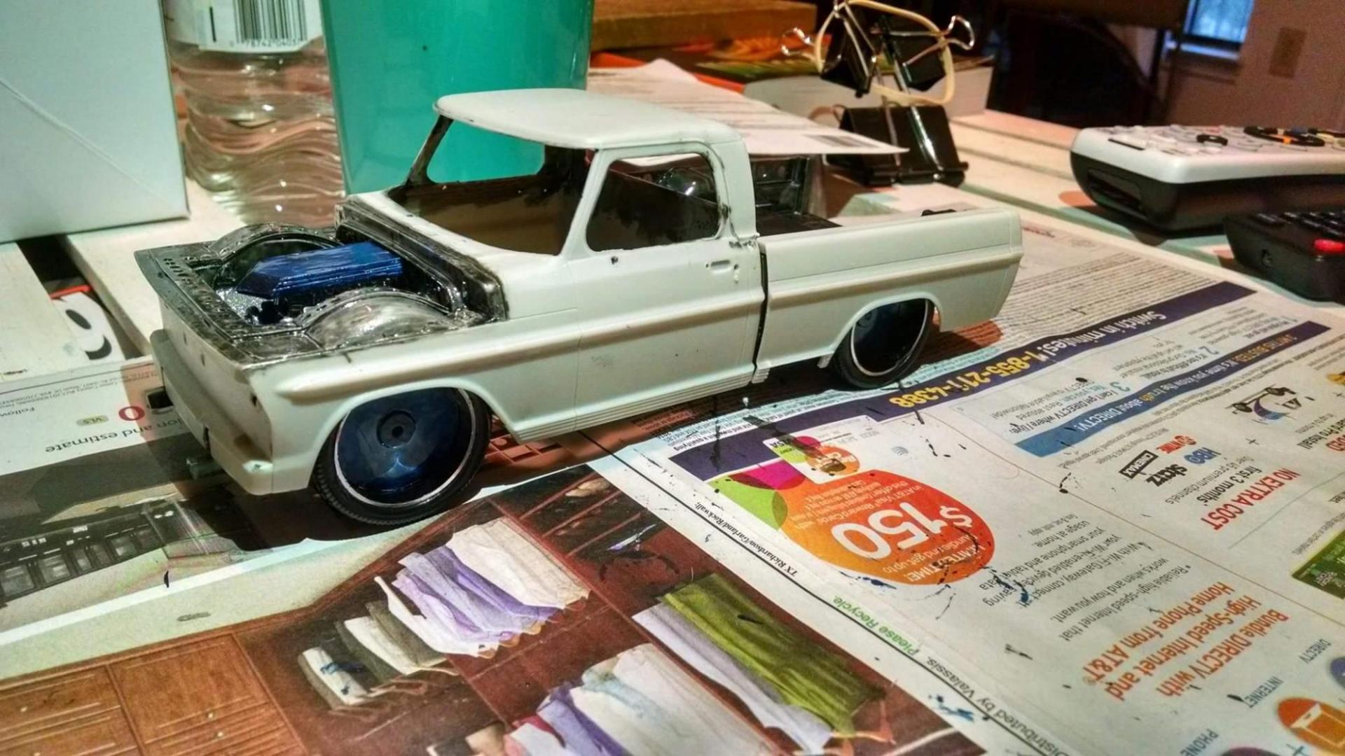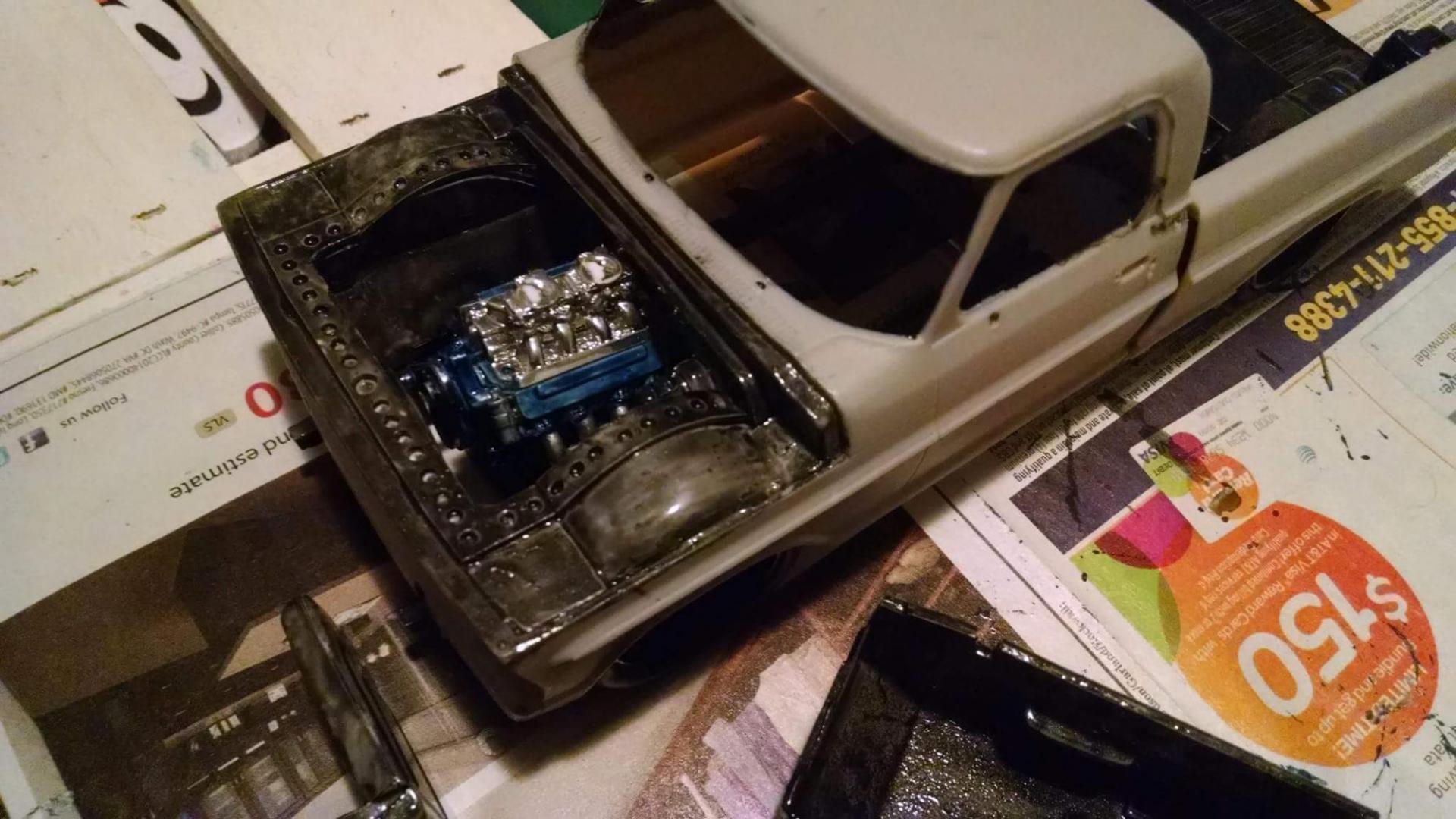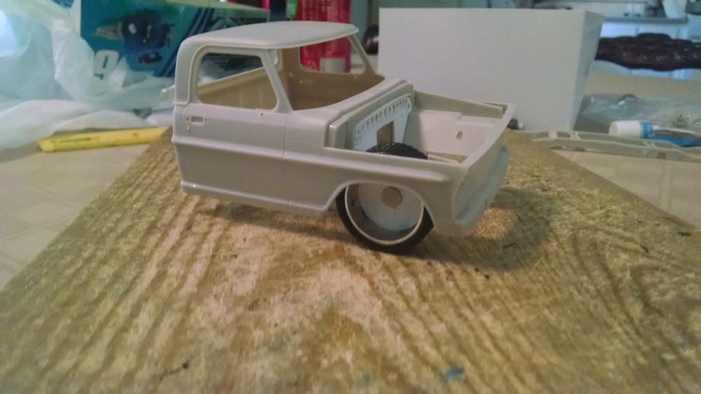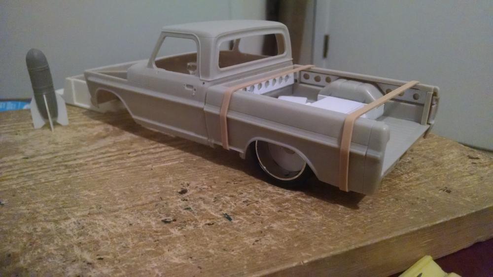 I knew I wanted to lower it and use bigger wheels. Had to have a big V8 motor and IFS instead of the twin I beams. Went to my parts box and found a 428 I had from the Revell Thunderbolt with the headers, found some bigger wheels and tires that I planed to cut the wheel piece out, found a bomb from something, and a set of 69 mustang seats, and then the hood from a 78 f150. Then got to work. Still have the center of the bed to modify for the chassis mods. Then got to work making the bomb fit the bed, it'll be the air tank for the air ride suspension.