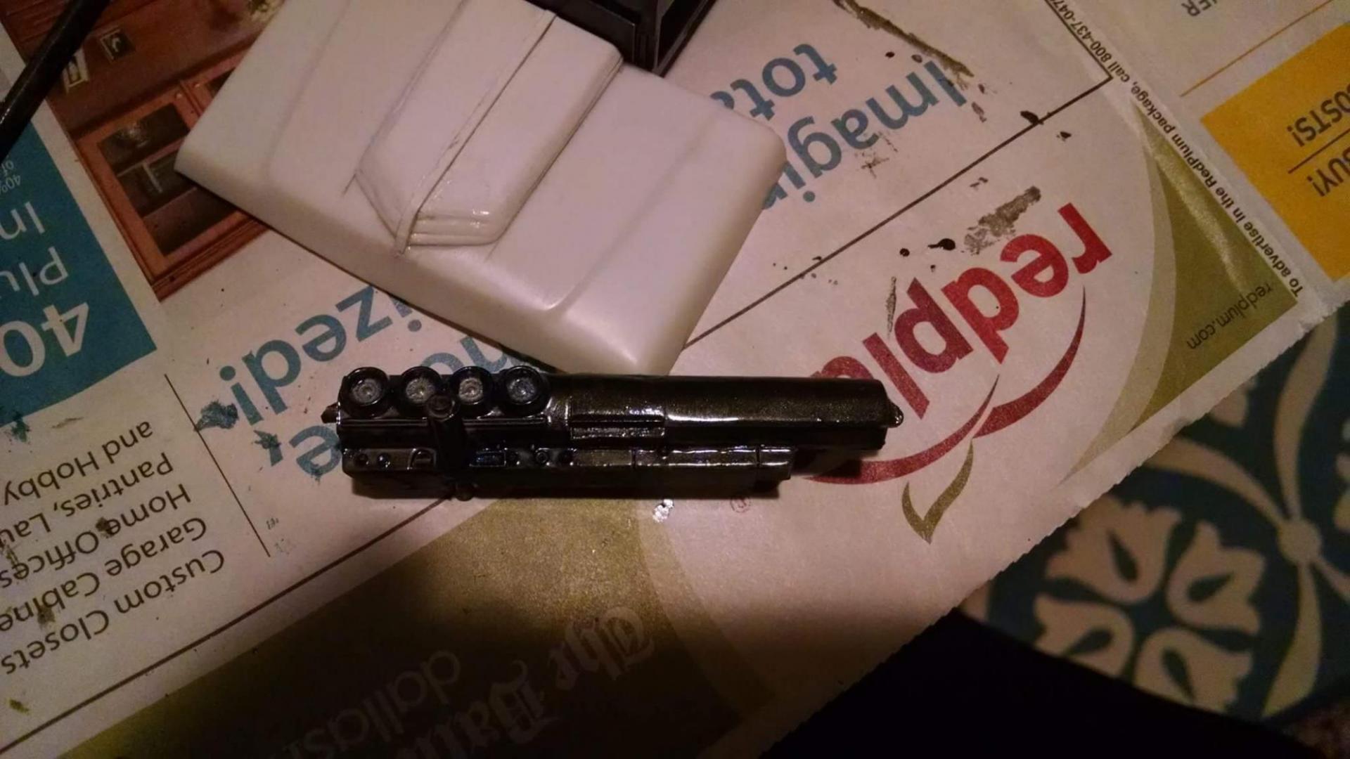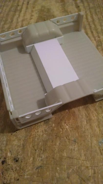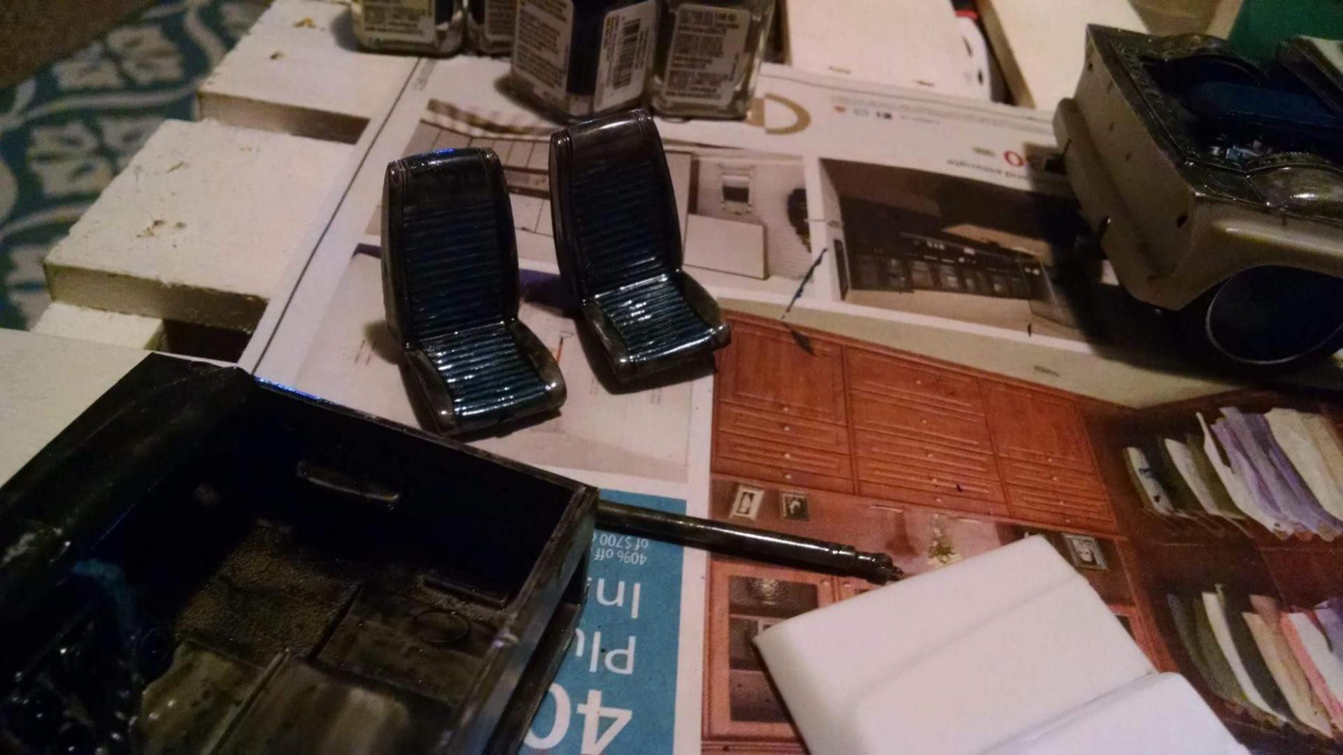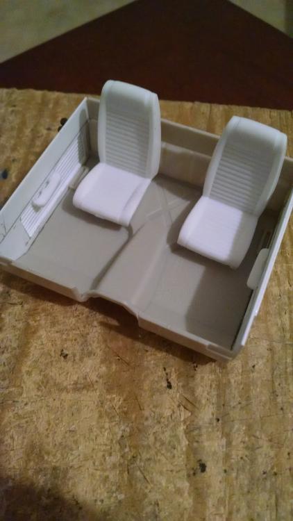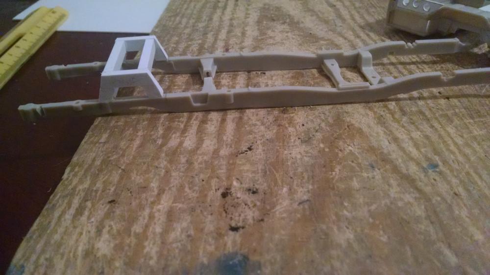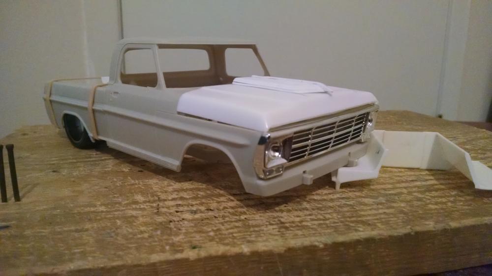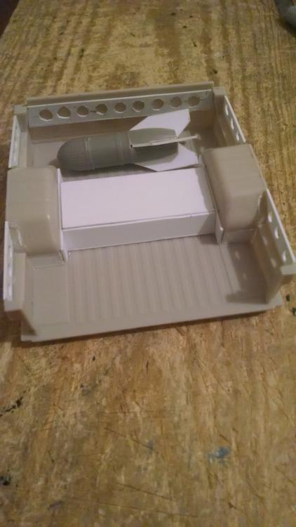 I knew I wanted to lower it and use bigger wheels. Had to have a big V8 motor and IFS instead of the twin I beams. Went to my parts box and found a 428 I had from the Revell Thunderbolt with the headers, found some bigger wheels and tires that I planed to cut the wheel piece out, found a bomb from something, and a set of 69 mustang seats, and then the hood from a 78 f150. Then got to work. Still have the center of the bed to modify for the chassis mods. Then got to work making the bomb fit the bed, it'll be the air tank for the air ride suspension.
