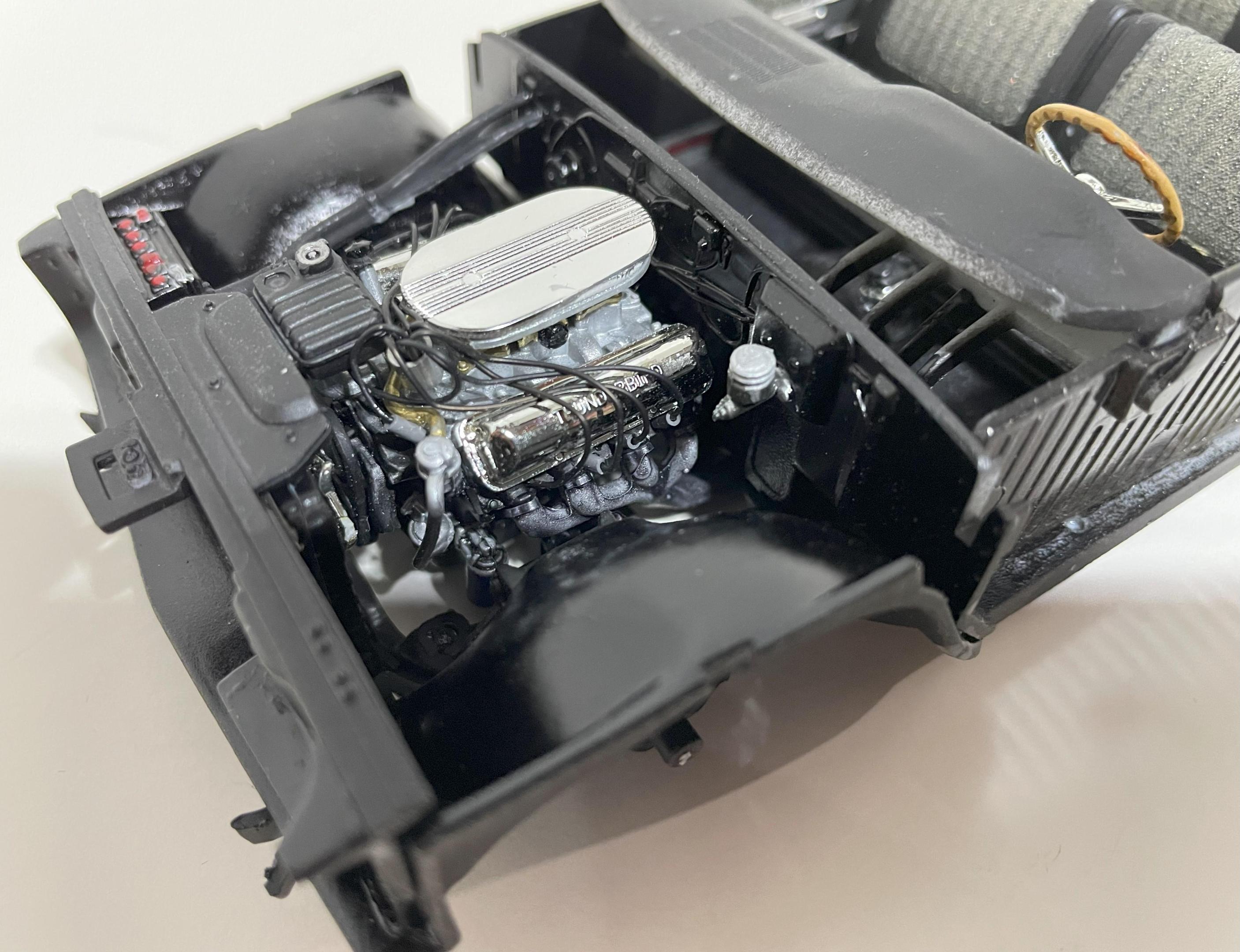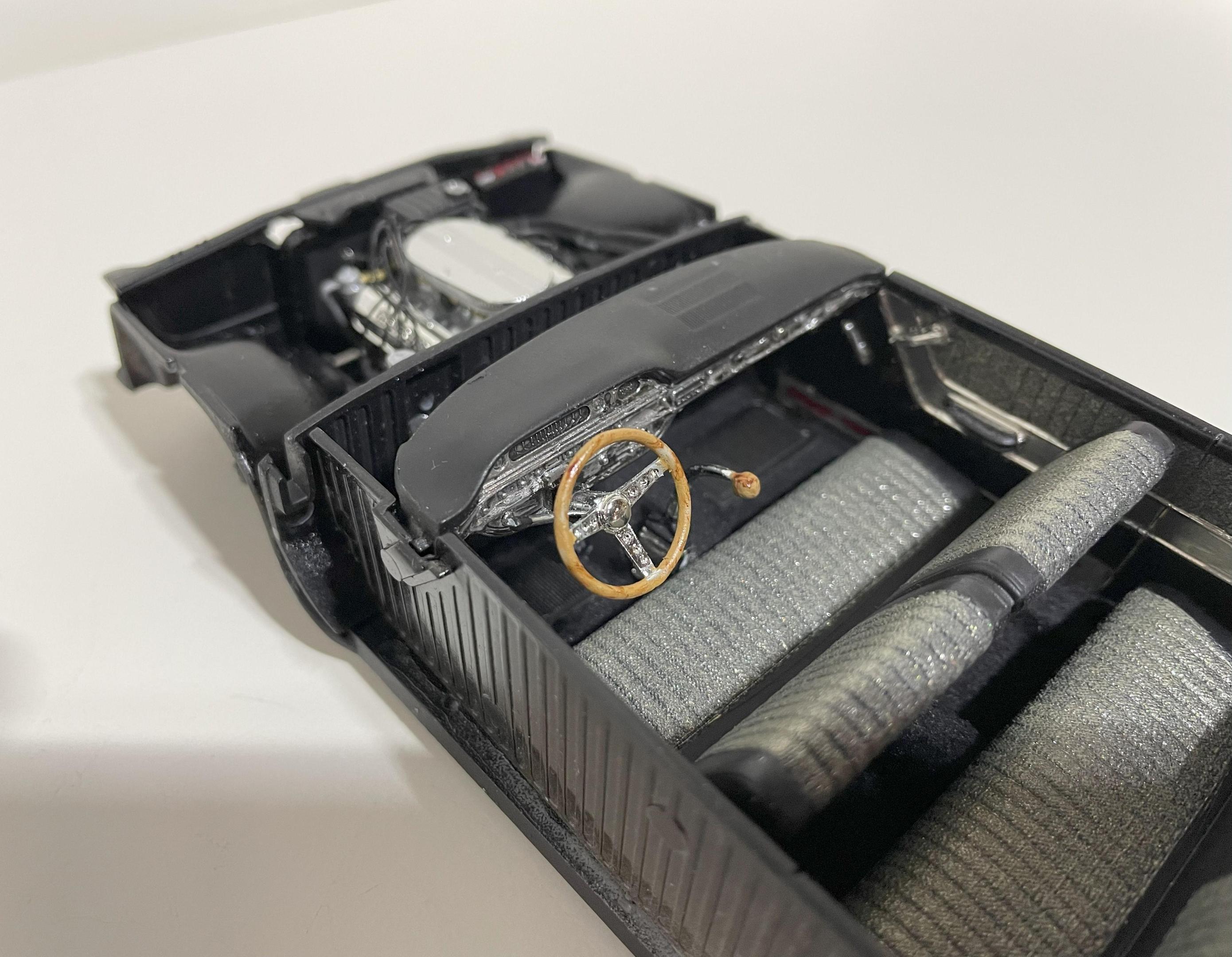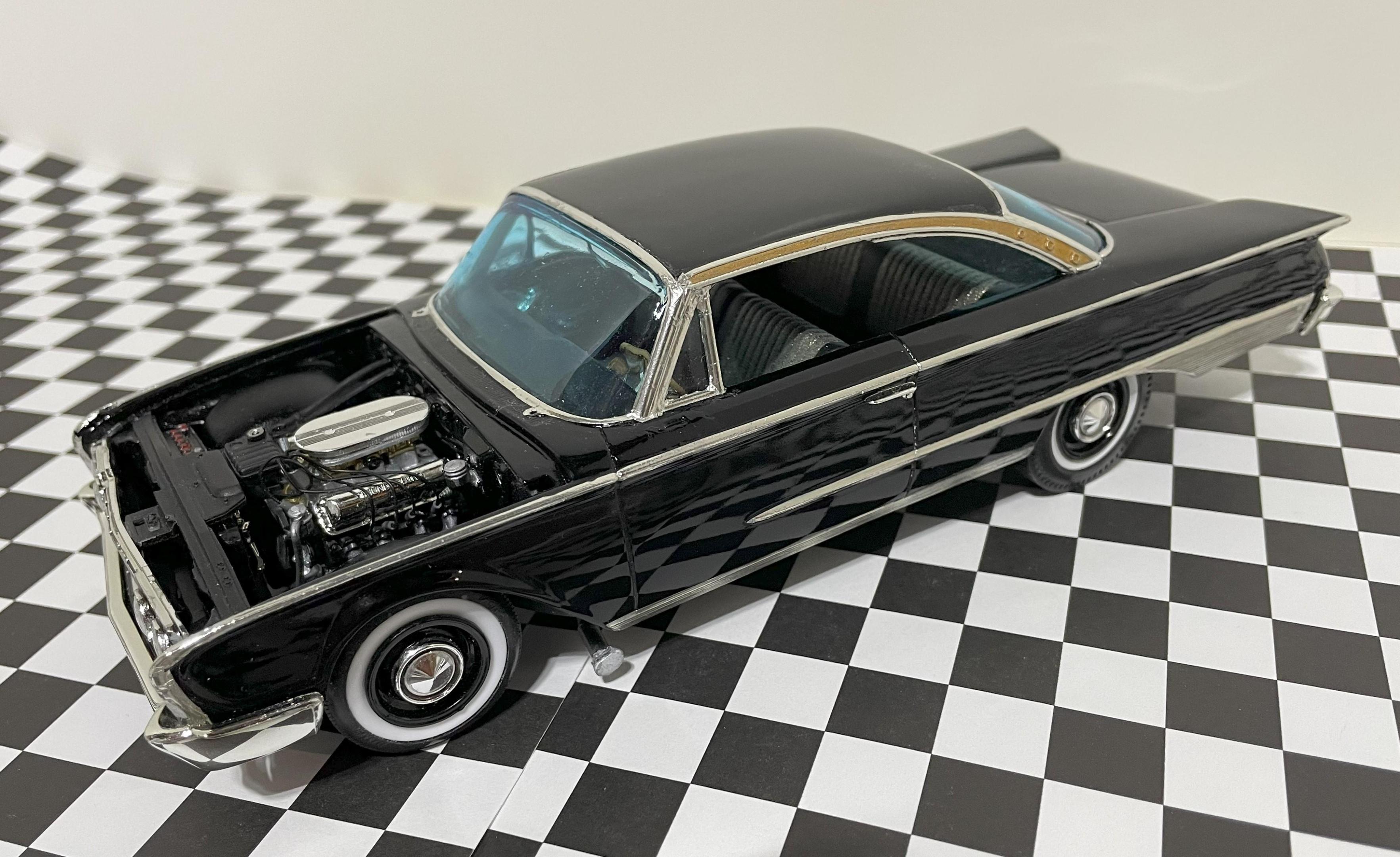 In the spring of 1960 this car appeared in a neighbor's driveway. I would stare at it every day from the school bus window. Since I would be getting my driver's license that summer, I was captivated by how it looked. This is the Revell kit with Tamya TS-14 Black for the body and the gold roof trim is Testors Pure Gold just like the real car was done. The owner had someone remove the hood and rear deck trim along with the front fender Starliner trim. The interior is done in Matt Black and a dusting of the Pure Gold to try and replicate the Ford interior cloth inserts. Using the kits engine option I added an aftermarket distributor and plug wires and fabed an exhaust system. Lowered the front suspension and used some AMT aftermarket small diameter wide white tires. The rear tires are also AMT from their Slicks collection. So, this is to best of my recollection from what was a 15 1/2-year-old car nut.