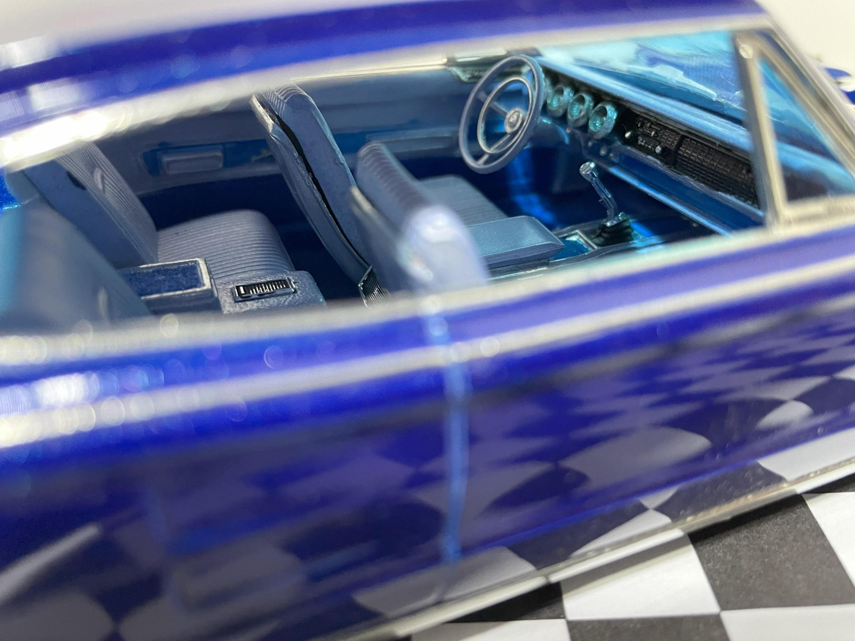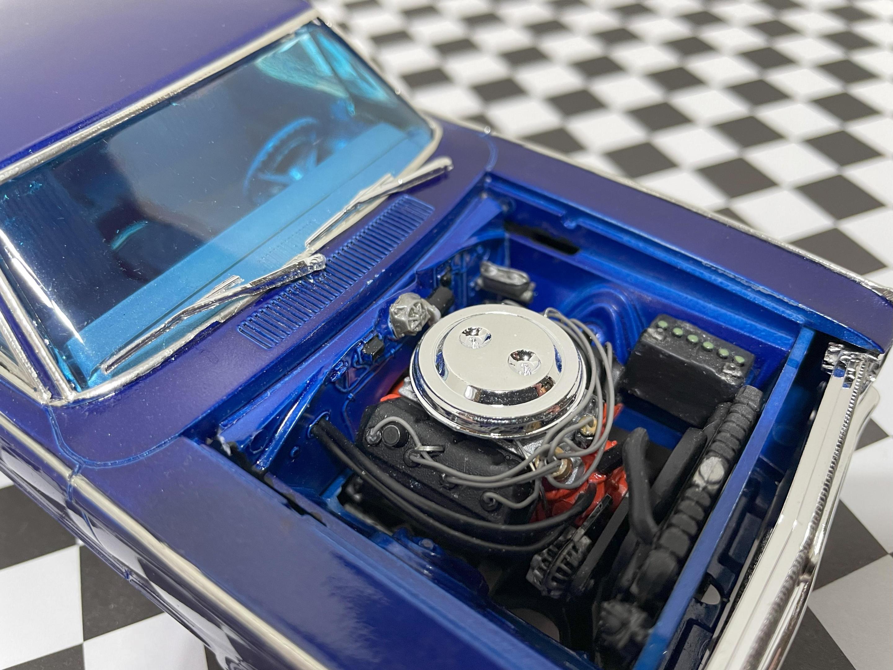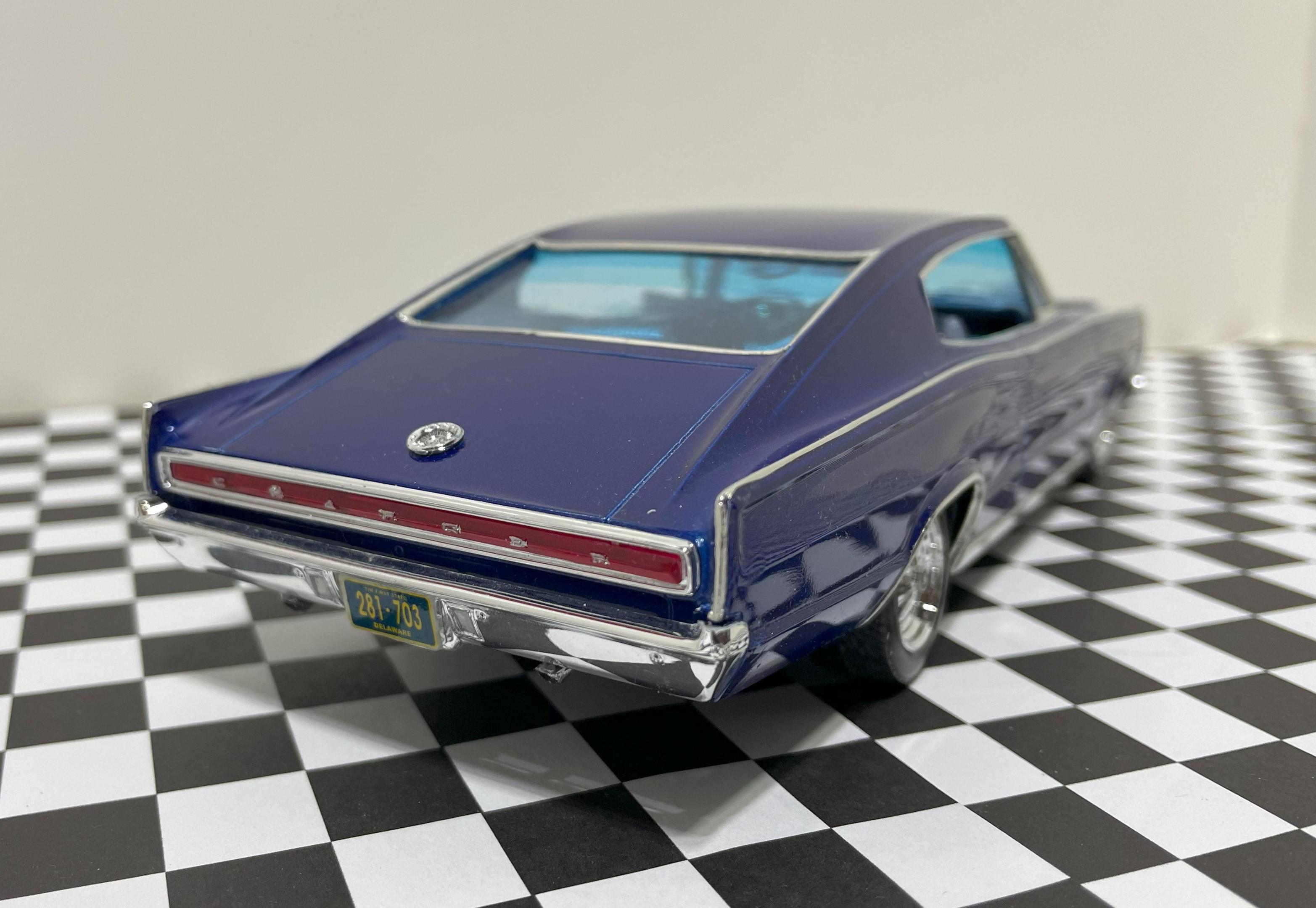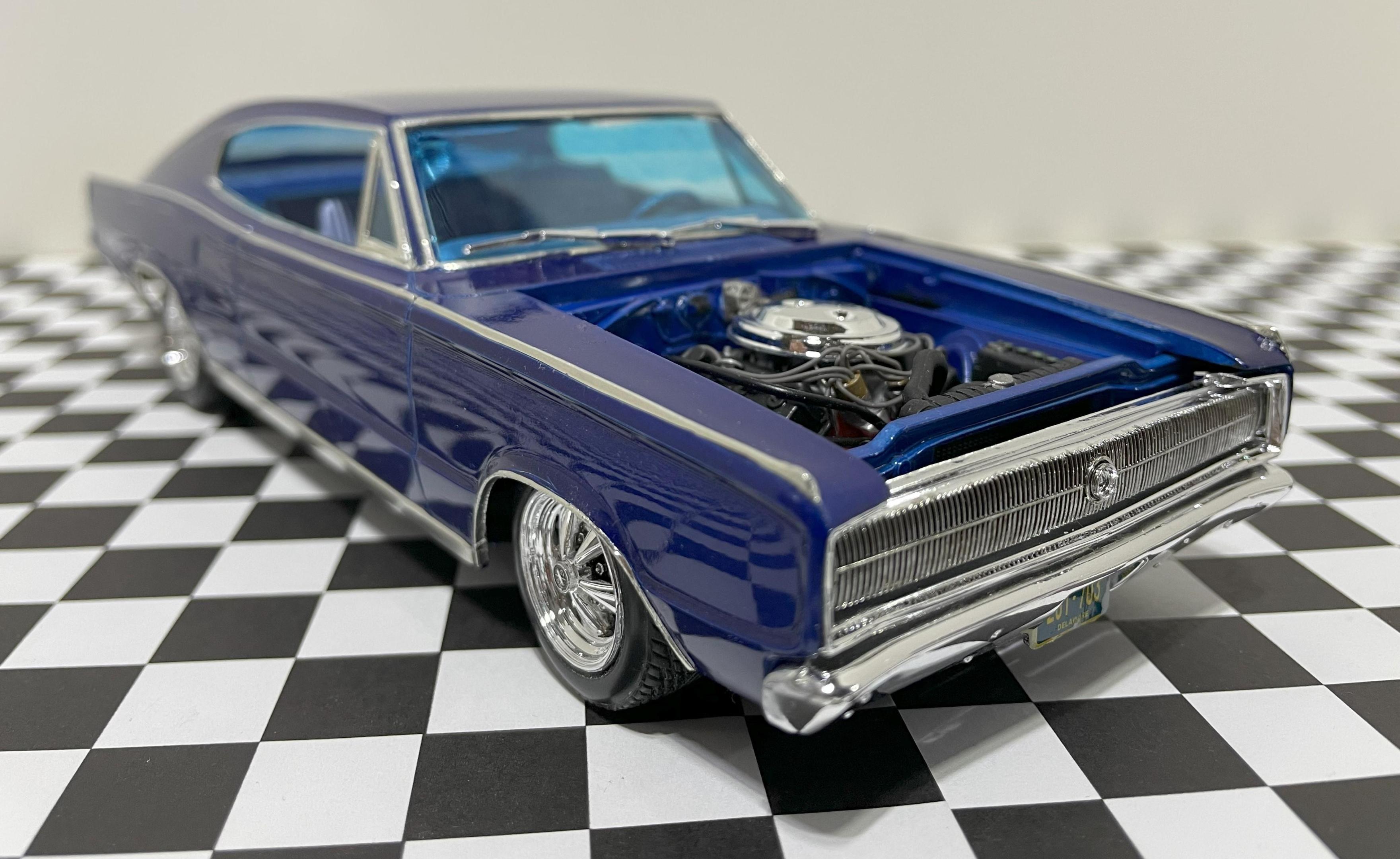 This is the Revell '67 Charger as a day 2 car. The suspension has been slightly lowered front and rear. Used the kits wheels with slightly wider tires. Some minor trim removed. The paint is Tamiya TE89 Pearl Blue and TS72 Clear Blue and TS65 Pearl Clear. The trim is all done with Bare-Metal Foil. Both front and rear bumpers have been brought closer to the body and the grill was also set into the body. The interior is done with TS58 Pearl Lt.Blue and semi-gloss clear. The carpet is done with Fuzzy Fur and chrome trim is all foiled. The windows are tinted with a couple of light coats of TS72 Clear Blue. The engine is lightly detailed with spark plug wires, dist., and heater hoses. Removed the chrome from the valve covers and painted them a semi-gloss black. Great kit with no fitment issues.