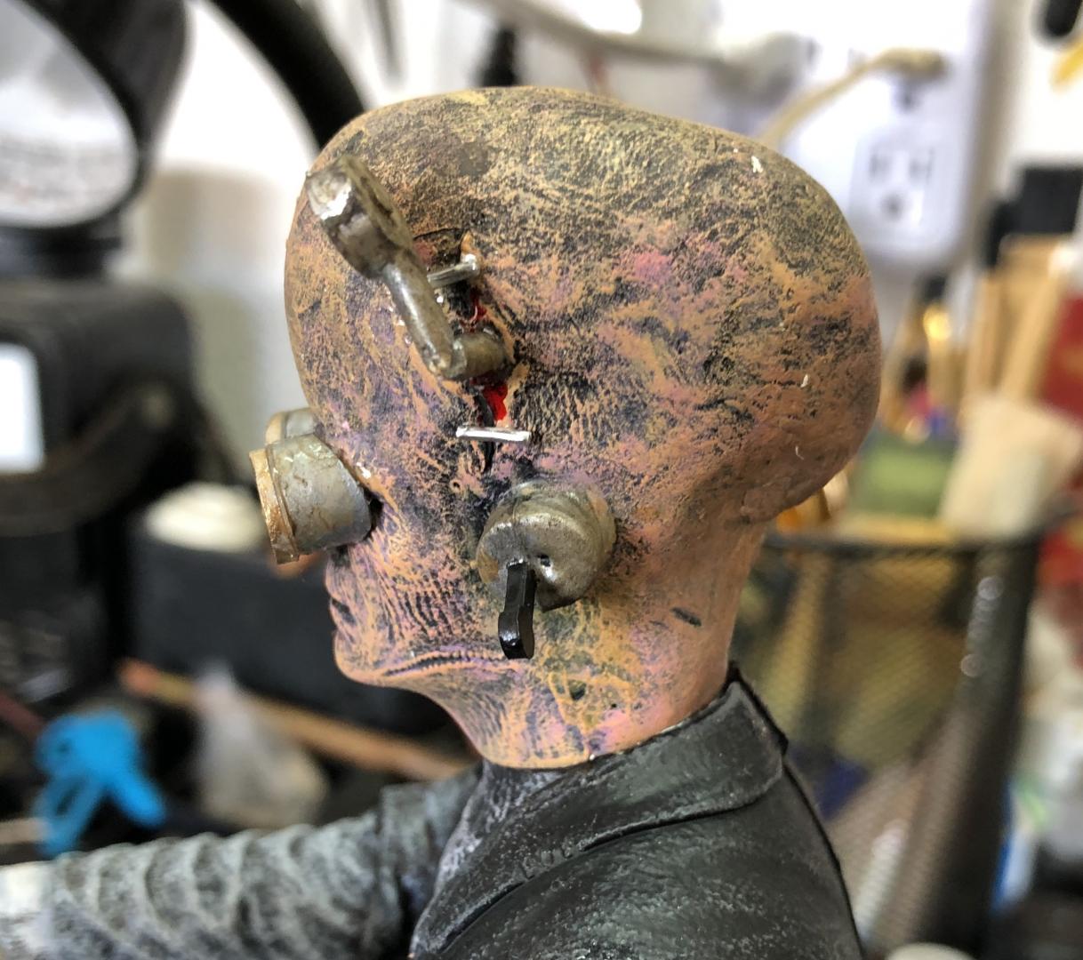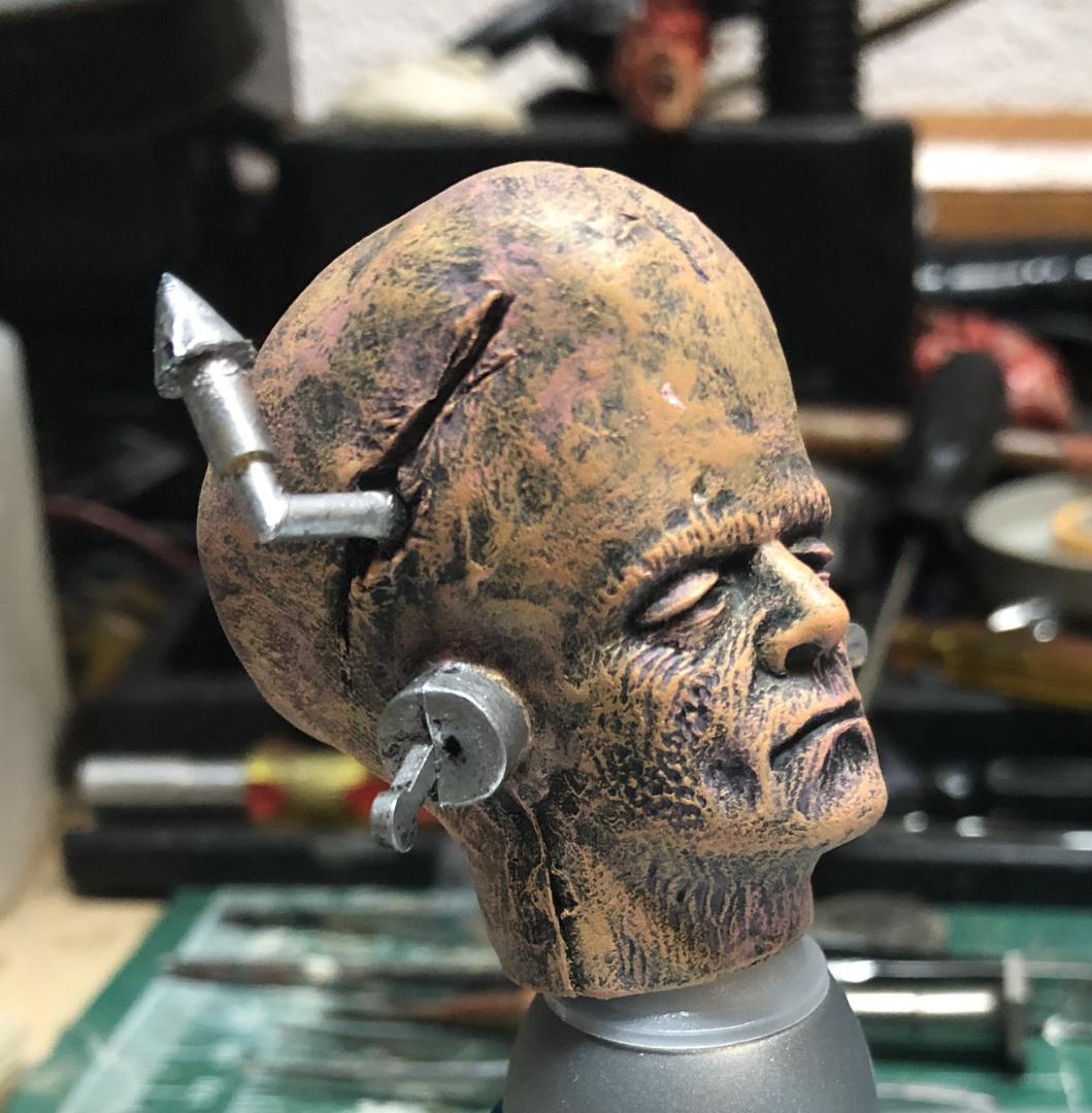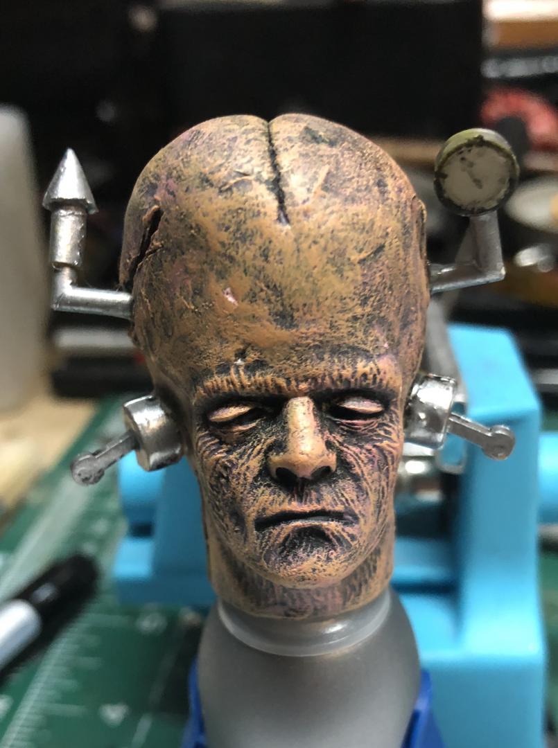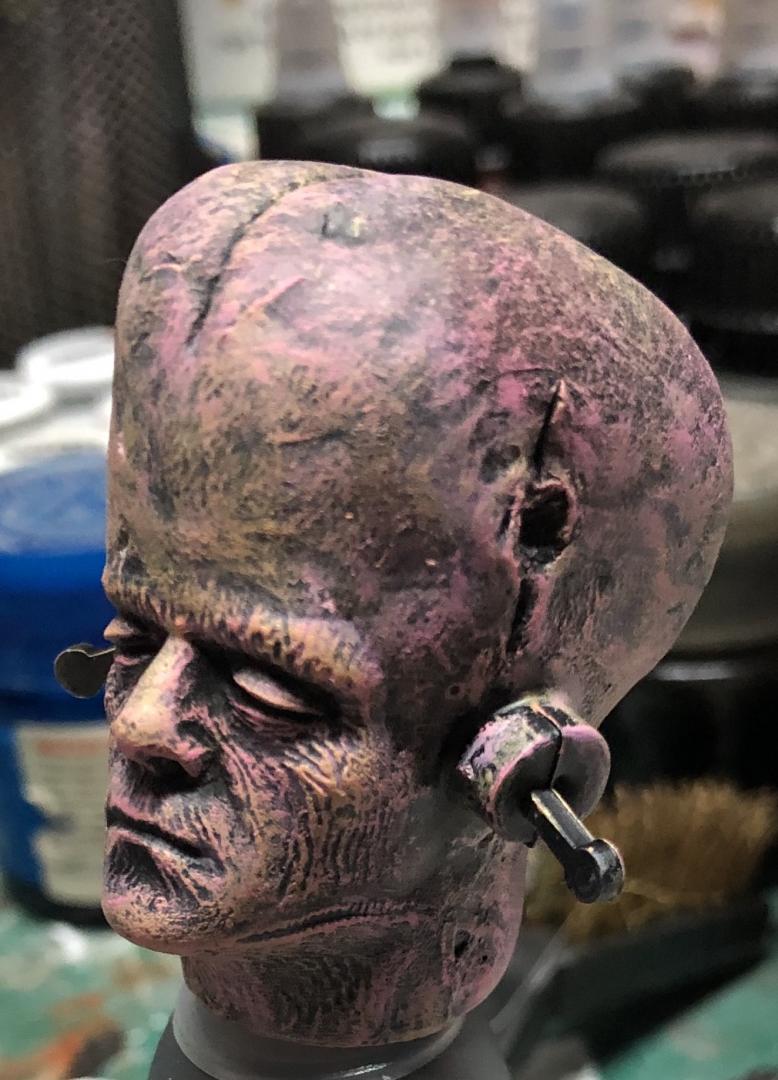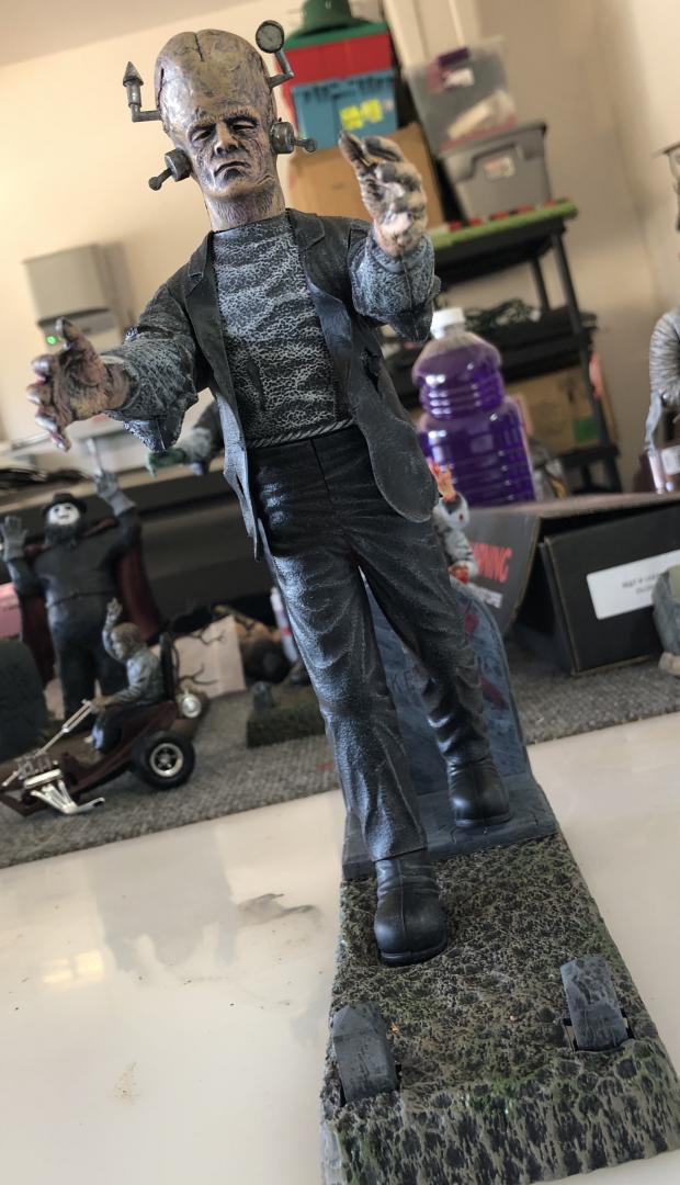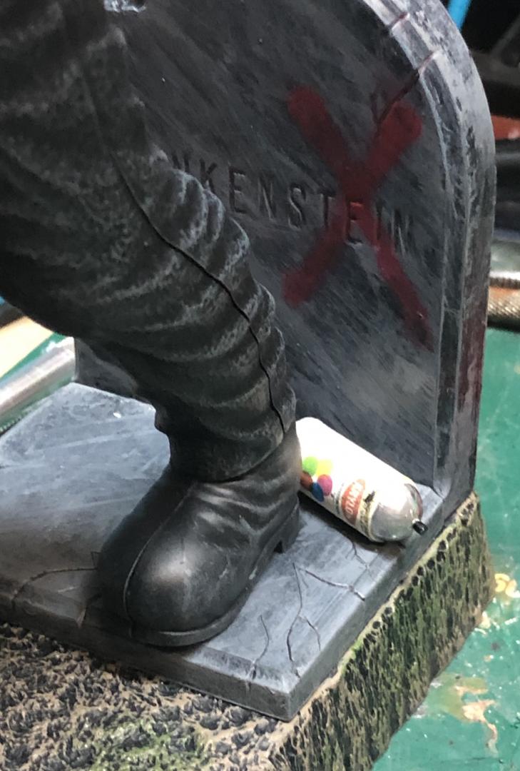 Used a Monogram Luminators Frankenstein Kit for this one. At first I had imagined doing it in the same solid colors as those on the cereal box, including the base and tombstone. I planned to have him holding an open cereal box, but since I went in this darker direction with him I will just have one lying around crushed somewhere. Anyway here are some shots of the clay work, painting and placement of parts.