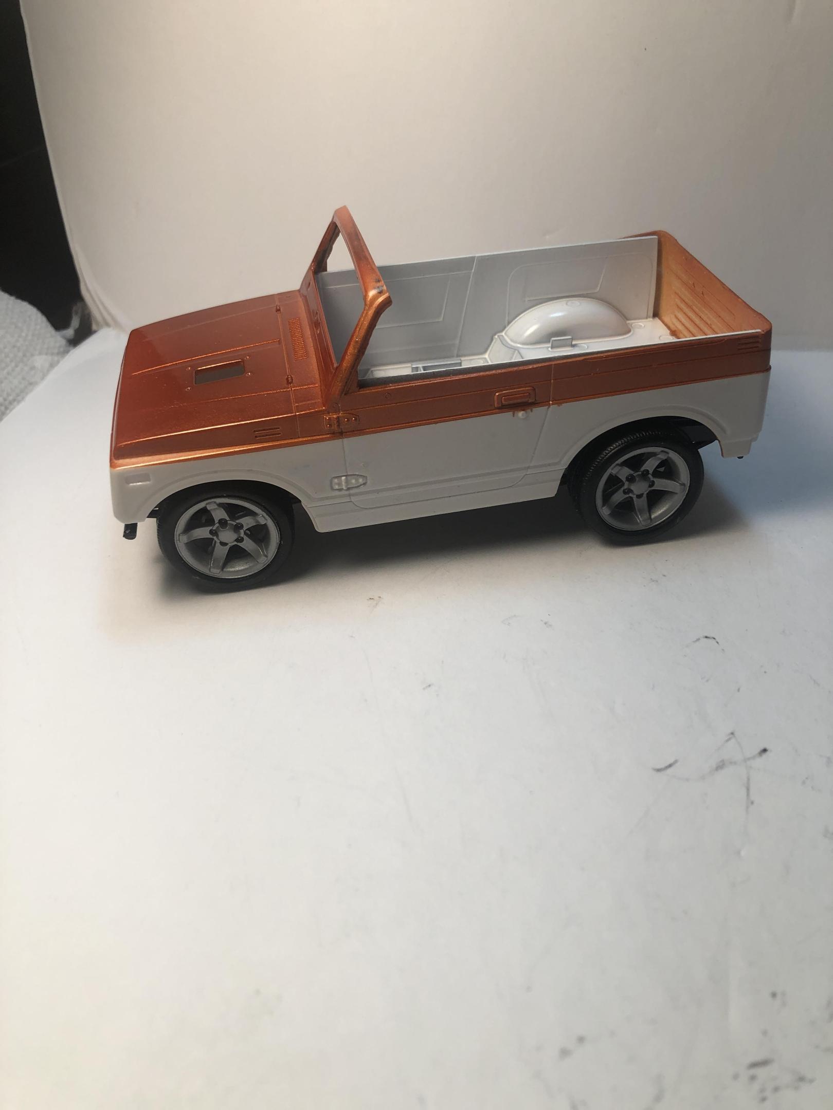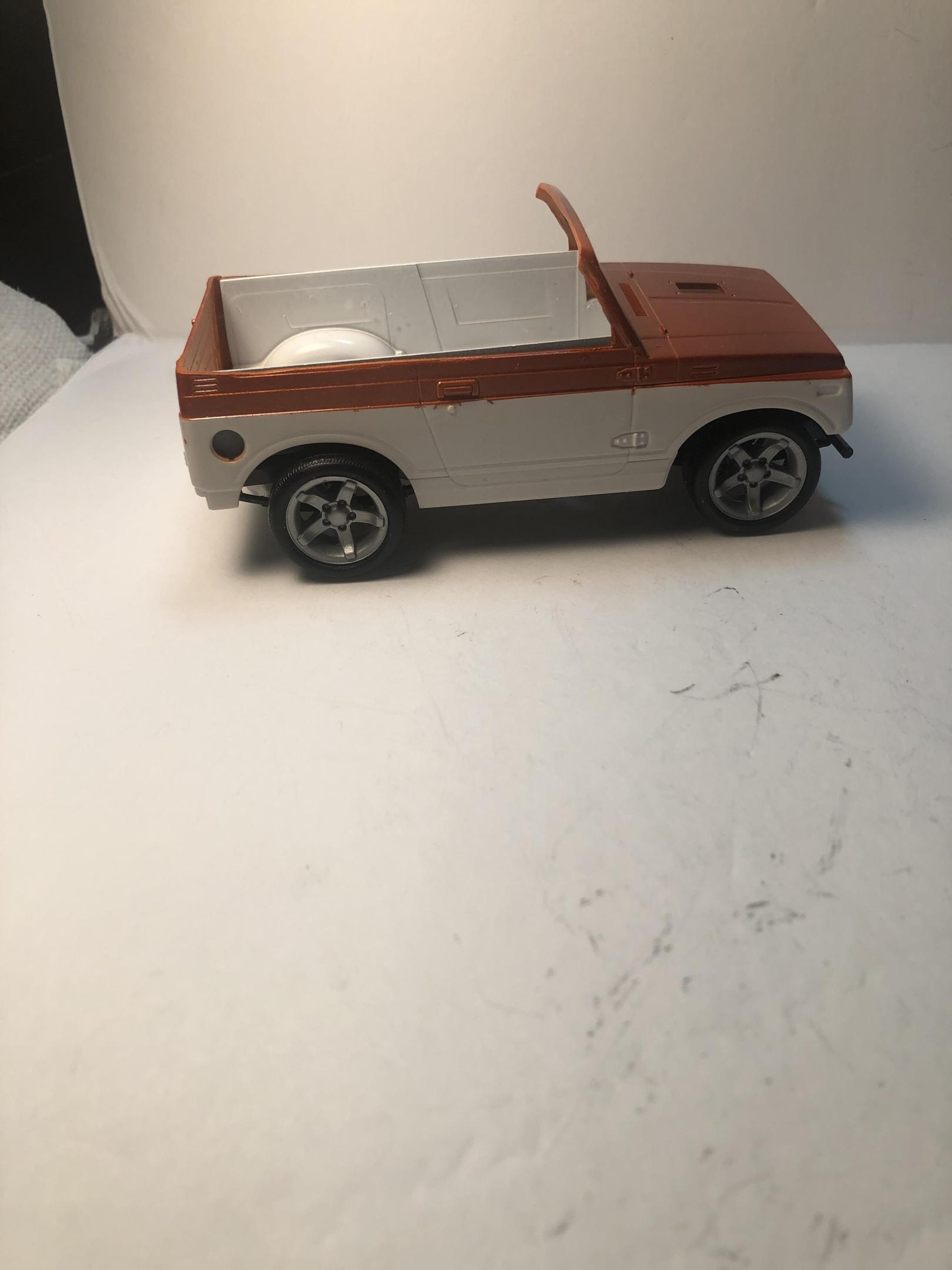 Worked on this little thing . I got a little happy in chopping the top and I did too much and didn’t like it so now is a convertible ! Tamiya Metallic Orange on top only white primer on the lower part for now . I like that look but I am thinking what could be a good lower color . -