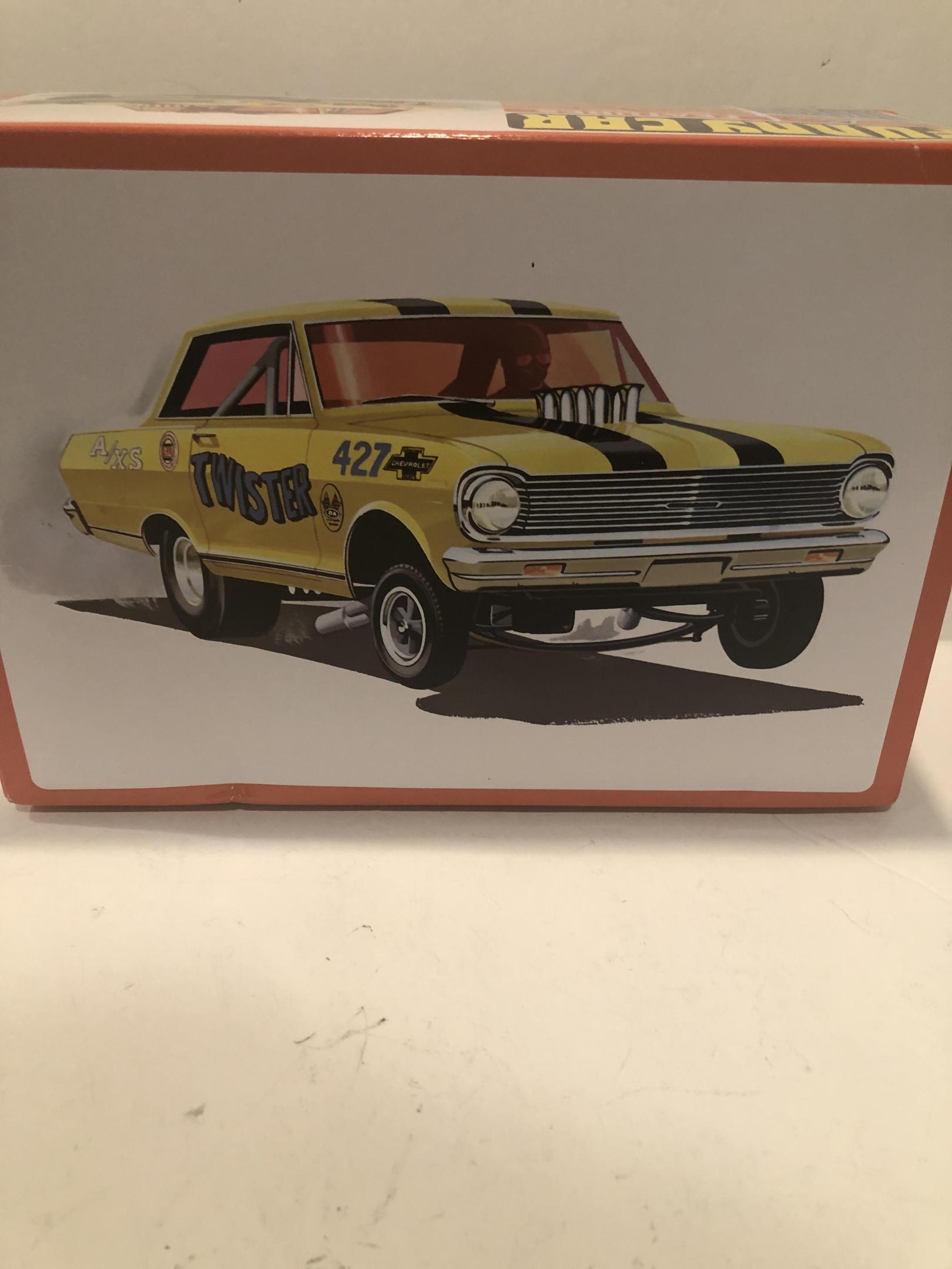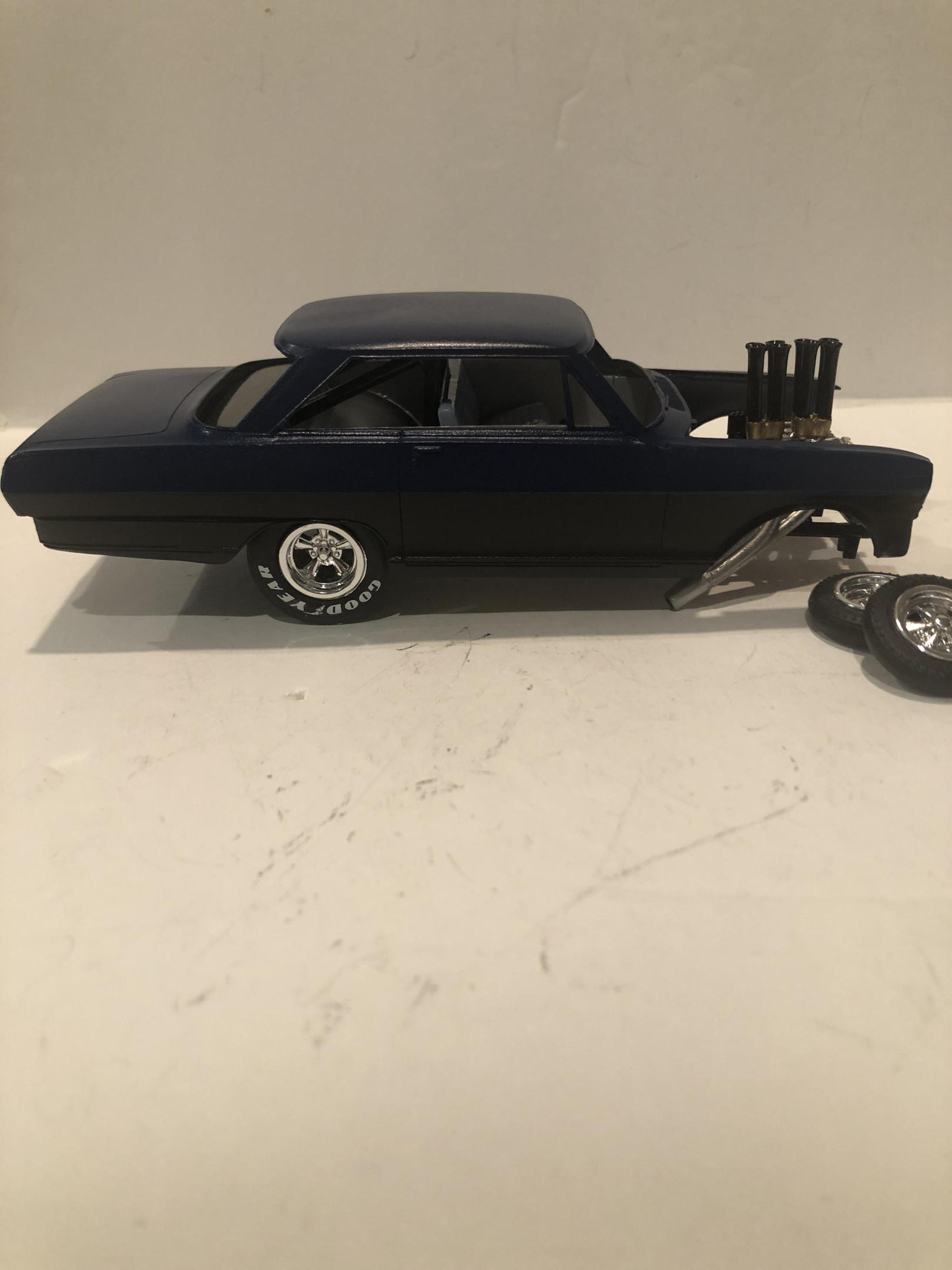 Lowered a bit . Painted Tamiya black on the lower section and Tamiya Blue on the upper section . Cleared with Duplicolor 1K clear . Hate the tiny bucket seats that come in these kits and replaced it with a bench seat . Aftermarket decals were used . I screwed up the rear window and I was doing so well . ?