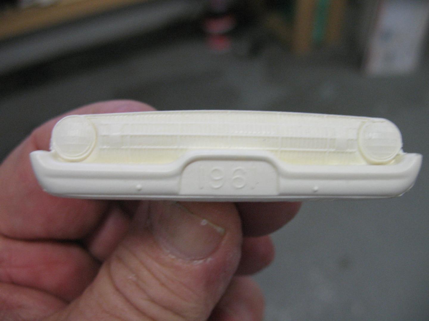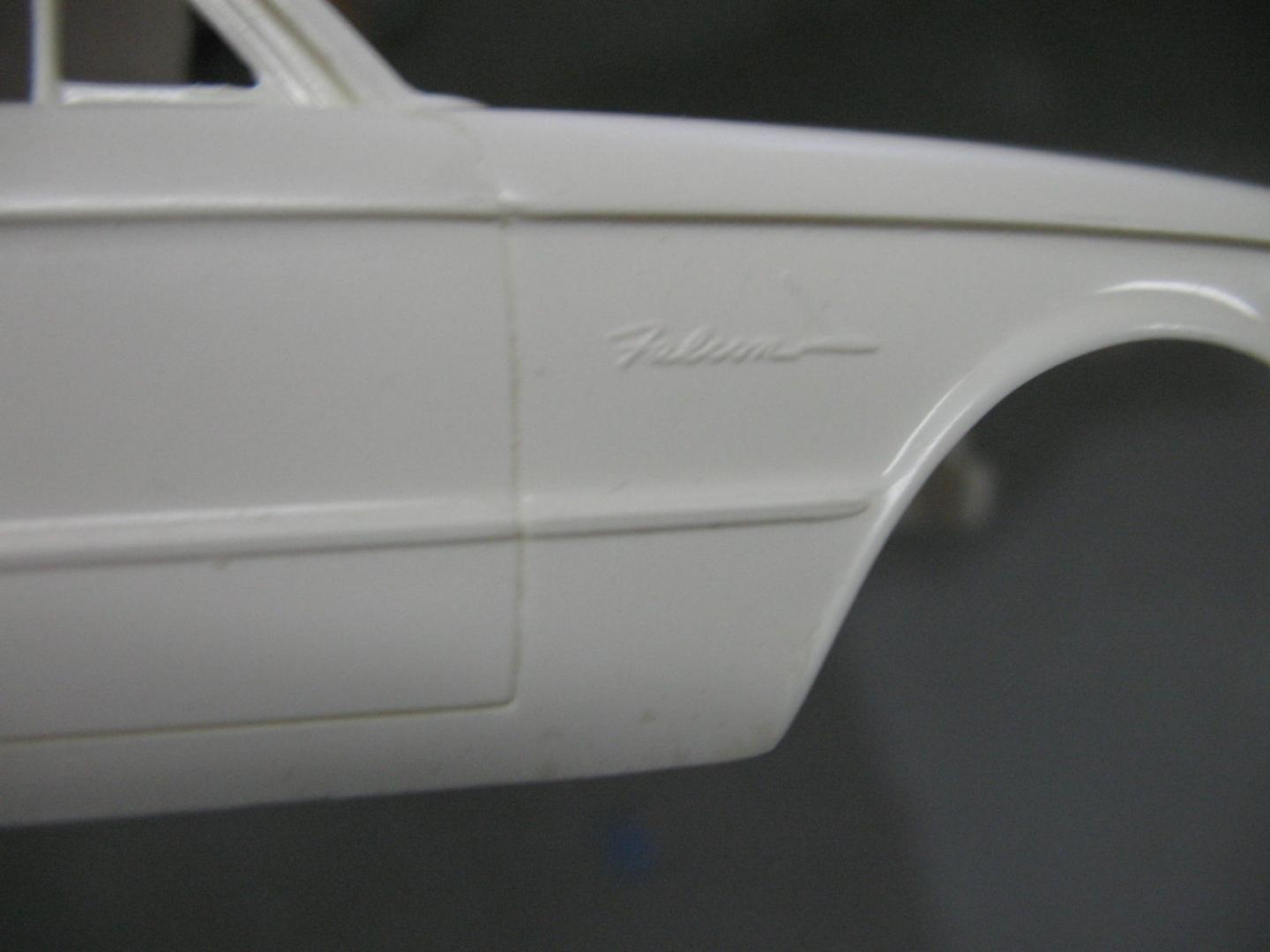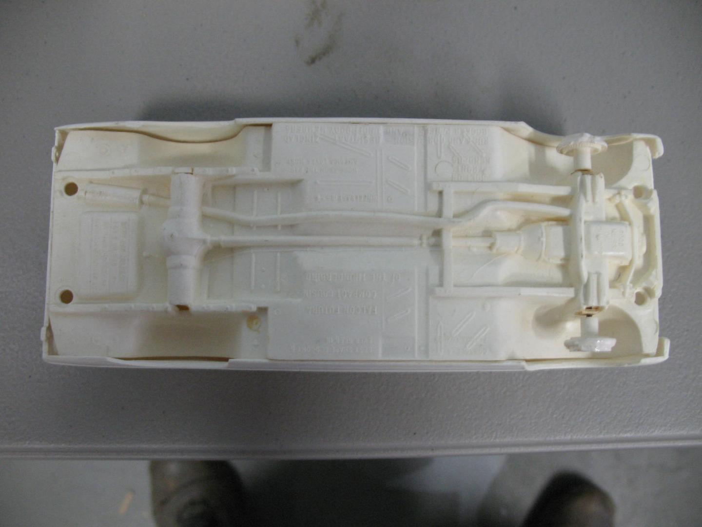 At a local flea market recently, a vendor had 2 promos for sale: AMT '60 Ford, in a nice white-over-blue factory paint job, and a white Jo-Han '58 Cadillac. They were filthy, cracked/broken, missing wheels/other parts, and warped. The poor '60 Ford looked like a banana. I was checking them out, trying to decide if they were worth haggling over just for the remaining chrome and interior parts. The vendor said: "Real promos! $50 each! They go for over $75 on eBay!" Uhhh...not in that condition, they don't. At that starting price, I wasn't even willing to try and haggle with him. You can also find a lot of UN-real promos on eBay: glue-bomb kits with all the custom parts and decals stuck on them, advertised as "promos." That usually seems to be done out of ignorance more than dishonesty. Vendors who don't know much about models probably take a quick look thru eBay Completed Items, see something that looks sort of like their kit, and think: "Promo! Ka-Ching!" Here's an early AMT Falcon chassis with the writing on it mentioned earlier. The same chassis with advertising was used for the promos and kits. I think AMT only did that in 1962, but I'm not sure: -