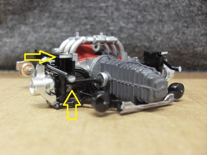 12. I just wanted to give you guys an update on this..... I managed to get the engine assembly to fit into the engine bay! It took some trimming at a few places. First, I had to trim up in the wheel well some (area in yellow circle)..... Then some trimming was needed at the ends of the stabilizer and the front edge of the shock tower.... (yellow arrows) I'll touch those up, and the whole assembly should relax into the engine bay...... The only damage during the test fit was that I broke off one of the tabs that supports the engine in the bay. Gotta figure out how to repair that...... Anywhoo, that's the progress for now! Thanks for looking, and feel free to comment....