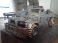 I thought I was done with the Widow Maker, but I realized, it didn't look right, so I added chains. As you can see I added some chains that act as an emergency hood latch, connected to the big front ram, as well as a chain that would possibly be able to move land mindes if necassary. As well as a chain holding the service door ( was the passenger side door till the cannon got installed) for the cannon shut. as well as a chain holding the damaged side of the tail gate shut. and last but not least, a chain winch, to rip useful parts off of dead hulks of cars and trucks. -