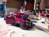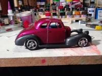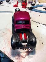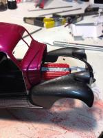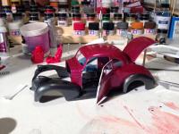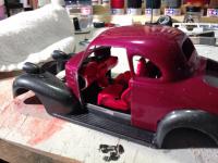 Well, I built the Enzo and was less than satisfied with it and then on one of the last steps... I broke the entire rear end of it. The car sat as I thought about ordering parts from Revell to rebuild it but I just didn't like the job I did on the car at all. One day I got the idea to use the Enzo engine in another car and started looking around the kit stash. Enter the 39 Chevy Coupe....... The first order of business was to decide what to do with the Enzo engine/trans I decided to separate the engine block from the transmission to create a front engine rear transaxle set up. How to mount the transmission in the rear of the car was another problem. I solved this by cutting the rear end apart and attaching the transmission where the differential was. It actually looks like it might work out. As if all these modifications weren't difficult enough, for my limited skill set, I decided to use the Enzo wheels and tires which required me to cut the floor pan of the trunk and build tubs, a first for me... And then just to cause the rest of my hair to turn grey... Why not open the trunk and doors AND reverse the doors to open suicide style? Sounds like a lot of fun... This may or may not end up being the color scheme of the car. I have been toying with flat or matte black or grey leaving it as a "work in progress" Any comment or questions are greatly appreciated.