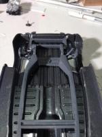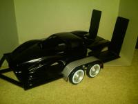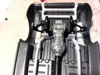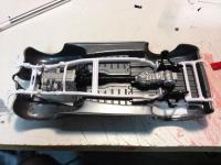 Went back to the drawing board after the quick eyes of Bill pointed out the transaxle deficiencies. I looked at building a box from the frame around the transaxle and other possible solutions before coming up with this. I cut the frame apart and then cut the rear suspension and transaxle out of a ZR-1 and factioned them together in a, somewhat, believable manor. My eye keeps being drawn to the front of the rear suspension where the frame comes into it. I think I will be attempting to make that look more believable somehow. Anyway I did a test fit of the drivetrain last night and everything lines up fairly well. And just for fun I put the body on to check out what the engine will look like under the hood. I think it looks pretty cool in there. It's going to be a hair puller to figure out the exhaust, it will need to be completely custom and this engine has 12 cylinders to deal with! The other issue will be the intake. I'm thinking of routing the intakes to the front grill area but I will have to wait until I get further in the process to figure that out. Until then back to the drivetrain...