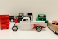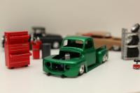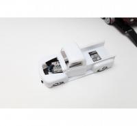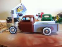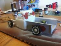 Hey guys! Well time to do some updating! Love this new hobby. Cant believe it takes so much time! On to the pics: I was going to swap the motor, but since this is my first build, and I dont have extra parts nor have I gone to buy new parts I figured Id build the stock 265 v8 it comes with... i know down the road Ill swap a big block in there or a ls1 I also dont have any cool wheels or anything so for the mean time Im going to lower the truck on the stock wheels :/ Here's a pic of the cab. I put the rearview mirror in, and mounted the radiator, headlights and parking lights. With the interior I decided to paint the bench red. I think it looks good against the black. I might be wrong but I liked it. Dont mind the bed, it looks wrong but its just put together for mock up. Im working with lowering it right now.....