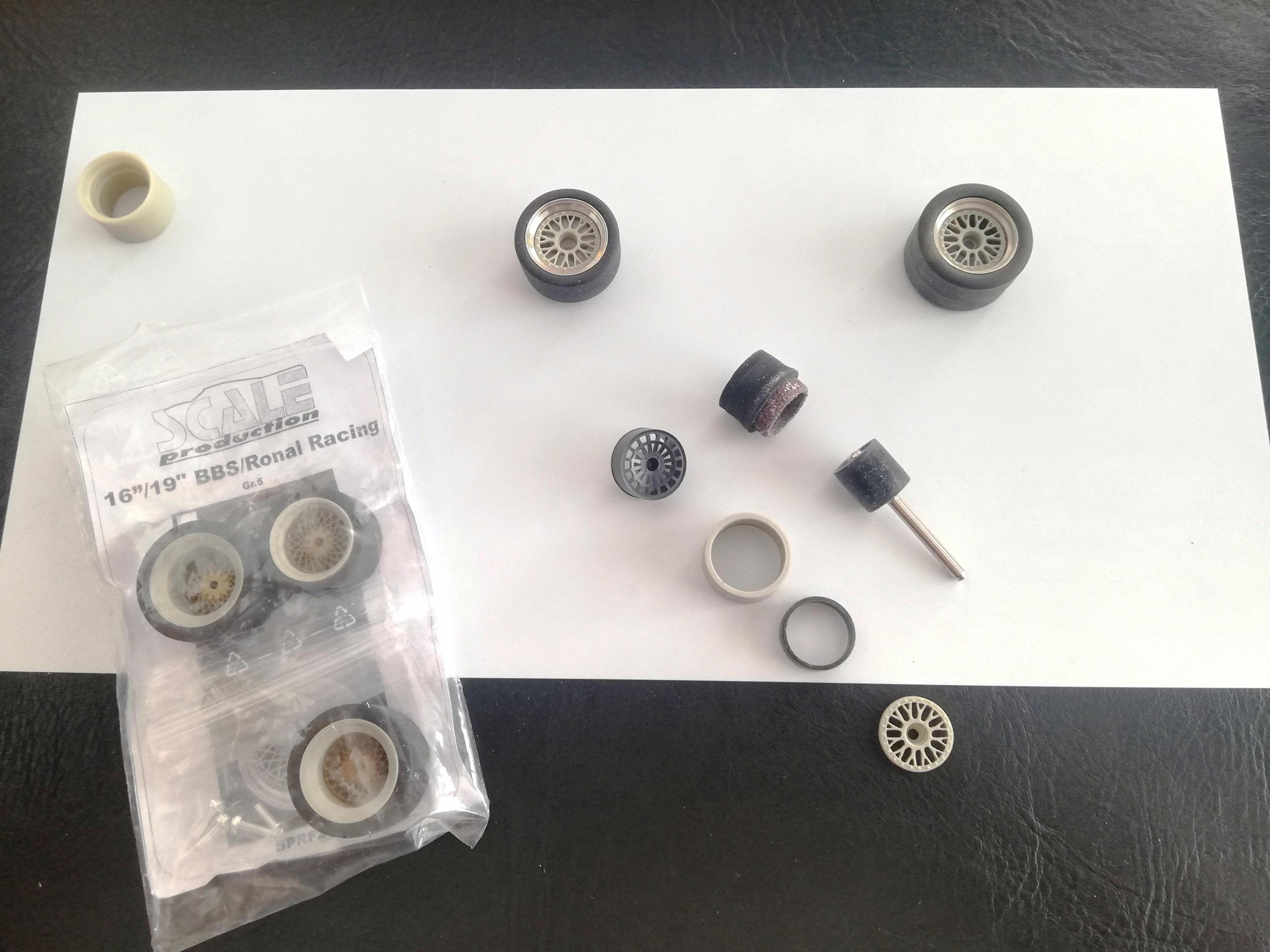 Thank you very much but, the only ones in all that list, that I thought would fit, are the Hobby Designs 16" (I suppose the ones I bought are 16" but lost the bag...), the ones in this site are 18", but, if the size of the ones I bought is ok, they are unfortunately all VERY DEEP and, besides, it is impossible to correct it as the multi nut rings are molded in the outer rim, and, being SO tinny, it would be impossible to remove these rings to bring it 2,5 mm out without destroying it all... I am absolutely sure the only way is the method I described before... the way I am doing it, is fixing one of these flanges with expanding rubber where we fix a sanding tube, where I did put a 1/32 slot car tire reaching the interior diameter of the BBS wheel, and securing it so I could "machine" it in my "motor tool" in order to separate the central part of the wheel from the rim; next, glued it to the inner tube, that was then inserted inside the wheel rim; The chromed outer rims where also modified: the front ones went to the rear wheels, and the wider ones (intended for the Dauer Rear wheels) where then cut to become a little slicker (about 1mm) than these that went to the rear wheels; This is the way how I managed to get what I thing the Le Mans 1994 RT-10 Vipers BBS wheels look like, as you can see in the images; now what I need is a Zero-paints ZP-1009 Fluorescent Orange and a scratch rear spoiler; and yes, a racing seat also; And then: building this fantastic beast that, in it's maiden race, achieved "the" 12th place!... -