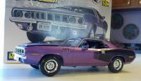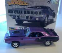 This is the Revell '71 Hemi 'Cuda kit. I originally used Wicked Colors Pearl Plumb paint but my airbush kept spitting and sputtering and totally ruined the paint job. I finally got pissed and smashed the body into shards of plastic shrapnel. After a few days, I cooled off and bought another kit and used Createx Pearl Plumb, which went on very nicely. The paint job turned out really well, although you can't tell it by my phone camera. I did mess up the windshield when I used a towel with glue on it to wipe the windshield off. Ooops. I didn't think at the time to use the windshield from the spare kit. But I can always go back and put the new one in. Overall the kit itself was really fun to put together with fewer parts and no fitting issues at all. Thanks for looking.