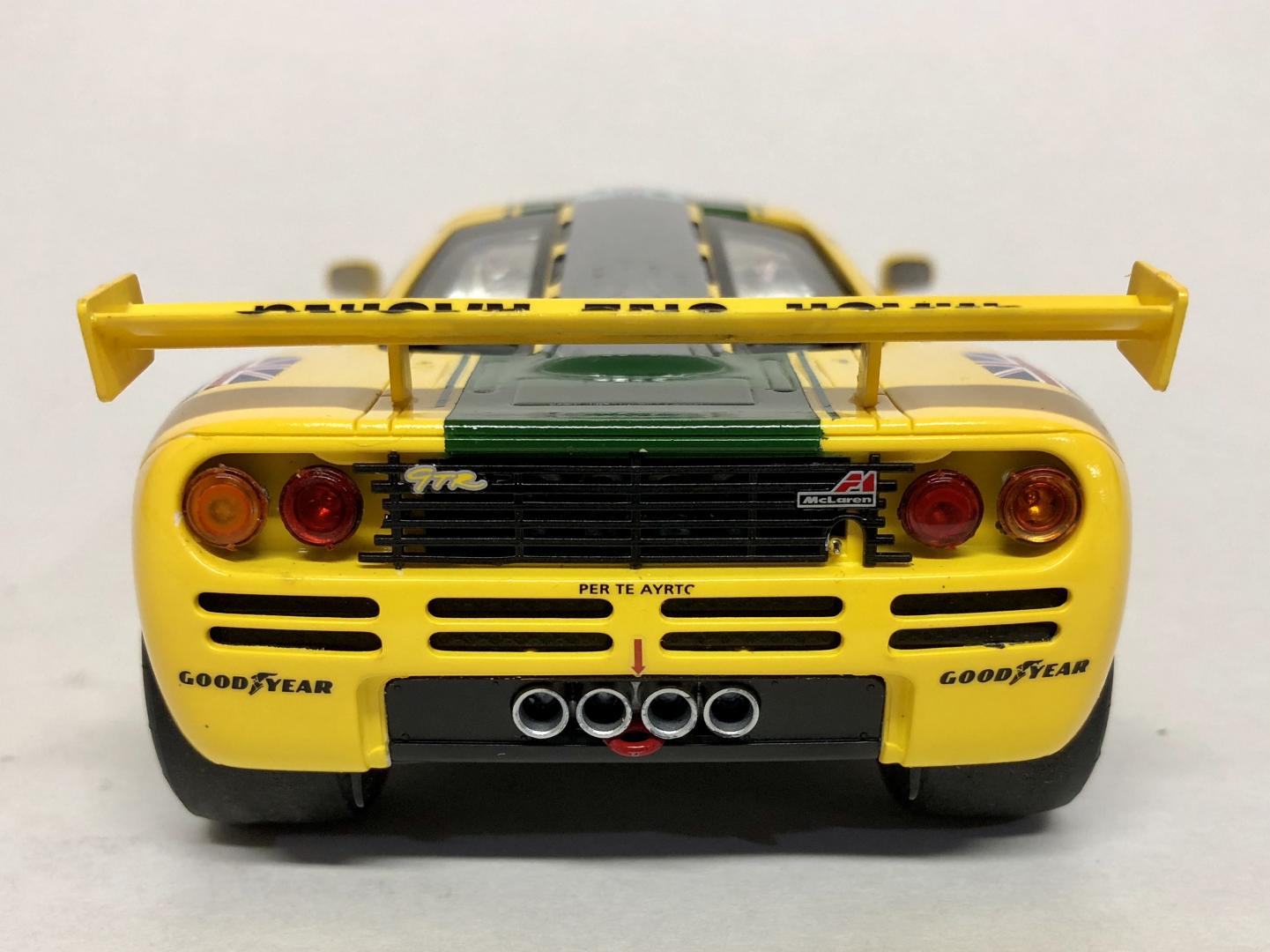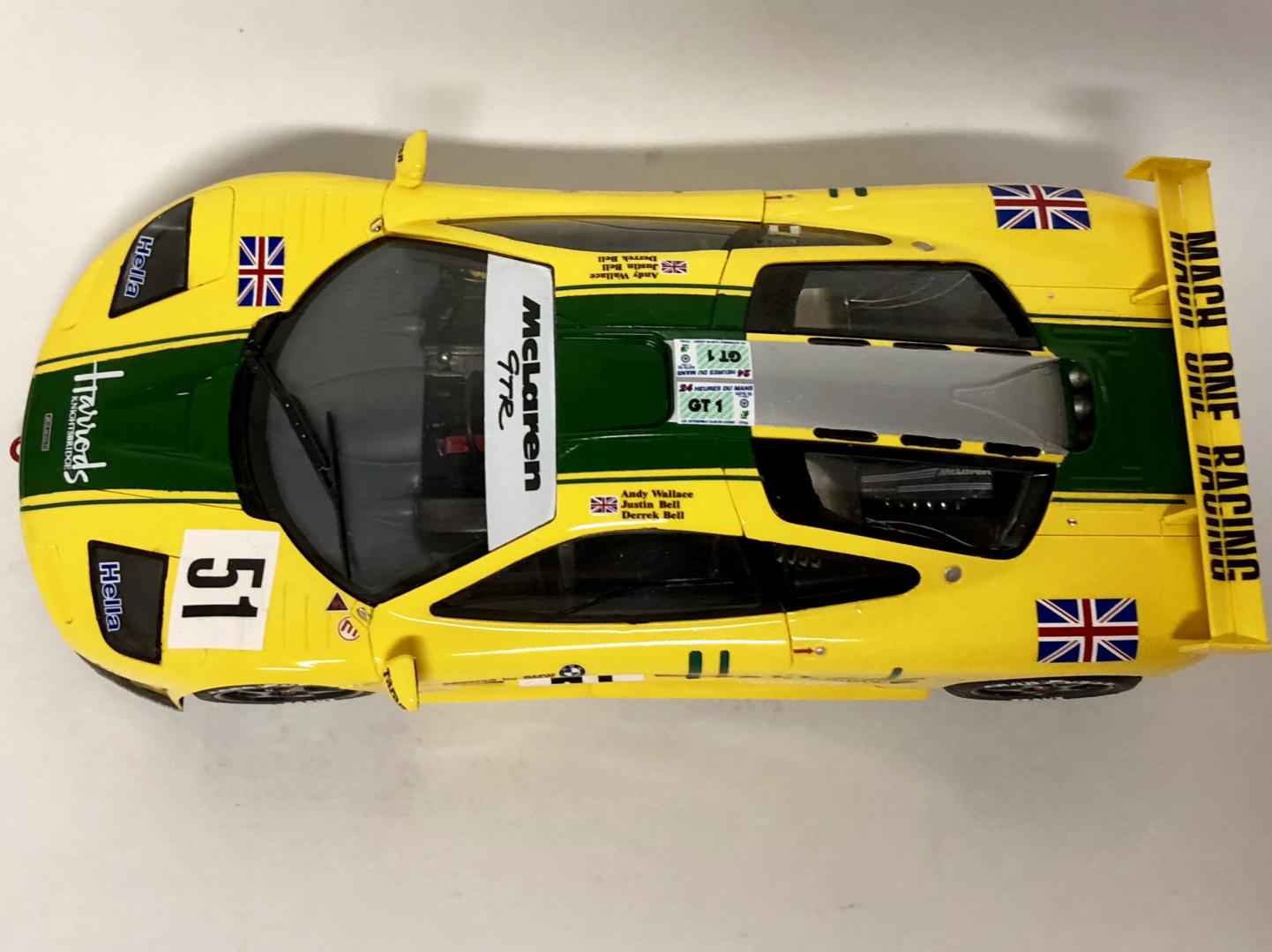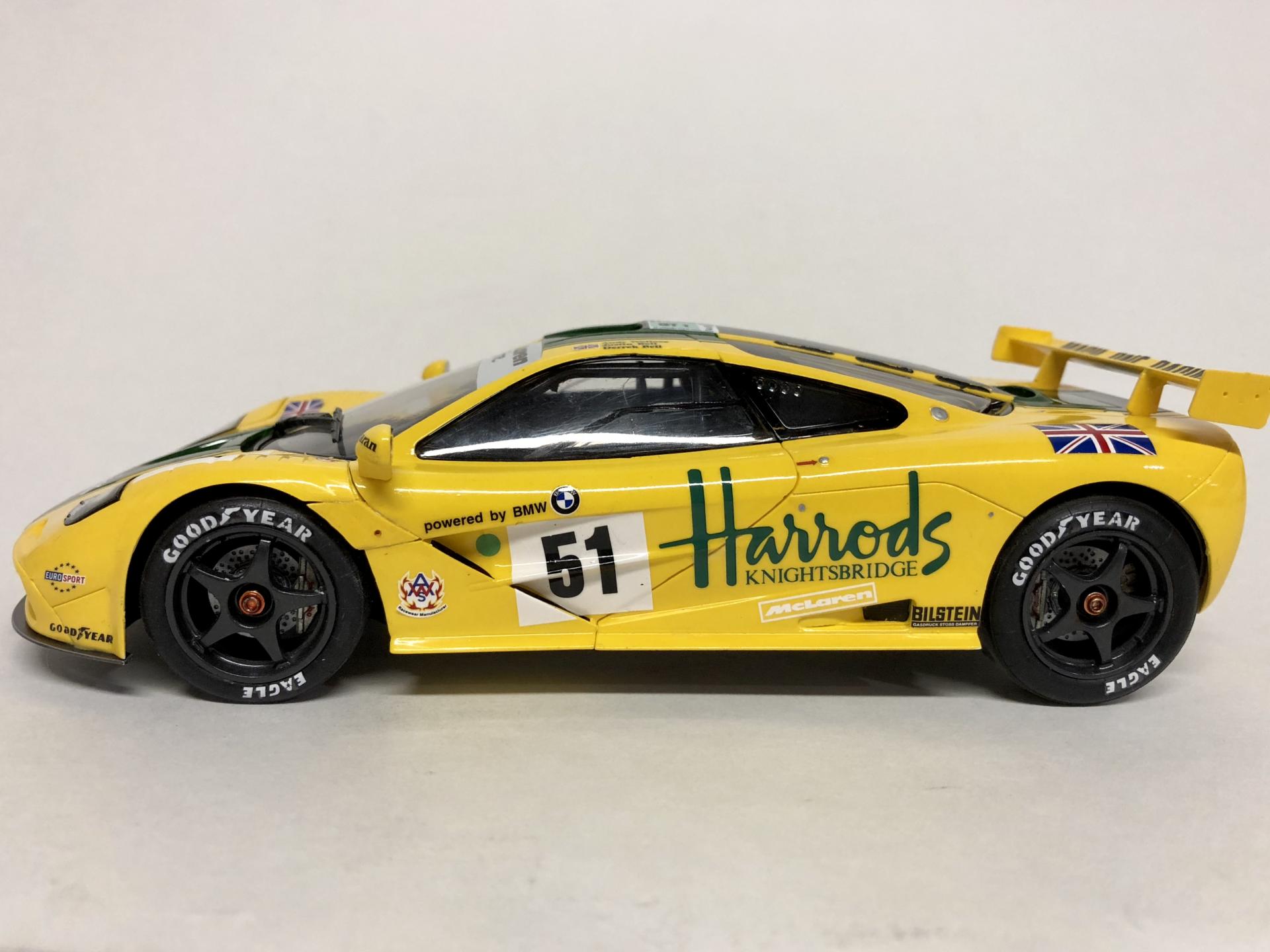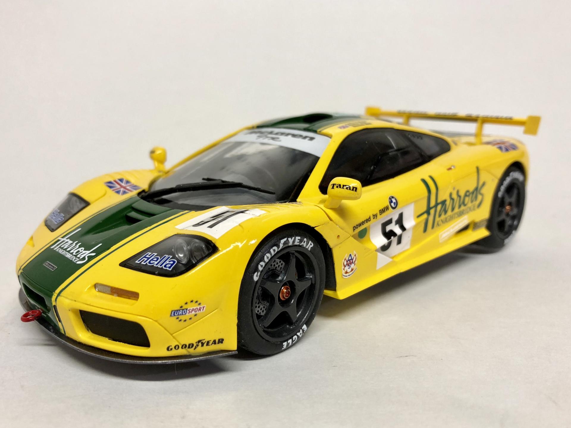 Just finished this one up this morning. This is the Harrod’s McLaren that finished 3rd at Le Mans in 1995. Built stock from the Fujimi kit with Tabu decals. Paint is Ferrari yellow from Scale Finishes and Tamiya Racing Green (TS-43).