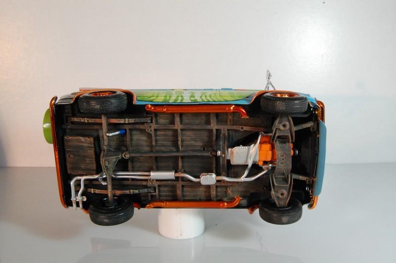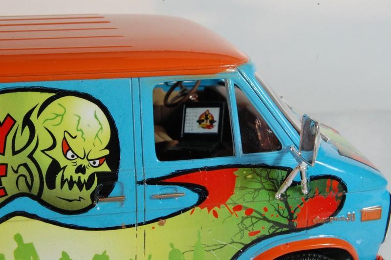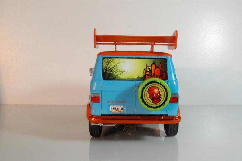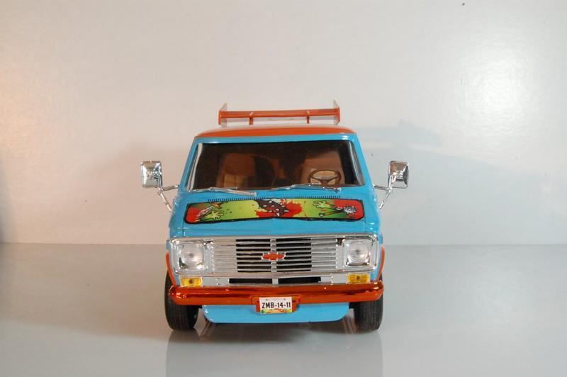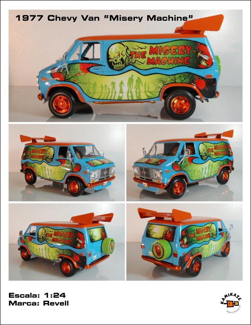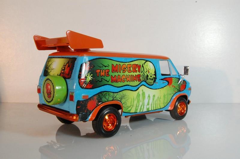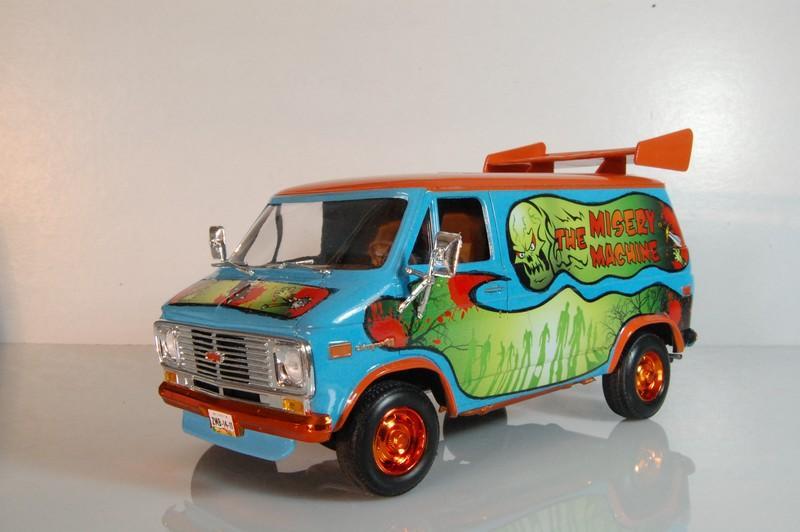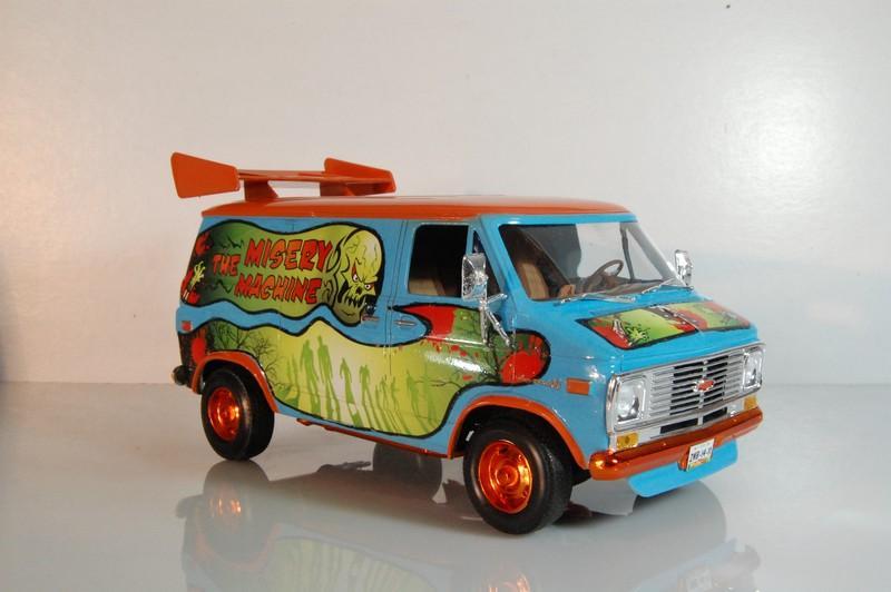 77’ Chevy van “The Misery Machine” My latest finish model, an extreme over the top version of the famous “Mystery Machine” from Scooby Doo, but you might notice the differences. Graphics designed by me, paint is very acrylic, the blue is Gunze H323 light blue, the orange is Model Master Boyd Sublime mango an is cover with several layers of Vallejo transparent and Tamiya X22, yes the final coat is X22, also some alclad candy orange on the tire rims and bumpers. The spoiler is from a cheap toy car over some spare plane missile pylons. Also from the spare box came a laptop to look for information about the creatures of the night. Misery Machine… I feel appropriate for the joke and even more appropriated to hunt zombies and other creatures of the darkness. Enjoy and Comment.