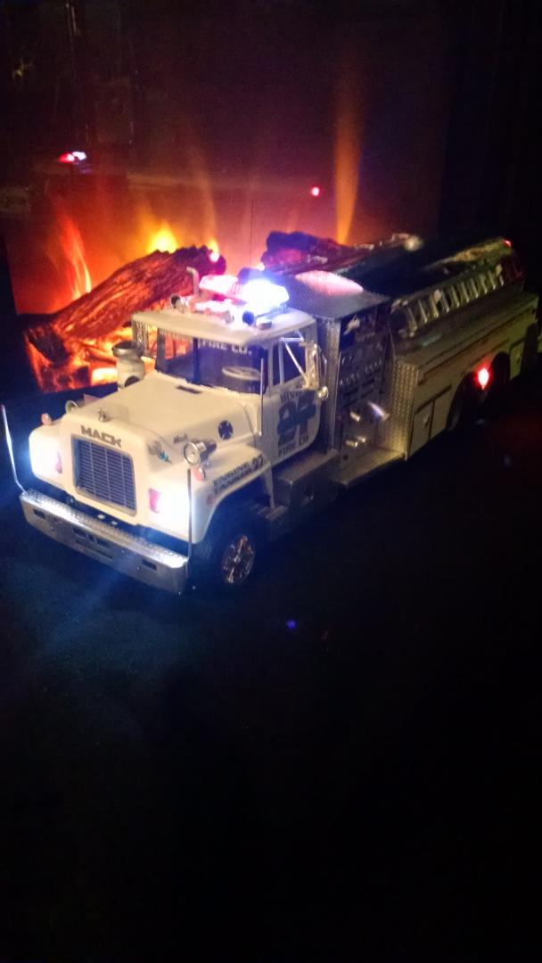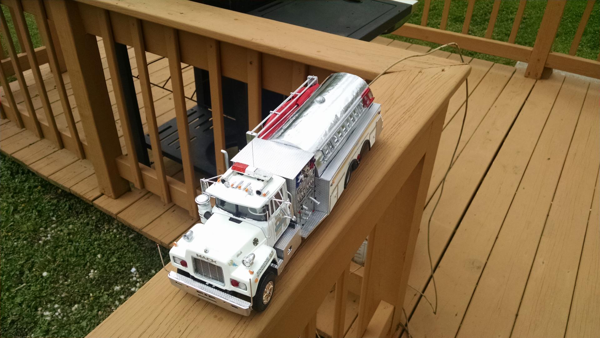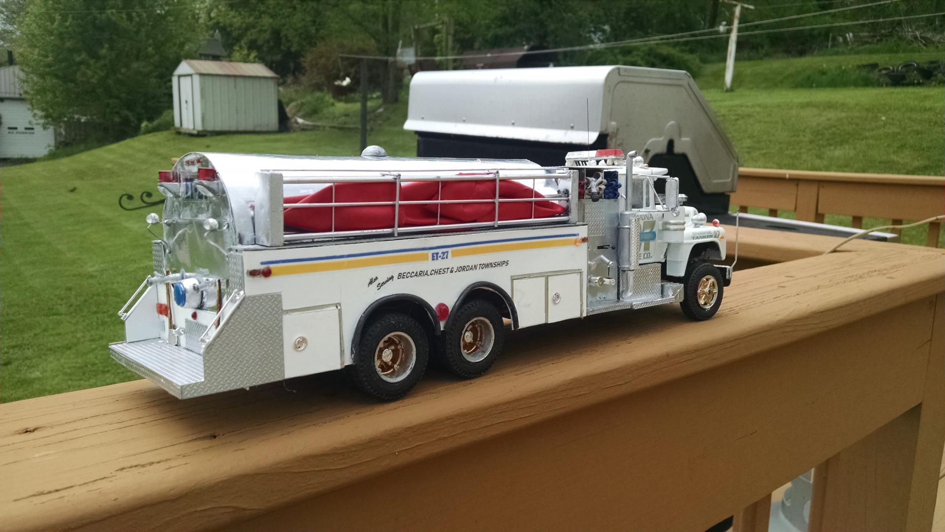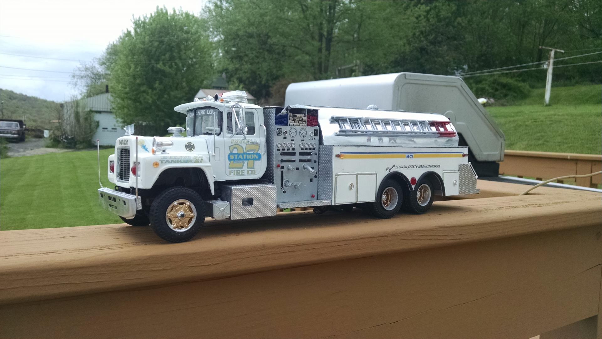 Took 7 months to complete, but finally done.. Started with the Mack R685st kit. The tank bed and pretty much everything else was scratch built. Want to thank Charles(Chariots of fire) for the idea to make the elliptical tank. And to Jeff Bulmer(go nitro) for sending me the chrome tree from the Trumpeter LaFrance kit, when all I needed was the federal Q. The first pic is of our actual truck. That pic was after we received it, so the red wheels were soon painted gold to match our colors..
