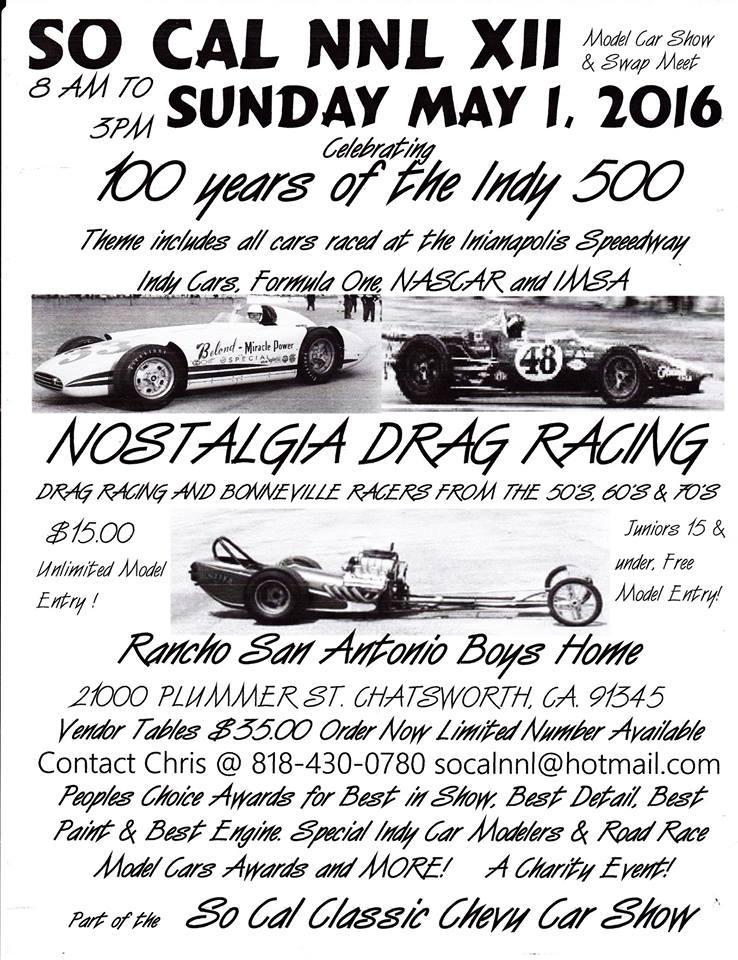 The annual SO CAL NNL , a charity event, will be held on May 1. 2016 at the Rancho San Antonio Boys Home in Chatsworth, Ca. The SO CAL NNL XII will feature themes of 100th Indy 500 , all cars raced at the IMS track, and Nostalgia Drag Racers, Drag cars and Bonneville cars from the 50's, 60's and 70's. The show is part of the So Cal Classic Chevrolet Car show with over 200 Classic cars on display outside. The Rancho San Antonio Boys Home will have it's annual Open House with a Great BBQ, activities for the entire family and much more. The NNL will have many Vendors, Peoples Choice voting on all models. and a big Raffle. Spectators are Free , Model entry is $15.00 for Unlimited models, Juniors, 15 and under entries are Free. All proceeds benefit our host, the Rancho San Antonio Boys Home. Vendors see the flyer for additional info. Dont Miss This Great Show!!!!