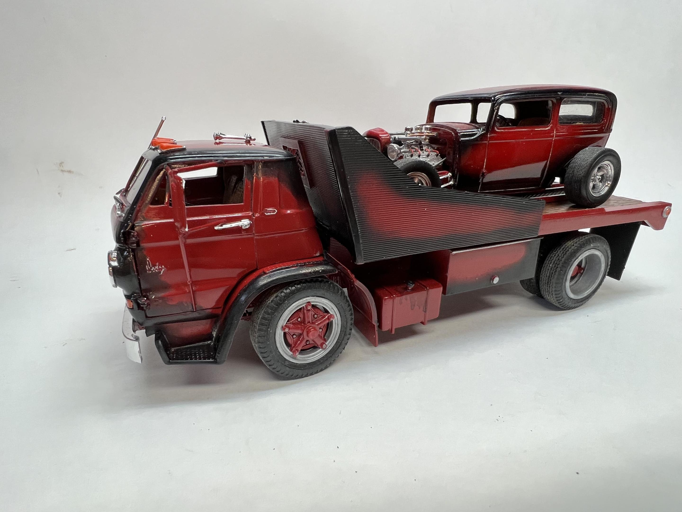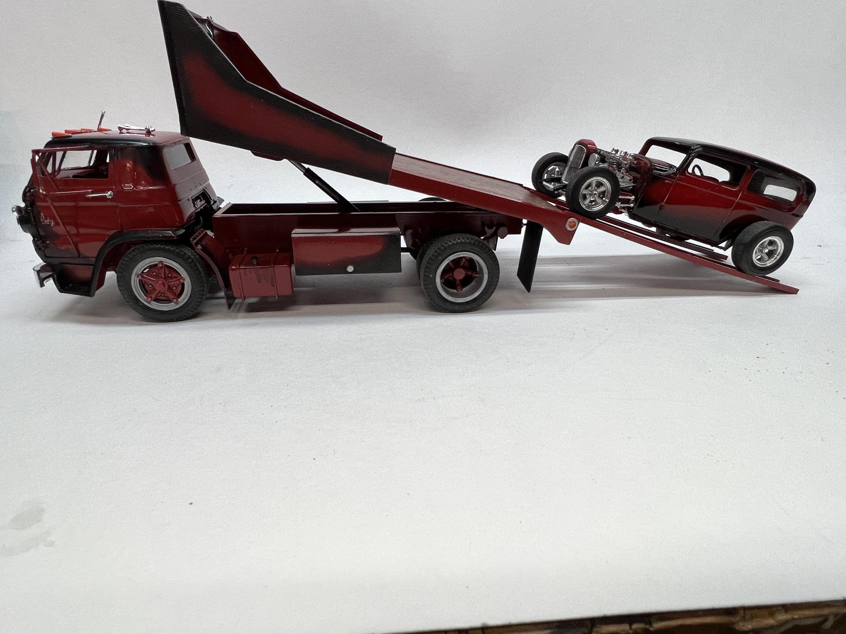We’ll, stick a fork in ‘er she’s done. She’s built from the Lindberg semi kit and one of the more miserable kits I have worked on. Anyway I still had a lot of fun. The top is chopped 3/16” which is about 4” 1:1. The flatbed is the trailer shortened and resting on a lengthened frame. A new front axel was made to lower the front end. As I was working on it I grabbed a 32 sedan from my shelf and liked the look so well I decided to make them a pair. If your interested in all the details the build is posted in the WIP section.