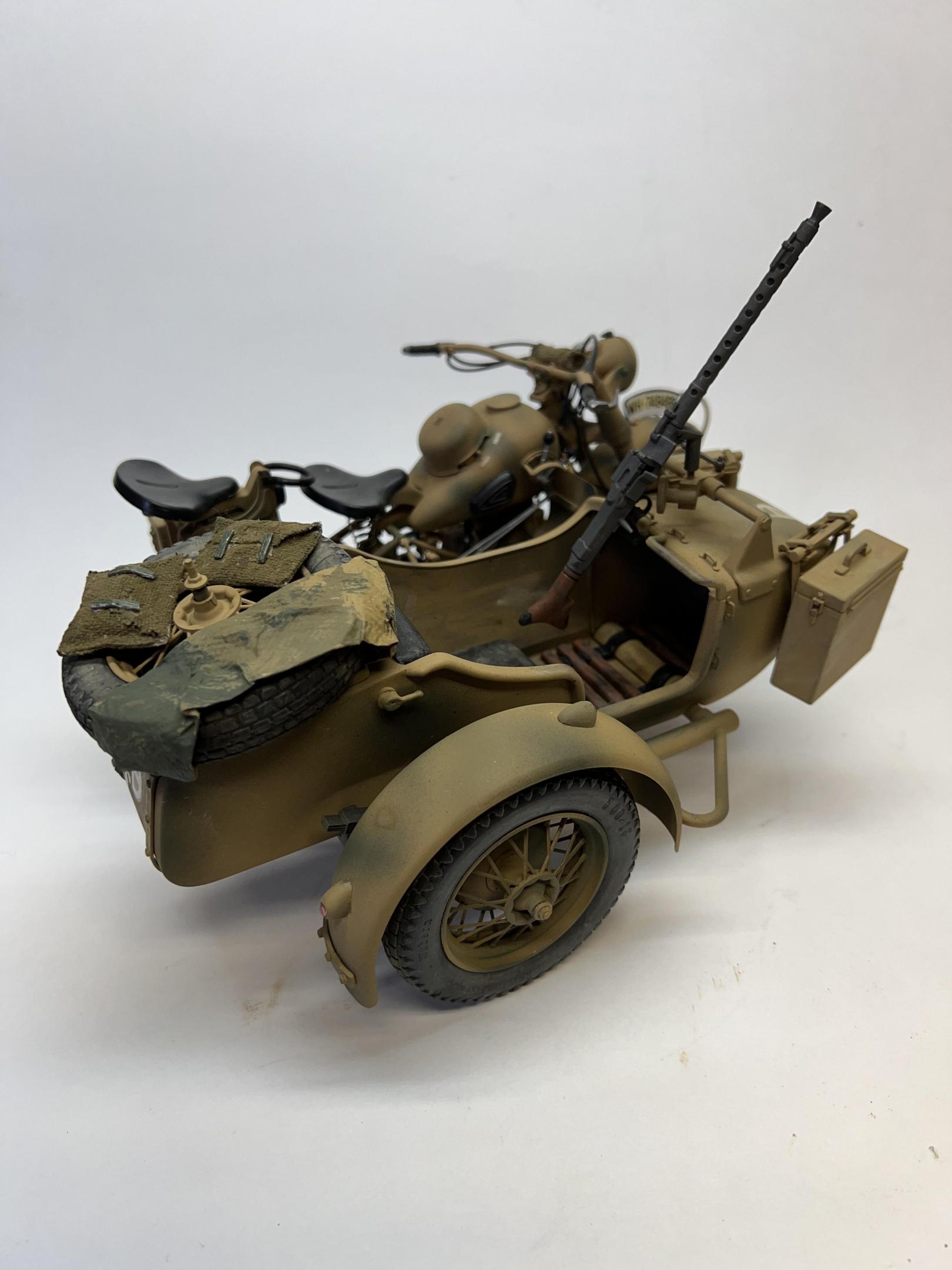 The rig is finally done. It’s the 1/9th ESCI kit. I’m not sure how old it is but the decals were showing their age. There has been some personnel gear added and some chalk to give a used look. About 17000 of these were produced and incorporated the classic BMW features, drive shaft and horizontally opposed cylinders. The car’s wheel could also be powered. With 3 possible occupants, the gun, amo, and any other gear a lot was asked of the 750 cc engine. This is the second time I’ve built this kit. Previously I redid one started by some one else and took it in a different direction.