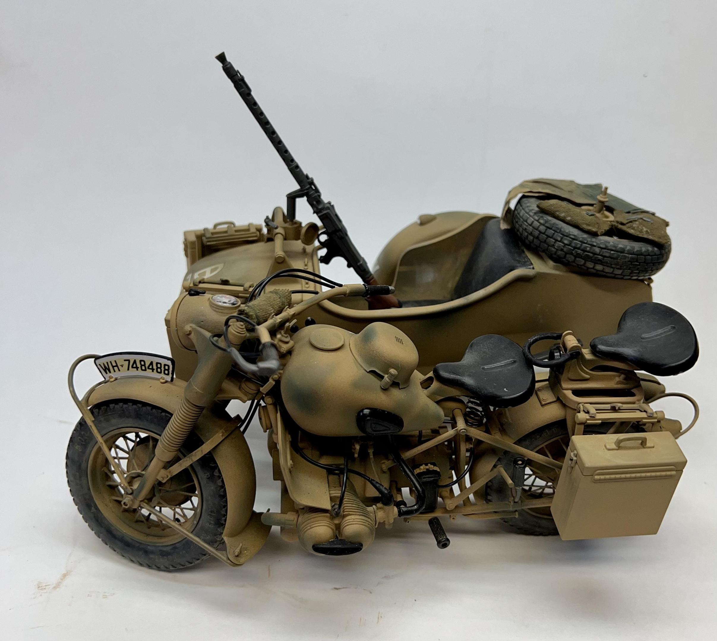 I was lucky enough to score two of this kit. One was started and had a few parts missing. That one I turned into a bobber and posted it some time ago. Now I’ve started the second one and will give it military livery for the desert campain. That is not a helmet on the fuel tank it’s the air intake positioned to avoid dust and such.