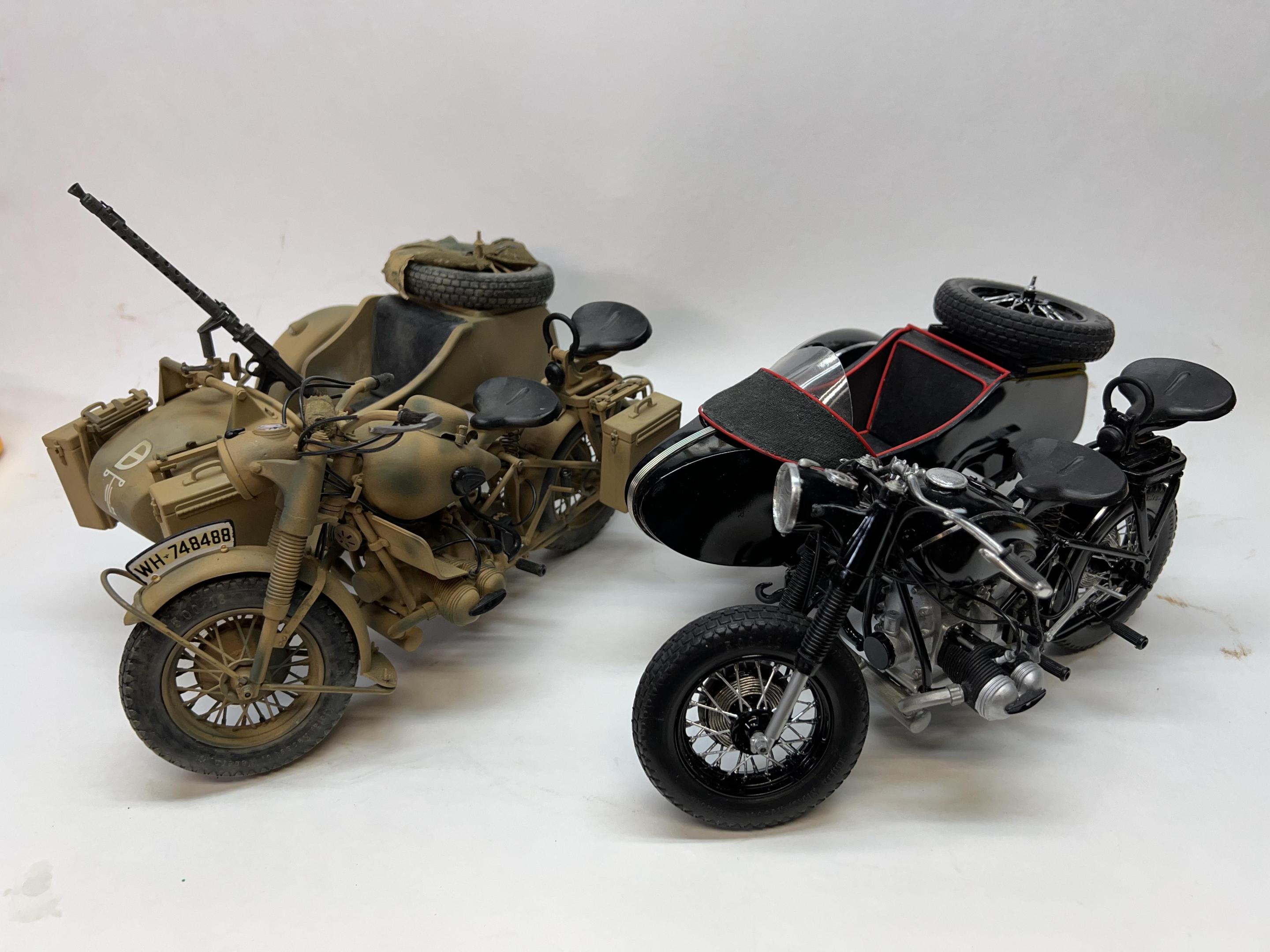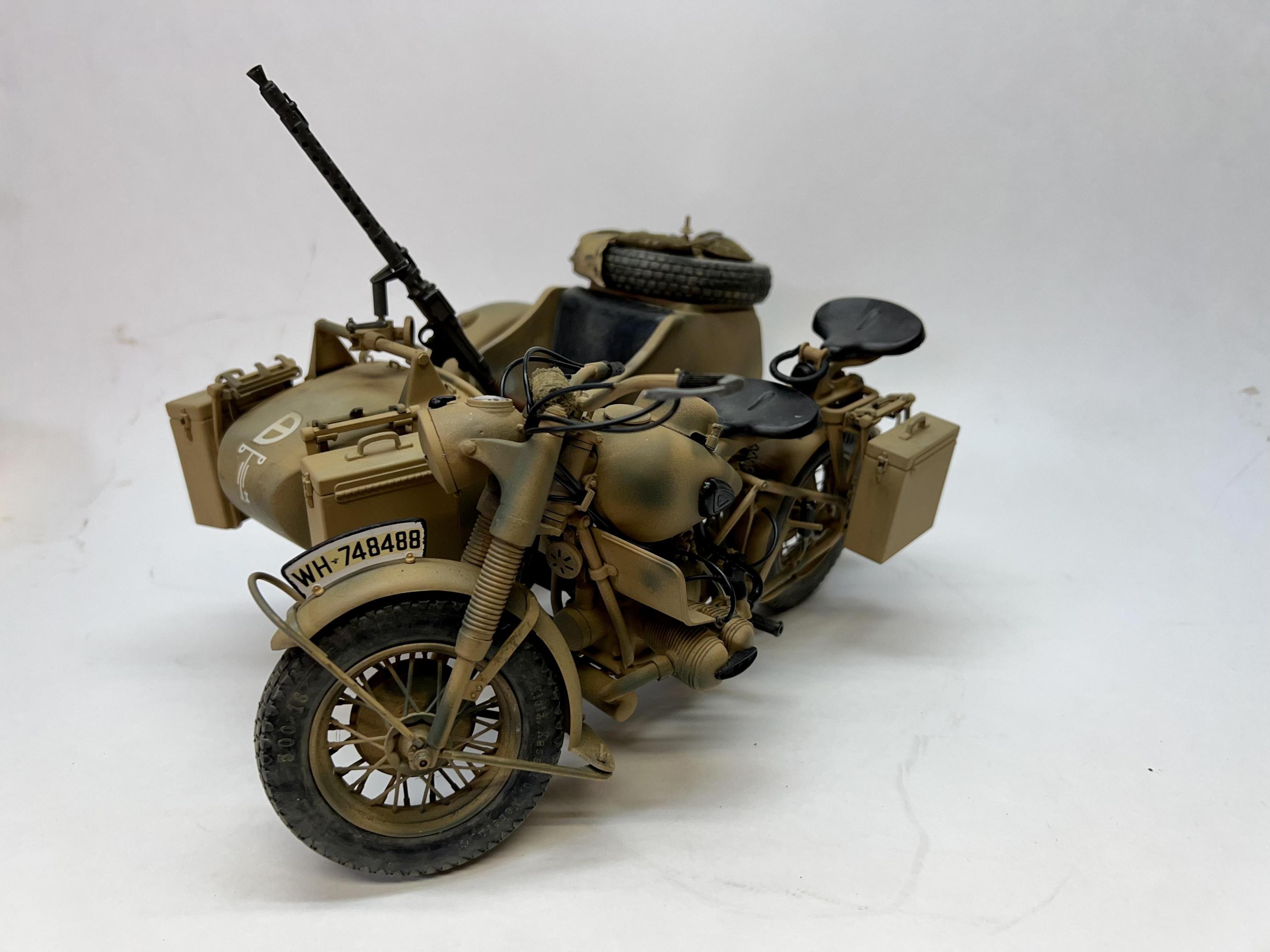 Thanks for the heads up about this thread TJ. A friend gave me 2 ESCI models of the iconic WWll BMW R75. One was started but had a few bits missing. So rather than do a military build I went more in the bobber direction. The kits are 1/9th scale so there is lots of opportunity for detail. To disassemble the started kit I used the wet then freeze technique with modest success. Thinking this might be the case I predrilled most of the contact points to receive a pin on assembly. Major body work was done to the front of the car and moderate changes on the bike. Now I’ve started the military version and this is the progress so far. Because of the size of the kit there are a few fun factors incorporated. The forks compress, the seats are sprung and of course the wheels go round and round. Anyway that’s the progress so far. -