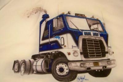Truck-Um-Up PostersMackvision replied to angelo7's topic in General Automotive Talk (Trucks and Cars) Gary Blizzard is a new England based artist specializing in old/movie/TV show trucks,he does some outstanding work,and has a line of t-shirts on Ebay,here's a sample of his "Blue Mule" WT-9000 Ford.......................................Mark