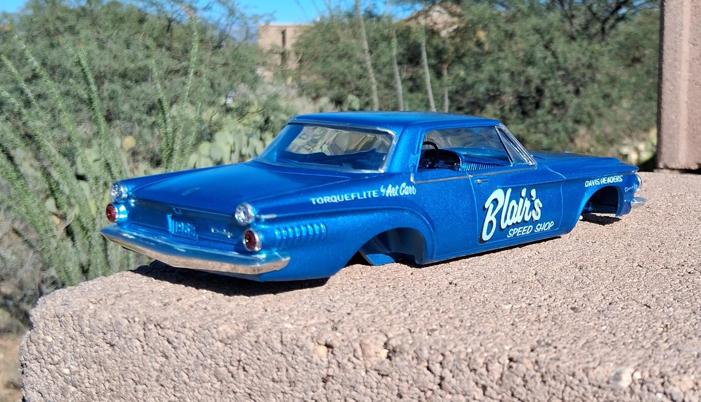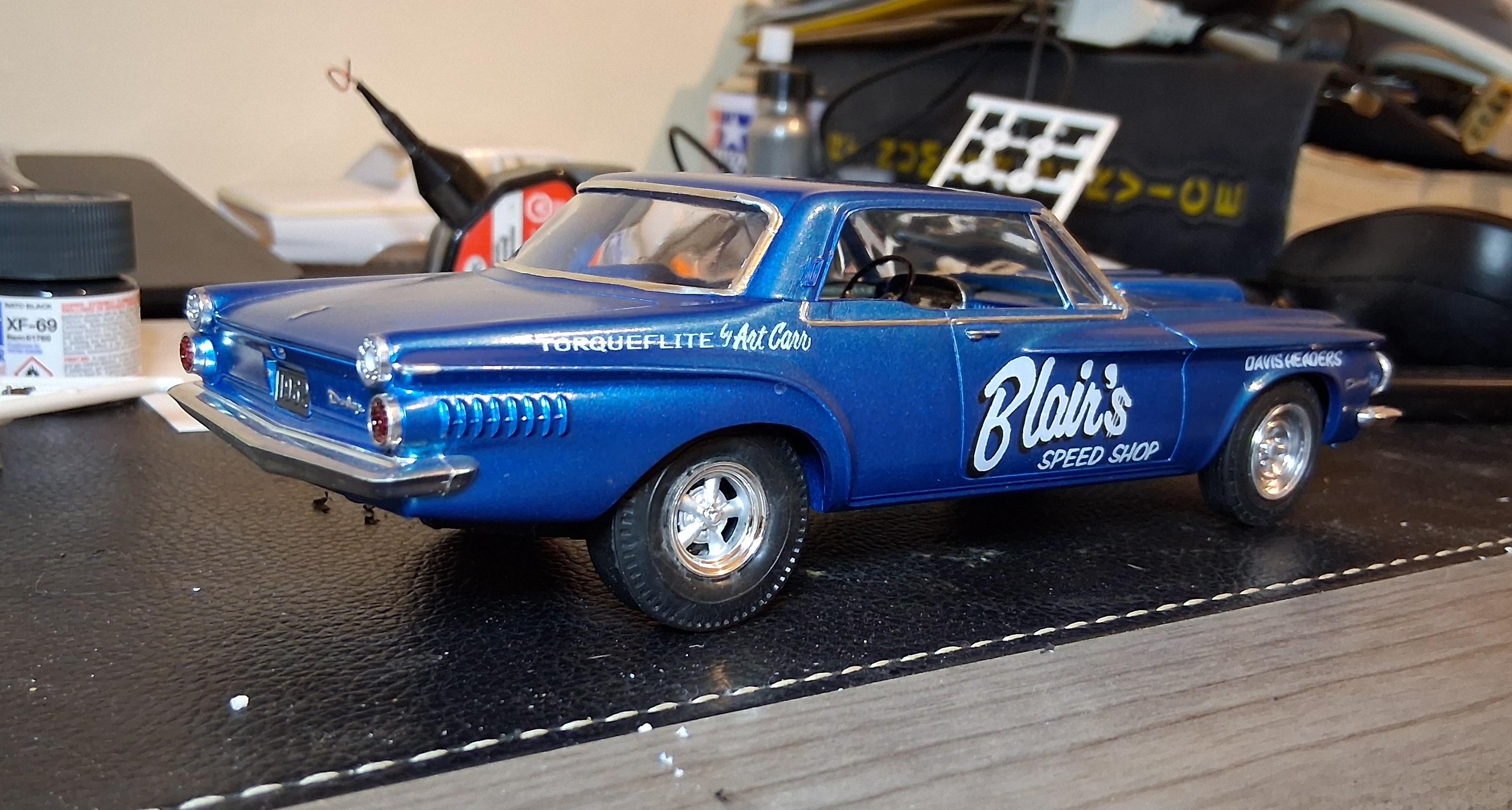 MOST of the BMF work is done Need a sharper blade to finalize the fender trim Body . Interior and chassis are now one Time to finish up the engine and suspension in next few days That little Dodge emblem was done with a VERY fine brush. My lighted magnifier and fusion chrome paint Turned out A LOT better than I expected. -