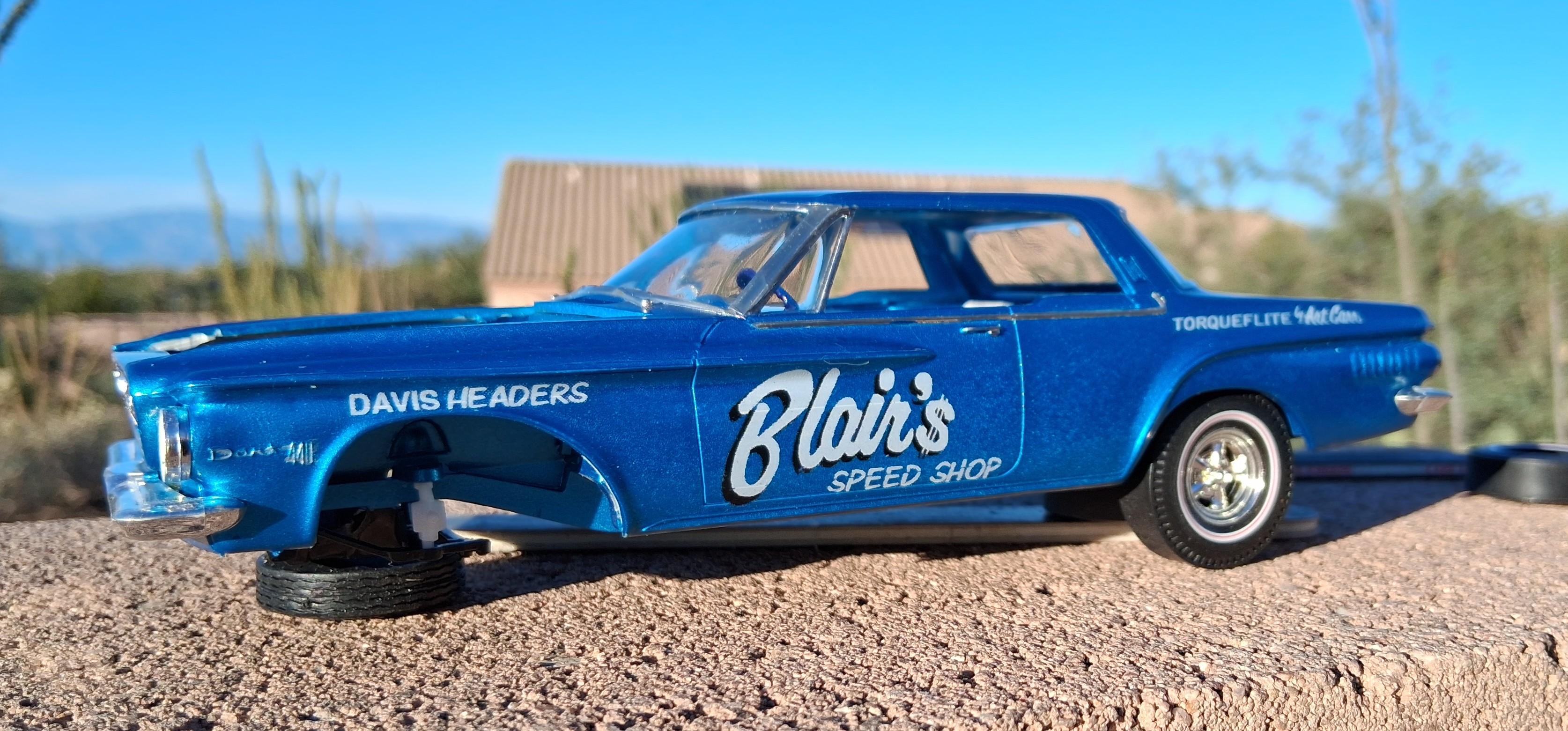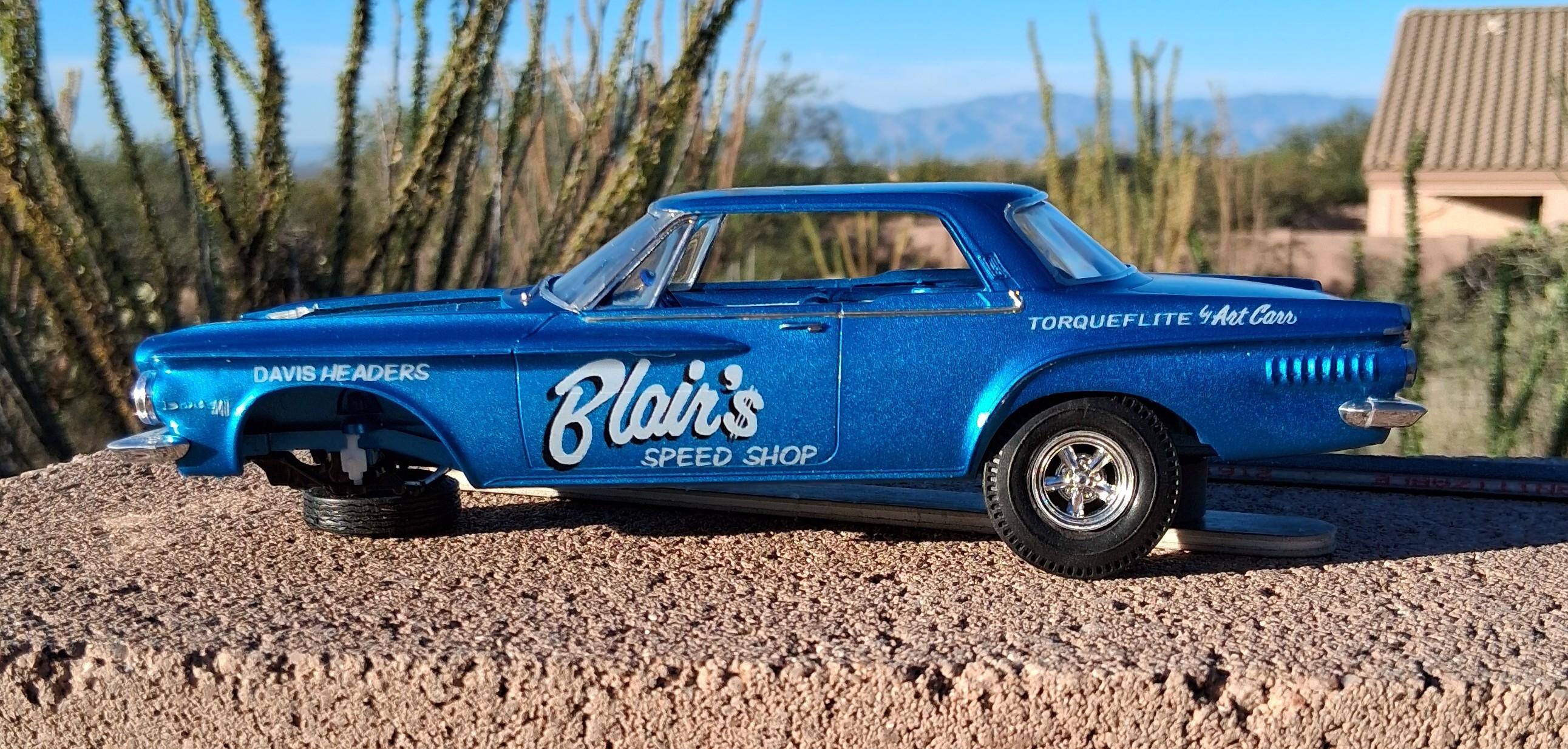 After messing with the stock kit chassis I saw no real way to get the car to sit ' right' So I jumped in both feet to modify the body ( very scary feeling ) and a Lindberg chassis from one of the SS Dodge / Plymouth kits Taking a knife and grinder to a kit that was painted many years ago was scary as I have no idea what I used to paint it back then But all in all. It went well and with a bunch of mods to both chassis and body. It fits . Pretty well I think. In all honesty. This one was a test to see if I could do similar mods to a Johan 1963 Dodge kit I have Even though the kit has a Dana rear axle. which is wrong for this car, I'll live with it as I do nt have any spare 8-3/4 rear axles to give up for this car I haven't decided fully if I will try to make or use Johan fender well headers,,,,OR just use the Lindberg pieces. Chassis required I cut A lot off the ft and some trimming on the back. Otherwise it fits decent I had to remove everything behind the kit body grille to make it fit , ( that was scary )