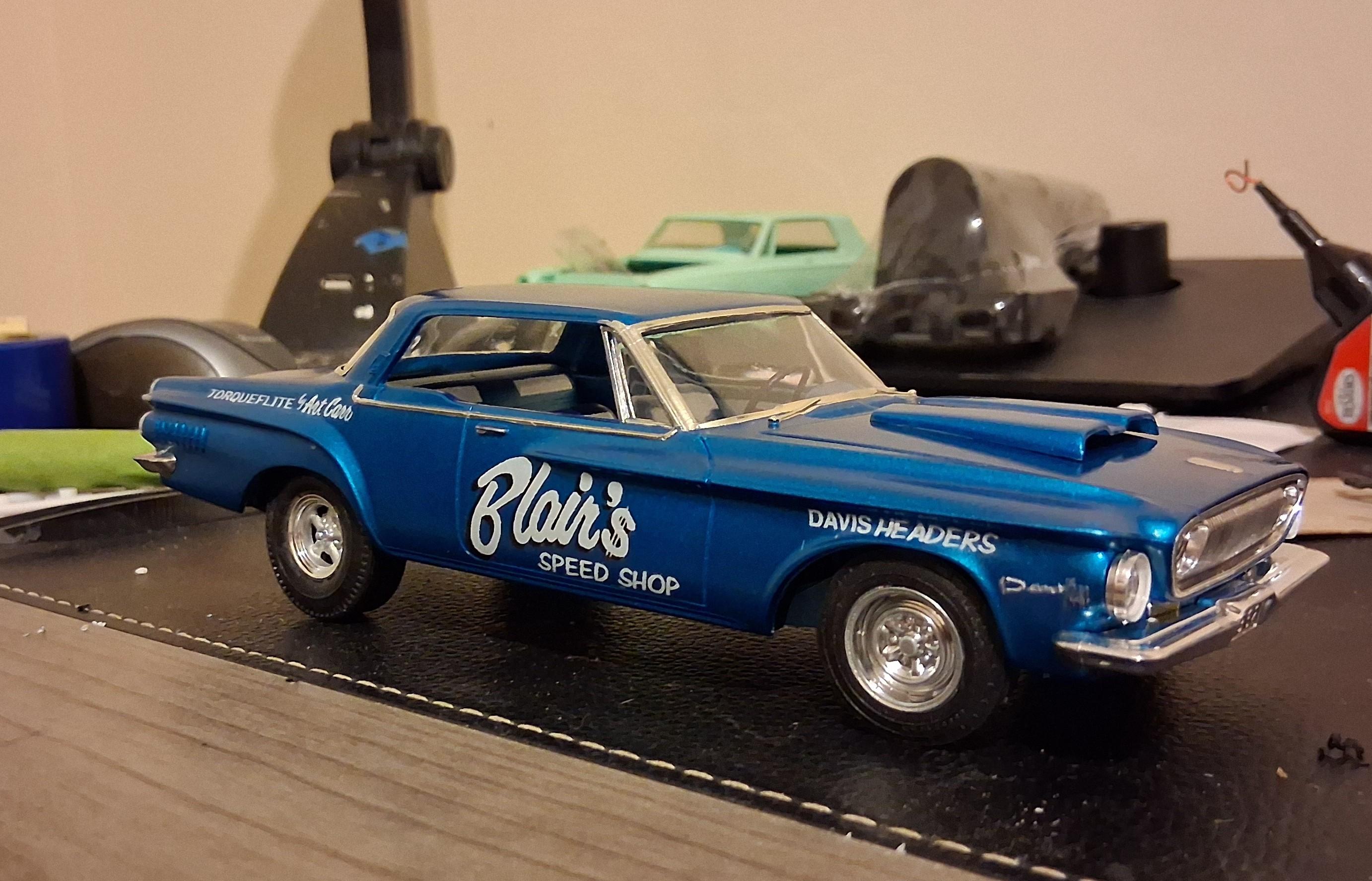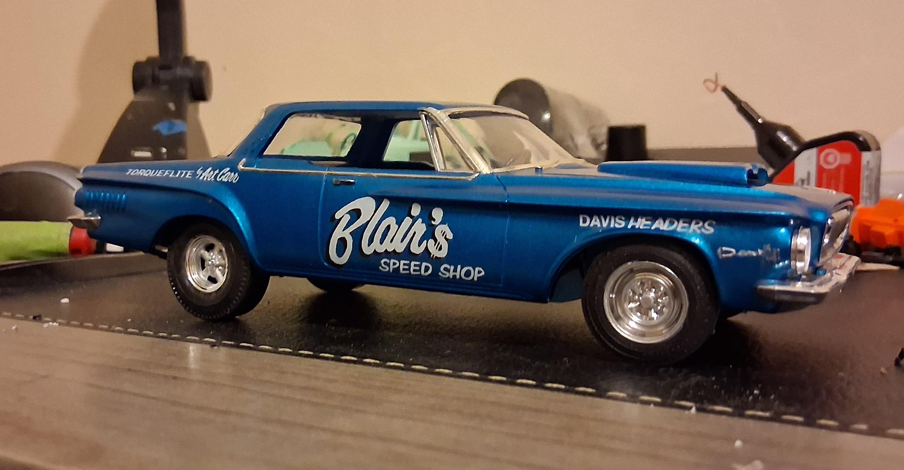 Slowly,,,,But surely Rear wheels from the Moebius AFX kits Rear tires from the AMT tires parts pack, Ft wheels from the AMT 62 Impala chromed with the fusion chrome paint Stance is too low in the ft for sure. But I like it. I'm calling it more a 'tribute build ' instead of a true replica anyway. But I'm liking this one more and more as it goes along -