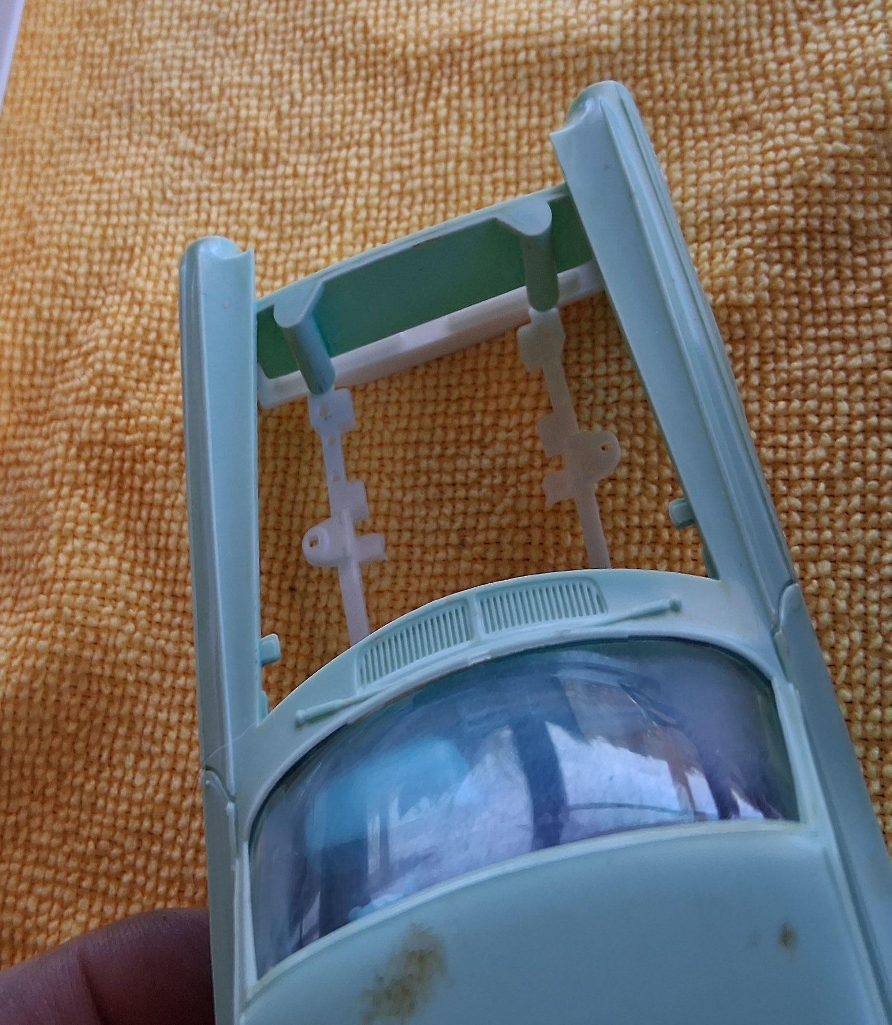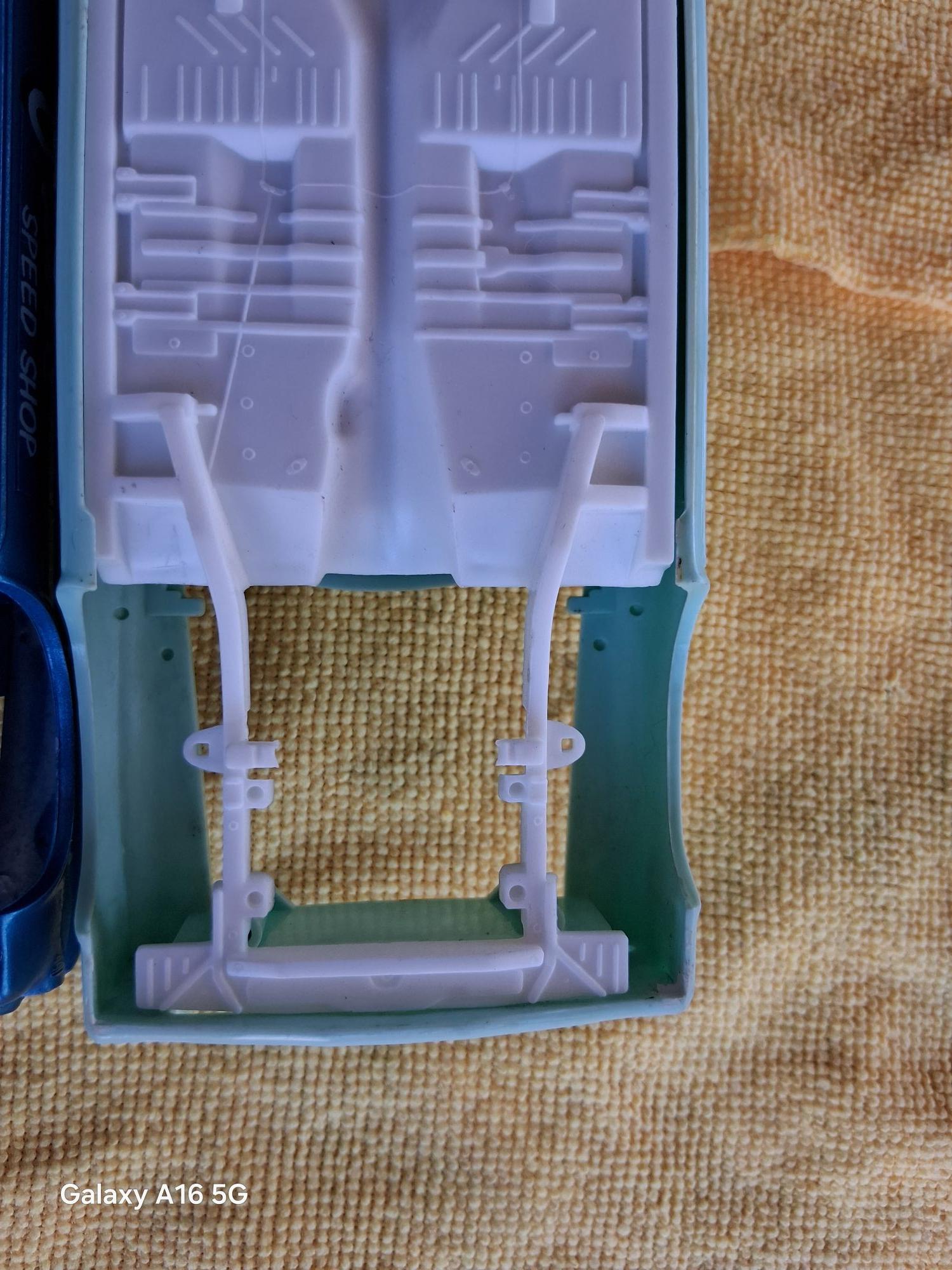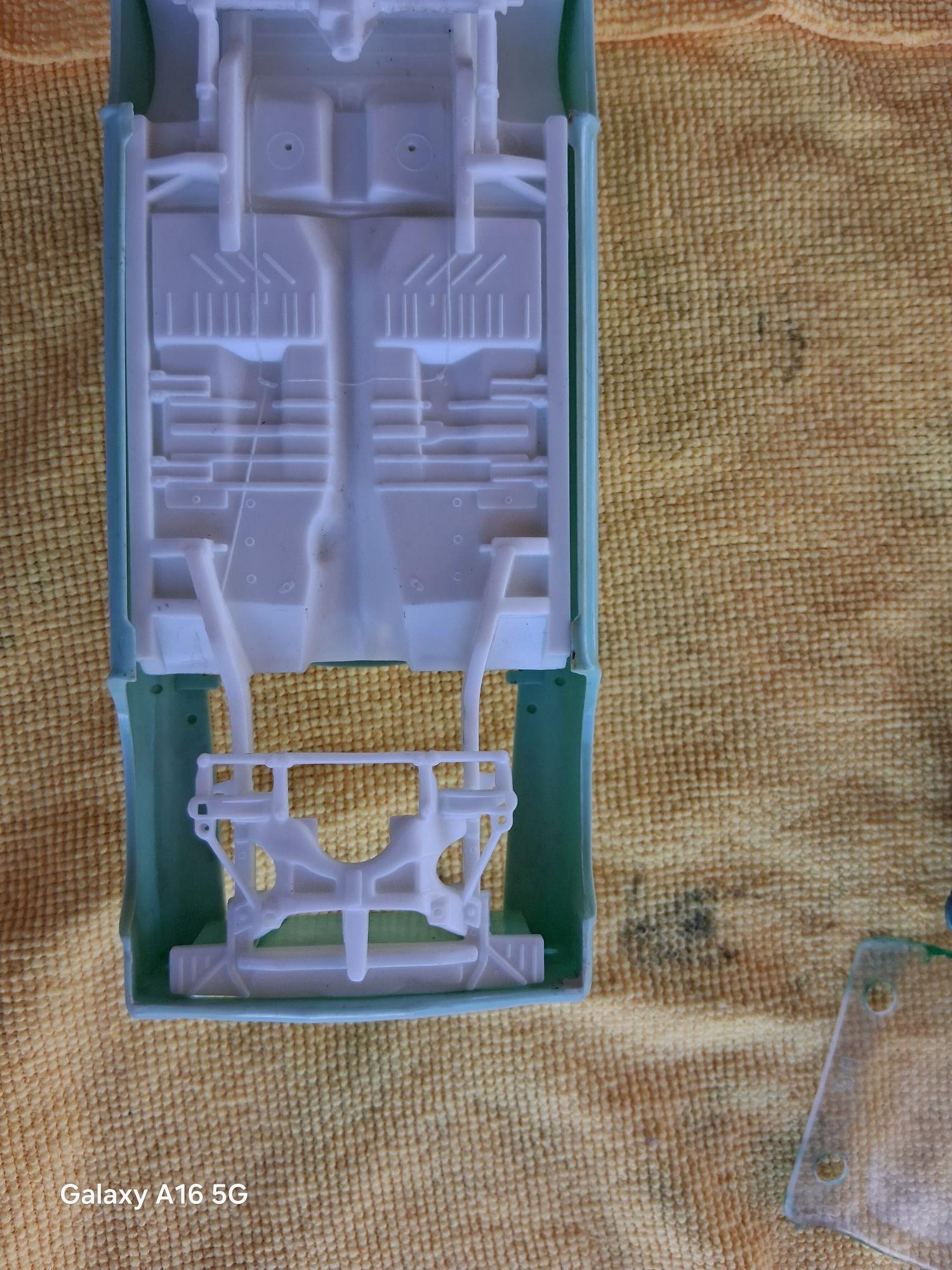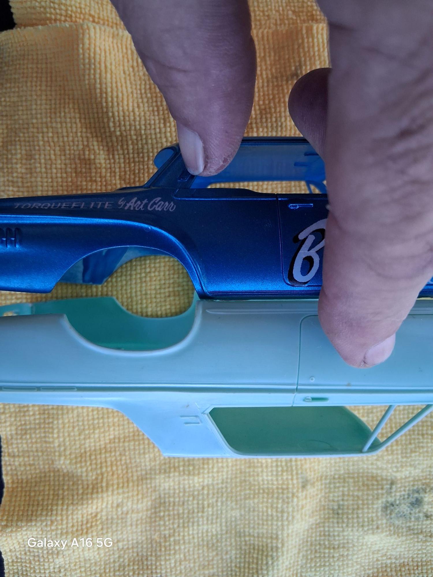 After messing with the stock kit chassis I saw no real way to get the car to sit ' right' So I jumped in both feet to modify the body ( very scary feeling ) and a Lindberg chassis from one of the SS Dodge / Plymouth kits Taking a knife and grinder to a kit that was painted many years ago was scary as I have no idea what I used to paint it back then But all in all. It went well and with a bunch of mods to both chassis and body. It fits . Pretty well I think. In all honesty. This one was a test to see if I could do similar mods to a Johan 1963 Dodge kit I have Even though the kit has a Dana rear axle. which is wrong for this car, I'll live with it as I do nt have any spare 8-3/4 rear axles to give up for this car I haven't decided fully if I will try to make or use Johan fender well headers,,,,OR just use the Lindberg pieces. Chassis required I cut A lot off the ft and some trimming on the back. Otherwise it fits decent I had to remove everything behind the kit body grille to make it fit , ( that was scary ) -