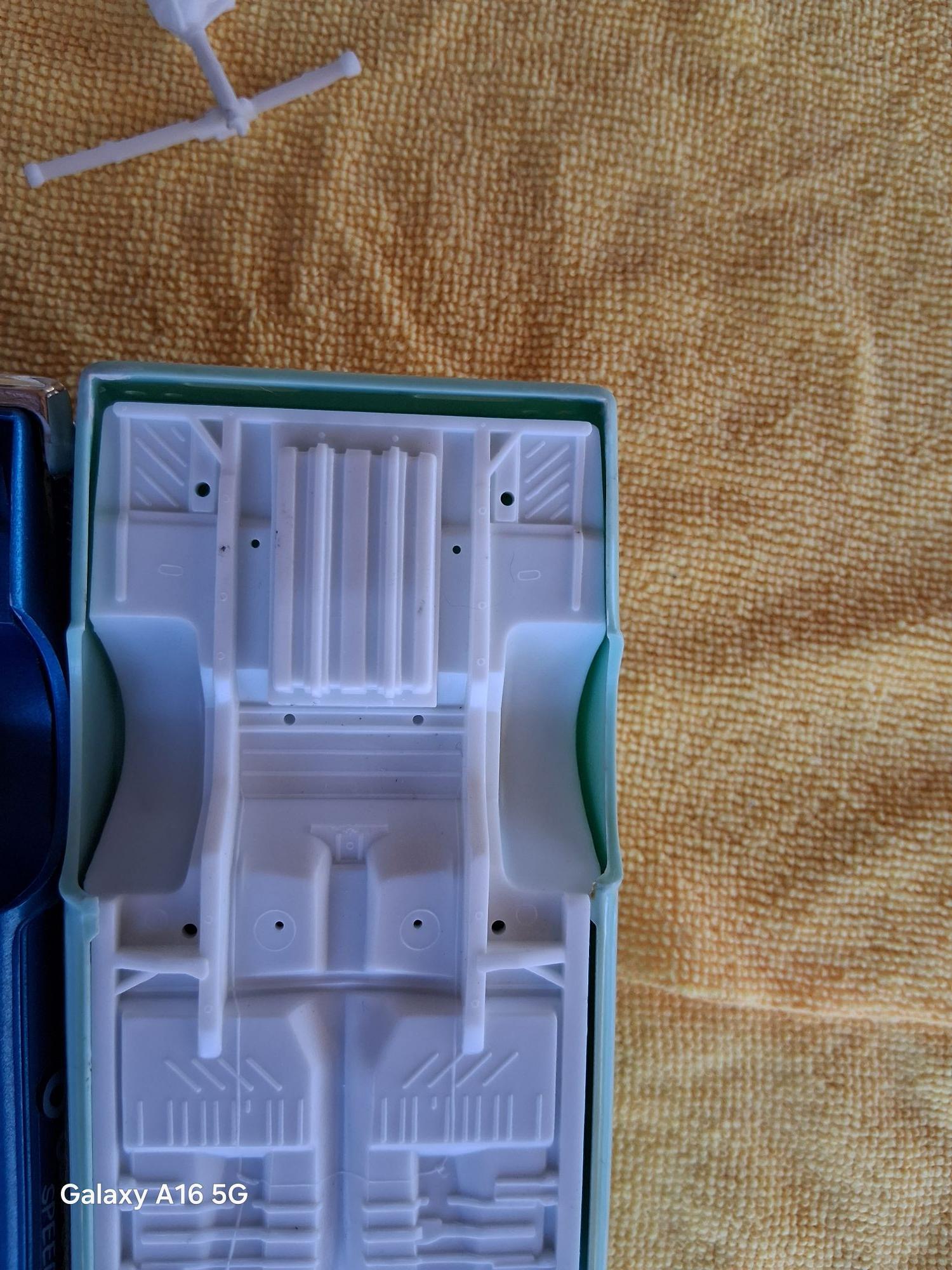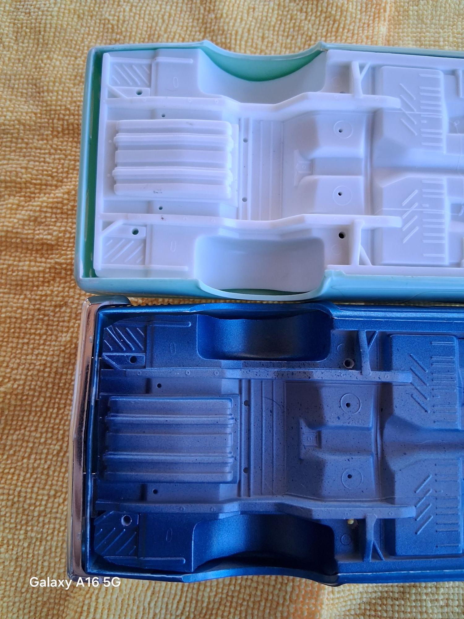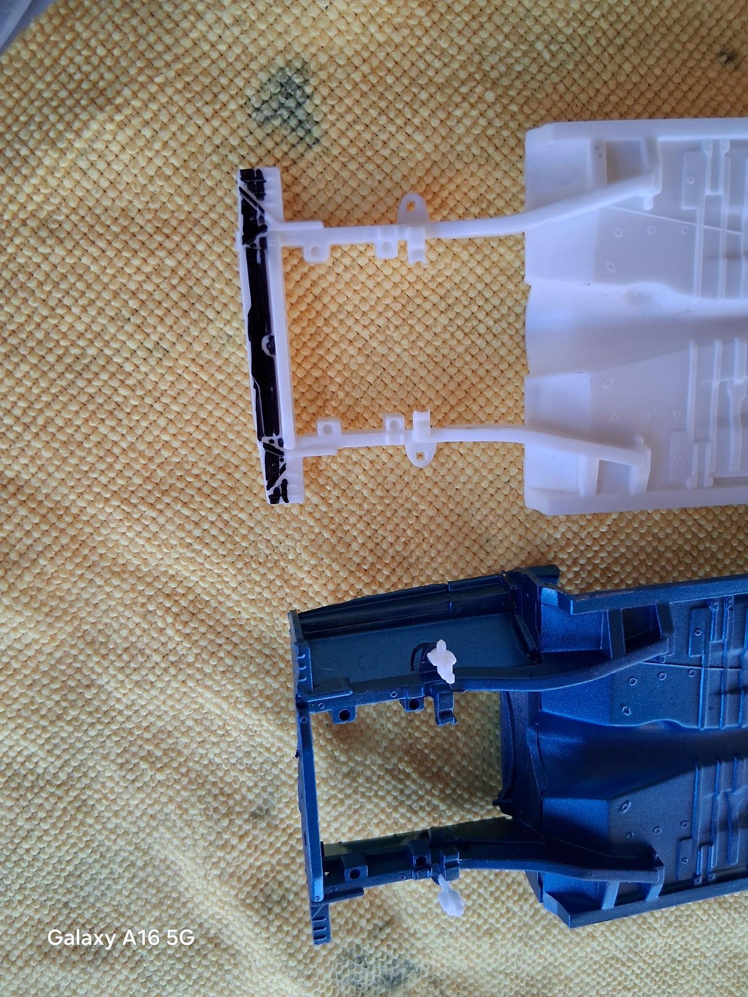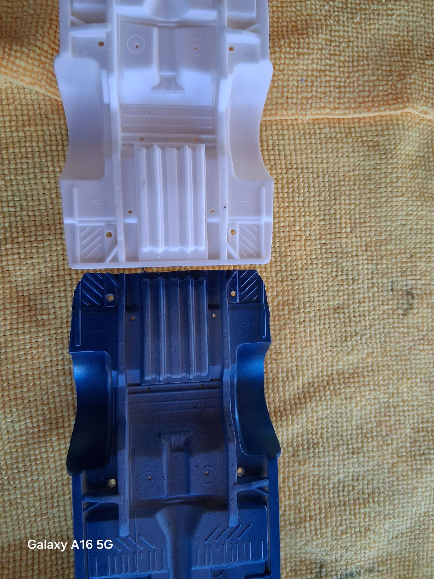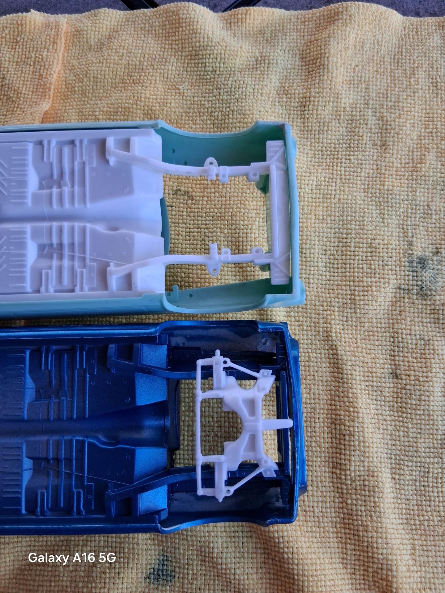 2nd the comparisons between the 62 Dodge versus 63 Dodge is minor, but noticeable and thus require some mods to the chassis to use it in the 62 White kit chassis is uncut in the '63 Painted kit chassis is modified in the '62 The front section I've highlighted in black needs to be removed. On both ends to make it fit / Plus the sides rearward of the rear wheel house needs to be narrowed a touch BTW, The angled ends where I have pointed with maker DOES not need to be done. I got a little over jealous making cuts -
