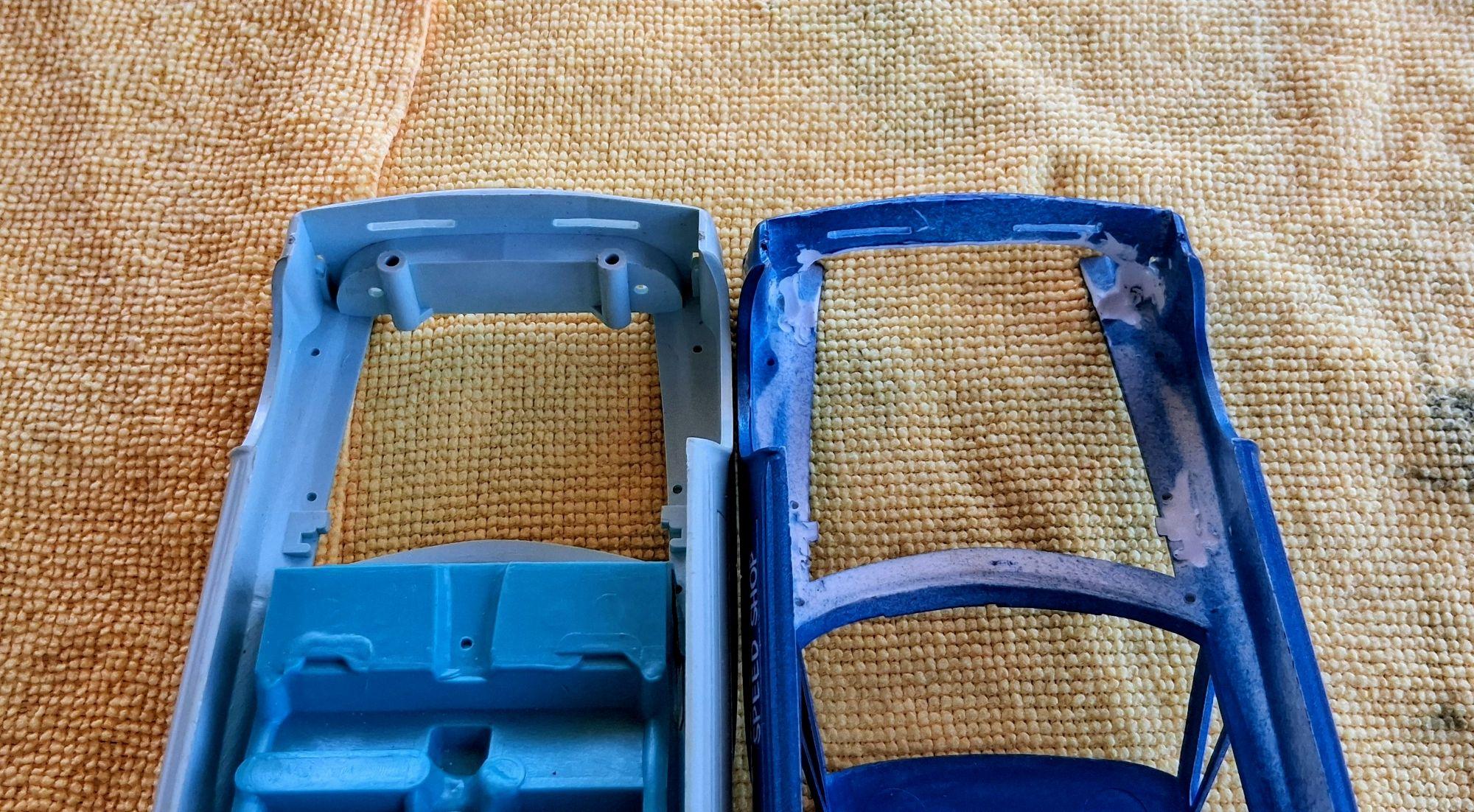 On the '62 Dodge body. After grinding out the radiator support you need to open it up a little behind the head light area to get the Lindberg radiator support / inner fenders to fit down in it right Shown modified beside a unmodified '62 Dodge body This area does not need to be done in the '63 Dodge body, shown beside the uncut '62 Dodge body. In this picture you can see the bump in the 62 that the 63 does not have. This bump needs ground down some. Dont go to crazy and risk going thru the body, as not much is required . Best I can tell All that needs done to the '63 is remove the molded in radiator support -