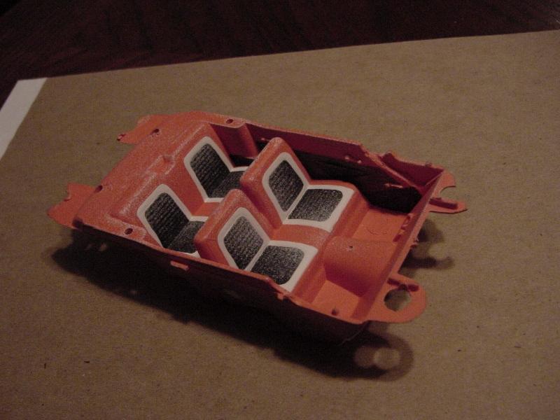 Steve, reason was . I painted the tub white, masked off the seat inserts to retain the white. And then sprayed the primary color. Reason the multiple clear coats was while painting the door panel inserts the black was dragging the base color up causing streaks in both the black and the dark silver accents. The flat clear help this,,but didnt totally eliminate the issue,,but it helped. So next time I'll just really let the paint dry and deal with streaks at that time if get them again My plan next time is start out the same - base white primer ( its duplicolor I think ) . tape it off for the white seat inserts again, and spray the Geranium. Then just sit it aside and leave it alone for a week or two to fully cure. THEN do my hand painting of the door panel accents and the black seat inserts. Then a light coat of flat clear to take the shine off the color. I'll work in the garage 1/1 and on my SuperBird project in the meantime. My problem was I just couldn't get excited or really motivated to work on the Bird. Its a long way from an out of the box build and to be honest. Ive gotten away from such detailed builds just because they take so long. and I loose interest in the project. As for the quality. I like it. And I'm not ready to give up on it just yet. This is the same paint - Testors flat clear lacquer on the boot cover and semi-gloss clear lacquer on the dash . I had to take maybe 5 or 6 pics of this to get what I feel truly represents the actual color of the parts i have in my hand to show on my monitor. -