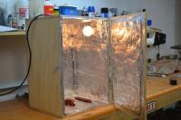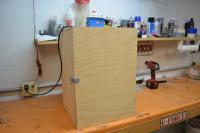 I finished my drying box and got it calibrated today. I used 1/2" plywood. It's about 14" wide x 12" deep and 20" tall. I bought 2 receptacles and wired them in with the dimmer switch to be able to vary the amount of heat I'm putting into the box. I lined the box with some quilted material that is aluminized on one side. Had it left over from the Cobra I built a few years back. With the lining, I found I really only needed a single 60W incandescent bulb to generate enough heat to maintain 105 degrees. Here's a few pics. -