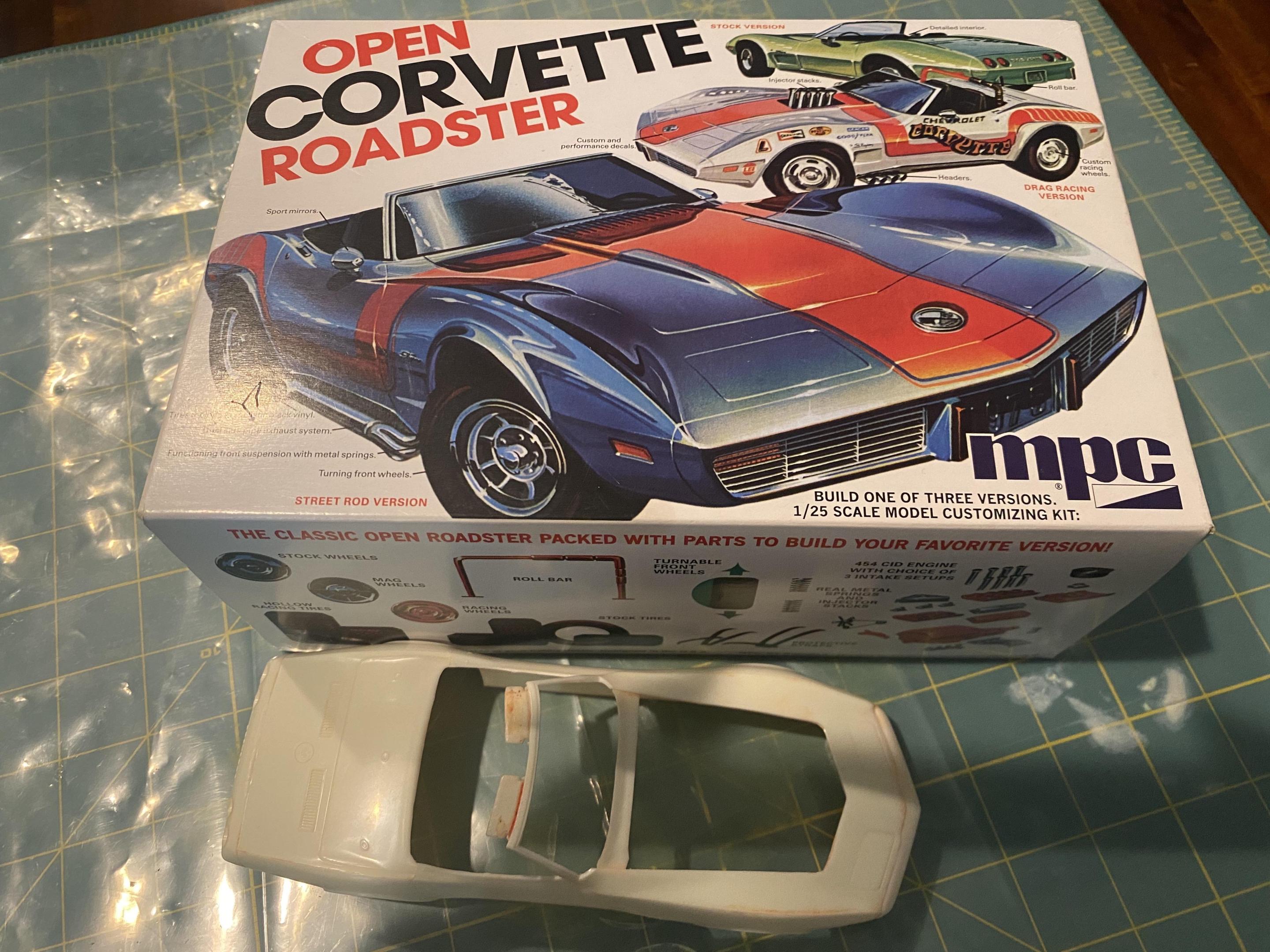 Hello, First of all: This is all #Plowboy's (Roger Hayes) fault! His drop dead gorgeous California Street 'Vette hit me like a freight train! What a beauty! Check his Vette in this link: http://www.modelcarsmag.com/forums/topic/175154-california-street-vette/ I am mostly a factory stock (and documented replica in the case of race or historical vehicles) modeler. I've done customs, but it is not usually my main subject. Roger's California Street 'Vette inspired me to dig out mine. The back story is that I got this model (and a few others) already built from my High School Art teacher, well over 30 years ago. I graduated HS in '86 and it was shortly after that. To this day, he is a very good friend and one of the main responsibles of me been a Corvette guy. I learned more about Corvettes from him than drawing and painting ? I remember quickly tearing this model apart and with no plan I started fooling around with it. I destroyed the roof louvers by filling them with putty. No idea what I was thinking. Longest shot: anybody has a spare roof louver for this car? Eventually it went back into the box until this week. All major components are there. The original wheels, tires and mirrors are missing which is no big deal. The engine is pretty crude and so is the hood underside. I'll most likely keep the engine in place but glue the hood shut. I thought of adding a modern LS engine but those are 1/25 running on the smaller end and this car is 1/24 running on the larger end. The LS looks really small in there. Anyways, this car is all about the looks. It will take some fixing but the plan is to keep the original look, except for the roof of course. Door handles and key locks are lost. The body needs some massaging but this will be a slow fun project. Color? It will be blue. What shade of blue? I'll get back to you... Thanks, Ismael