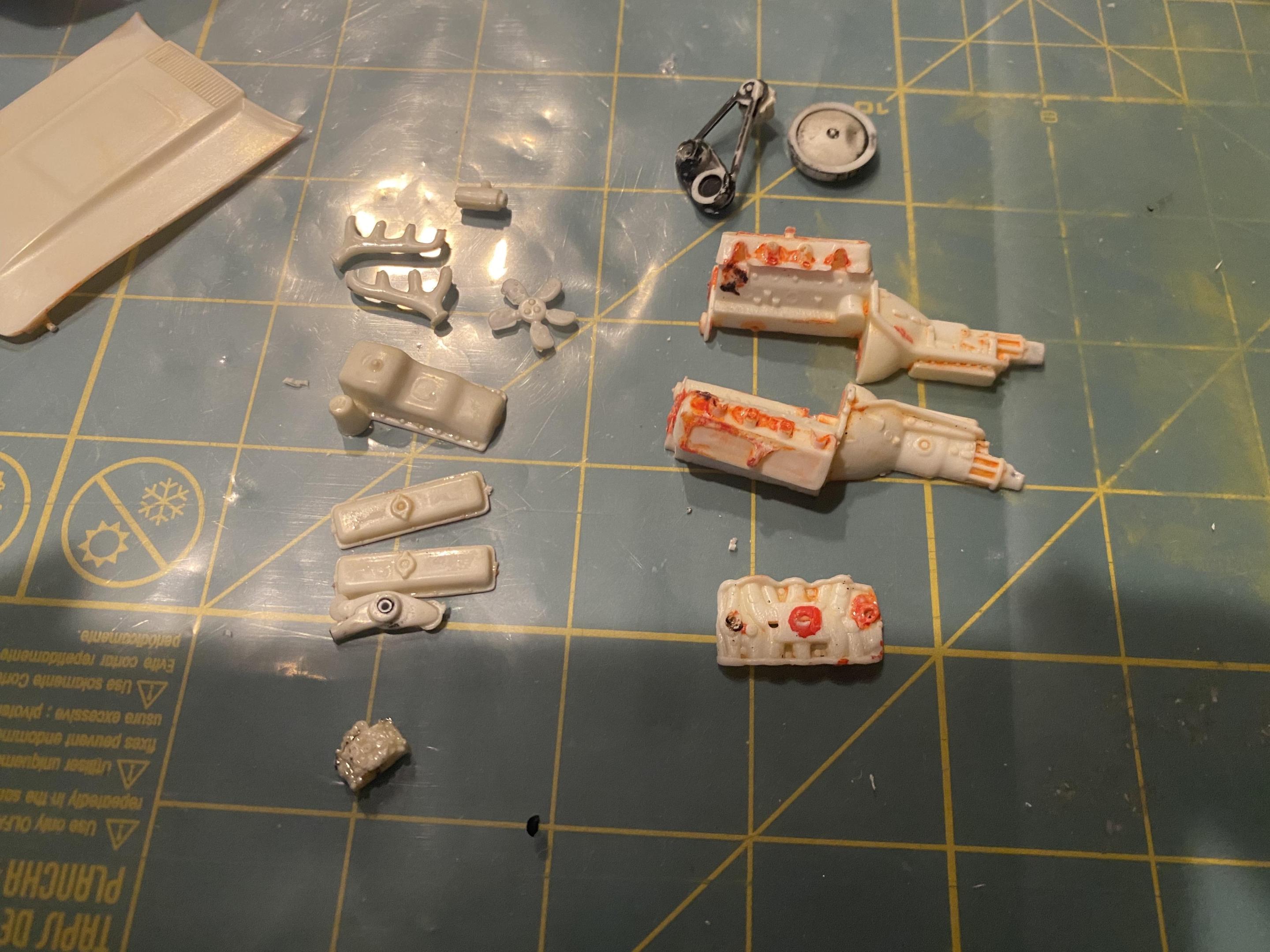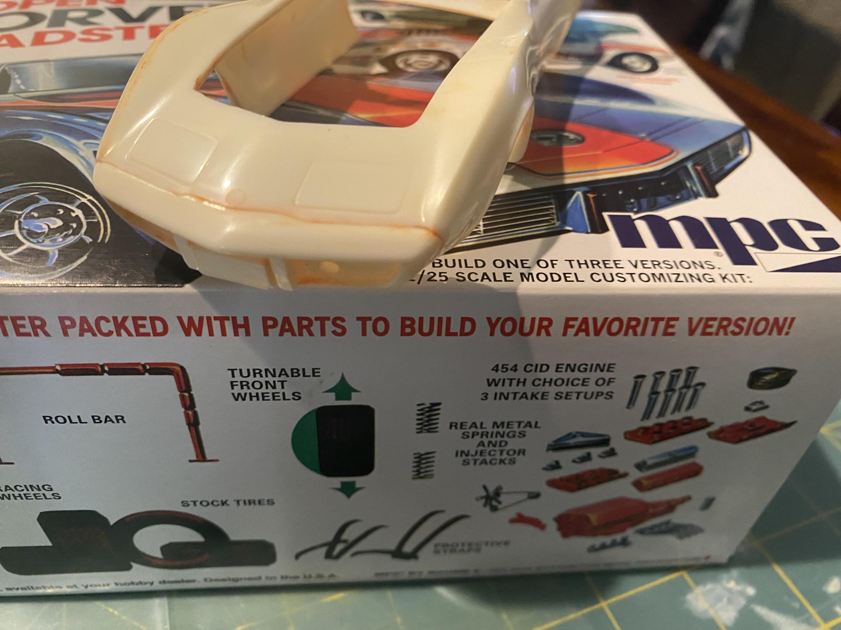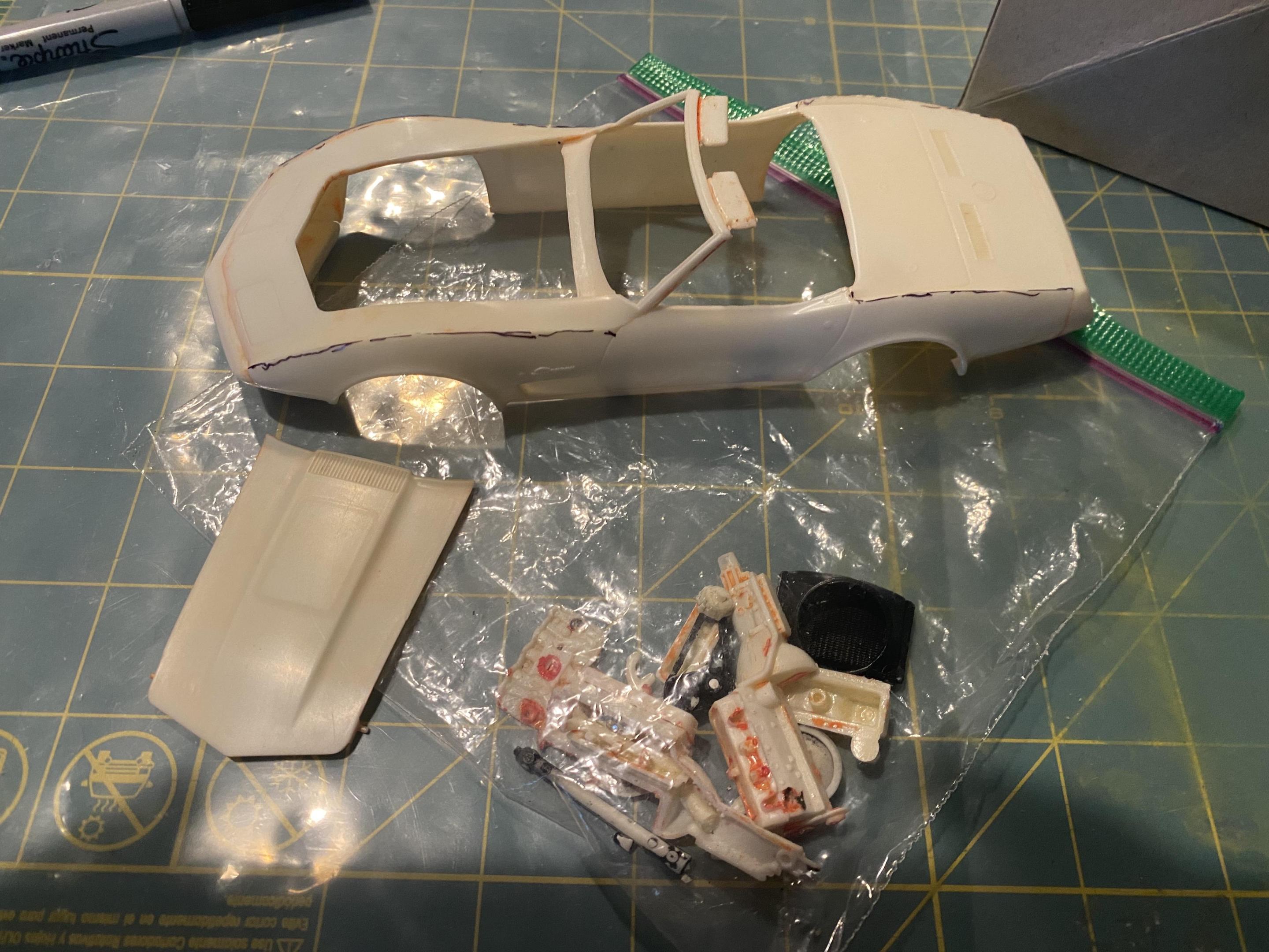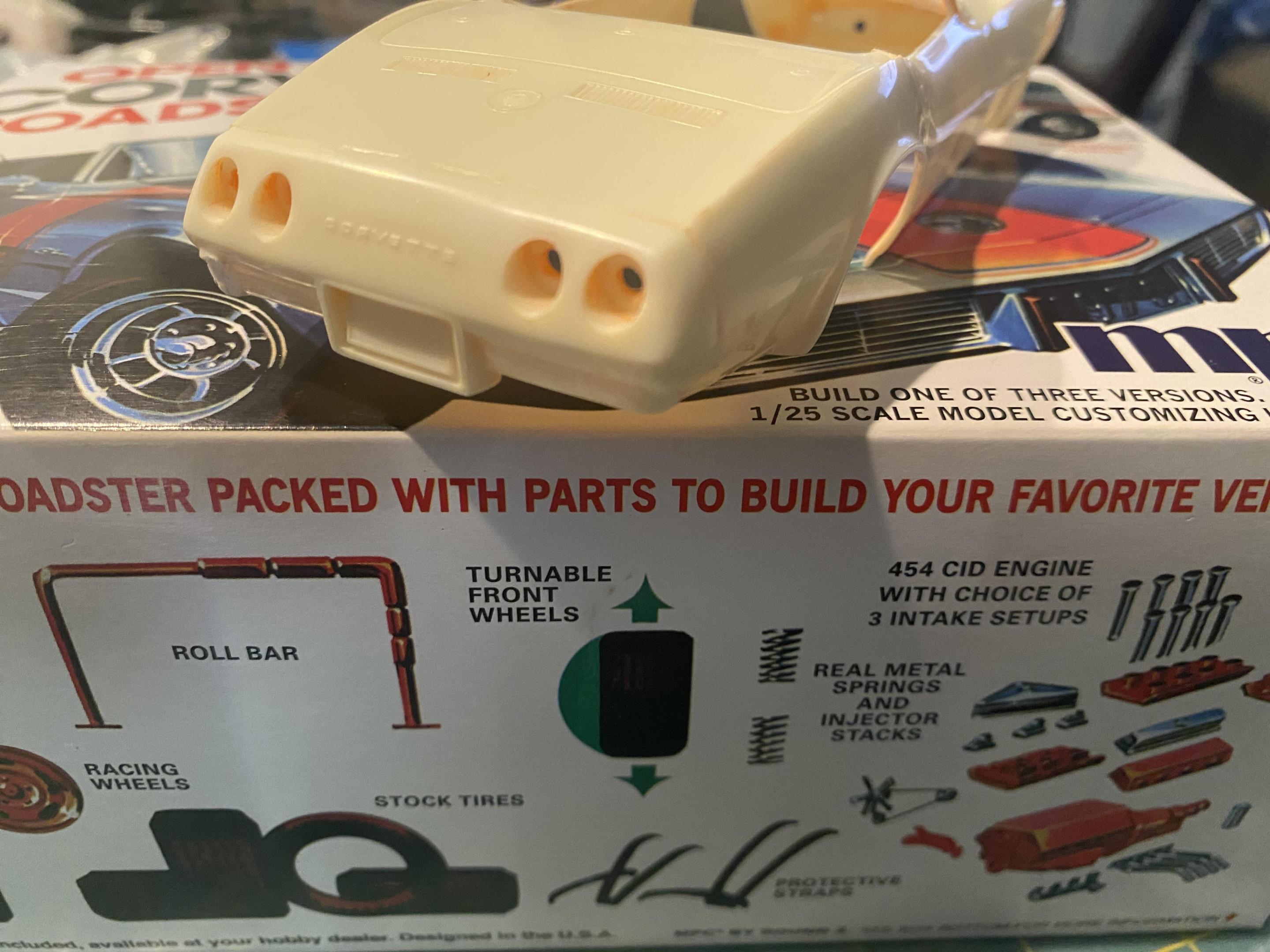 I have decided to try a build somewhat outside my comfort zone, not a Mustang but a 1974 Corvette. At least this will not be a kit bash and insane amount of scratch building like the Mustangs. There will be some scratch building for some parts that don’t exist or live up to expectations, but it will mostly be out of the kit. I purchased this kit many years ago and started to build it over a weekend, rattle can painted the body, assembled the engine and some other parts. It was not pretty. I have now stripped the paint off the 1975 Corvette body and started converting it to a 1974. The kit came with a 454 and the last year of the 454 was 1974. I can only assume it was a slight retool of the annual 1974 to 1975. The engine had way too many chromed parts so I pulled it back apart and stripped all of the engine parts. I am planning on doing my LED wiring I usually do, I think the hardest part will be finding a place for the battery and making the headlights pop up. Hopefully I can make space where the top would go down for the battery.