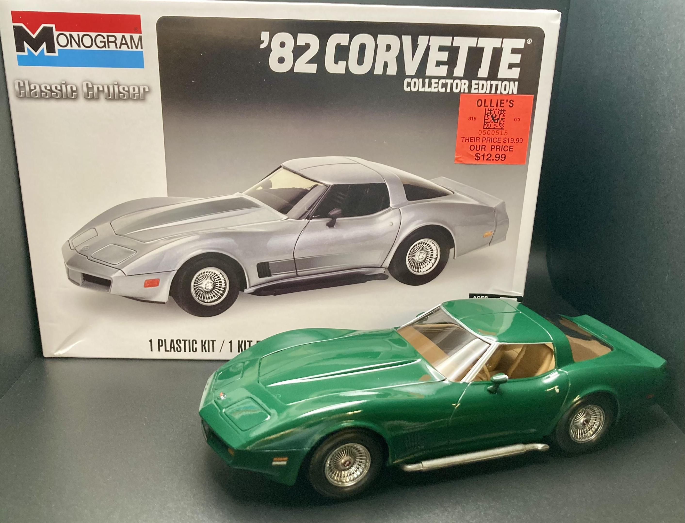 Here’s my build of Monogram’s snap kit 1982 Corvette, from the recent Ollie’s Special release. It’s a quick slump buster of a kit that goes together nicely although it’s not super detailed. I airbrushed it in Tamiya X-5 green with XF-93 light brown for the interior. This was my first acrylic airbrushed body in a couple of years (been using Tamiya spray lacquer for some time for bodies since I get way better results), so it’s not my best work but looks ok. I think I’m not thinning out the paint enough so there are a few orange-peel spots. The green is not factory for ‘82 and the windshield trim should be black, but I think the green over tan and silver trim gives it a nice luxury look. Late C3’s are oddly my favorite Corvettes style-wise although I know they were lacking in the performance department.