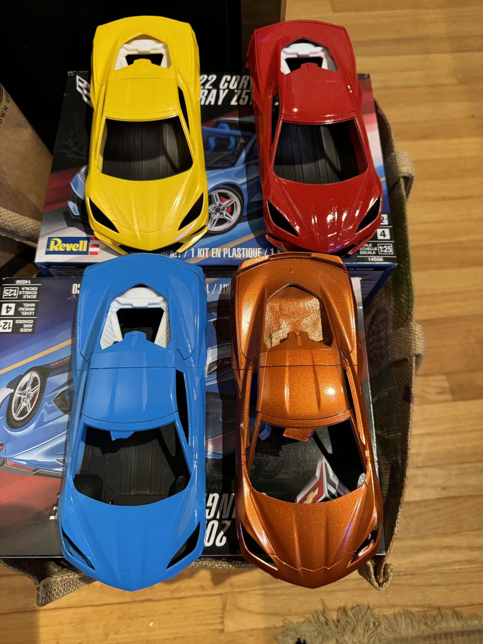Some of the colors for my Corvette collection. I have 4 more coming. Colors are Tamiya TS 97 yellow, testers Italian red lacquer, paint scratch touch up rapid blow, and Tamiya TS-92 metallic orange. I have one not shown that is Tamiya TS 10 French blue. The other 4 will be painted pearl white, gun metal grey, Tamiya TS 50 blue, and either a purple or lime green. I have a real 2023 HTC so I am really wanting the convertible from Revell. I will have to be happy with the hardtop until it’s released. Thanks for looking.