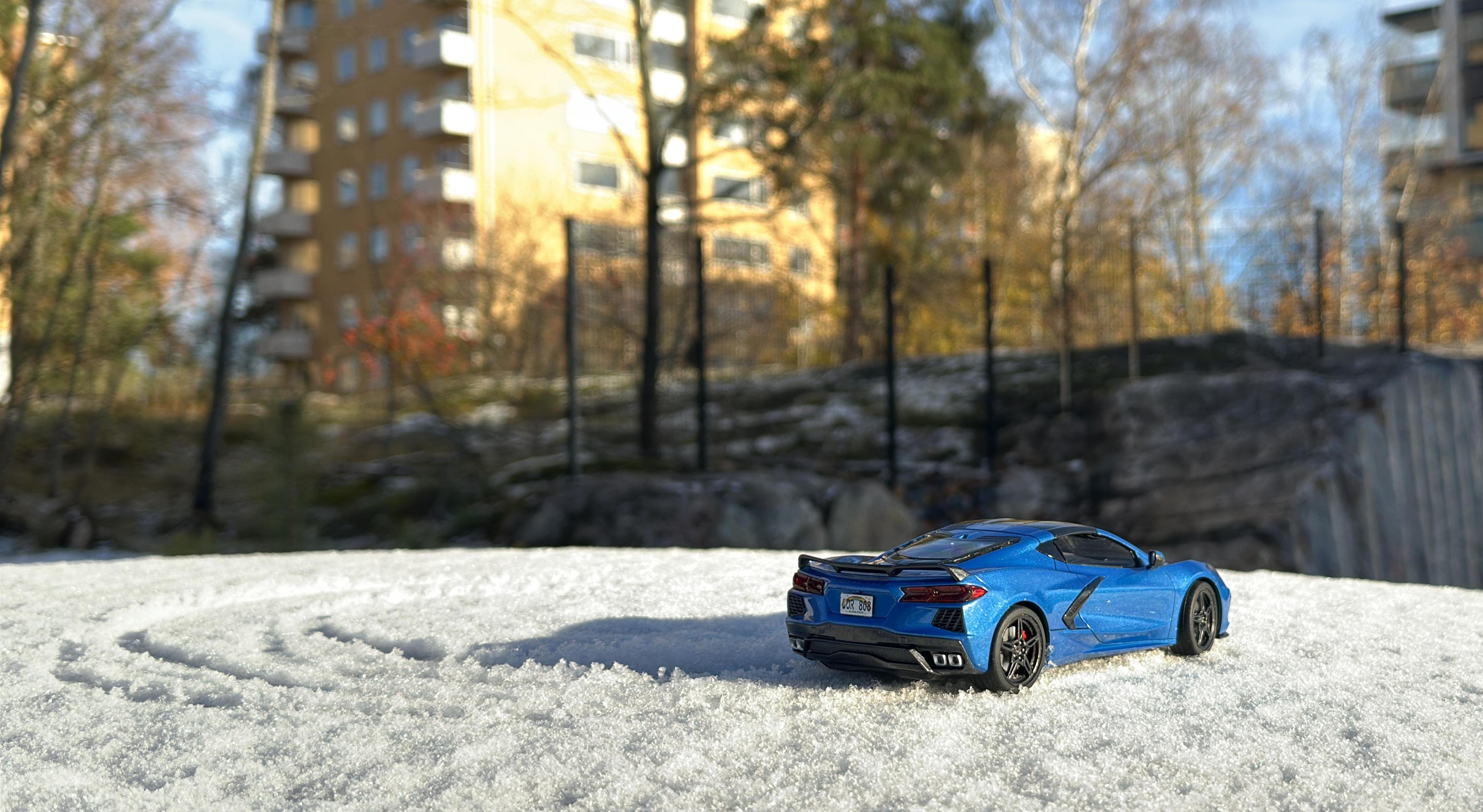 Had to try the new C8 in the snowy winter roads. Exterior painted in the original Riptide Blue metallic. Tamiya TS-40 Black Metallic (which is very close to the original Carbon flash metallic) was used in the exterior black parts, wheels etc. Everything clear coated with Tamiya LP-9. Didn´t bother painting the tail lights and some other small bits. Everything went together smoothly in the new Revell kit although margins were quite small.