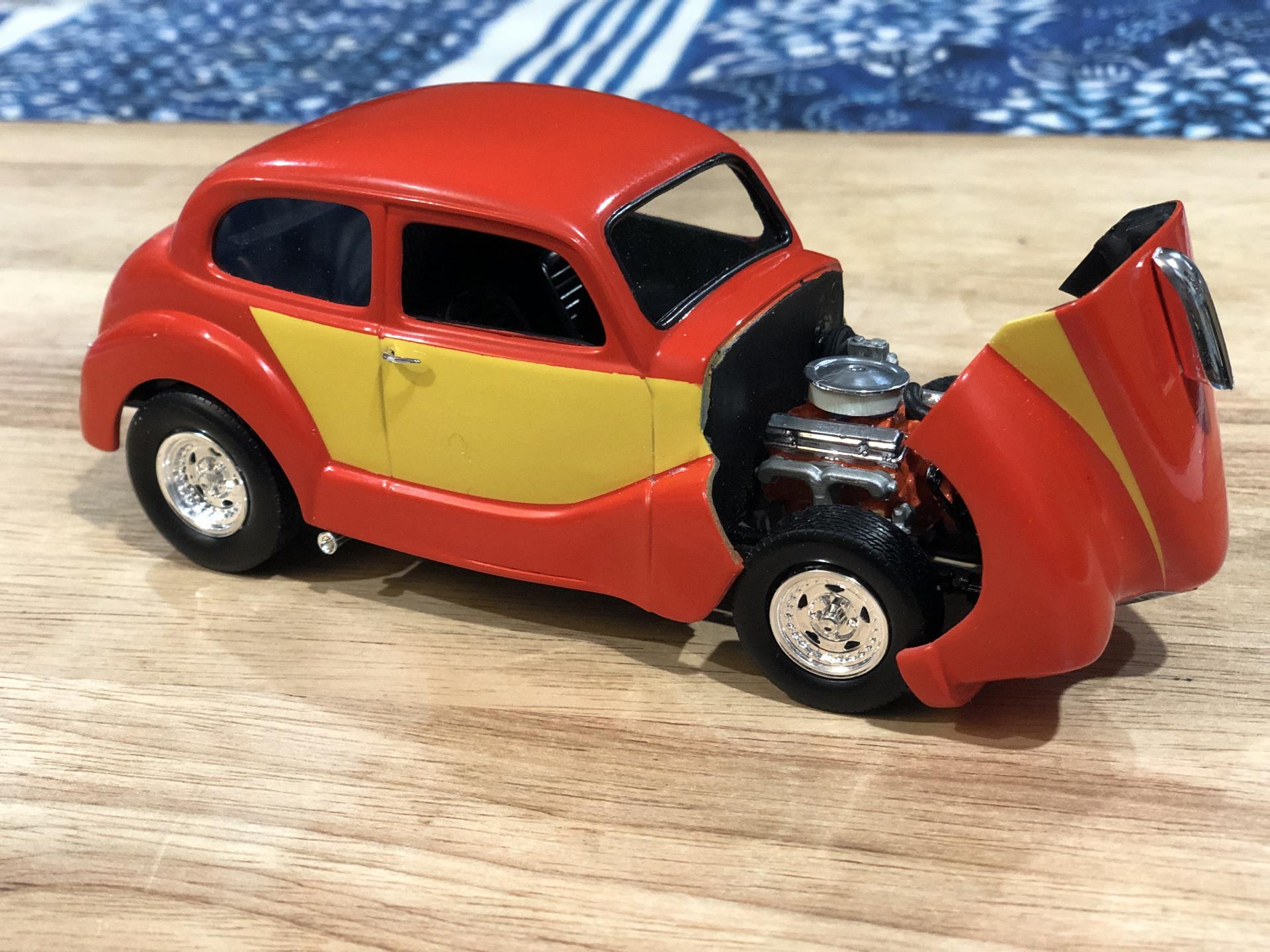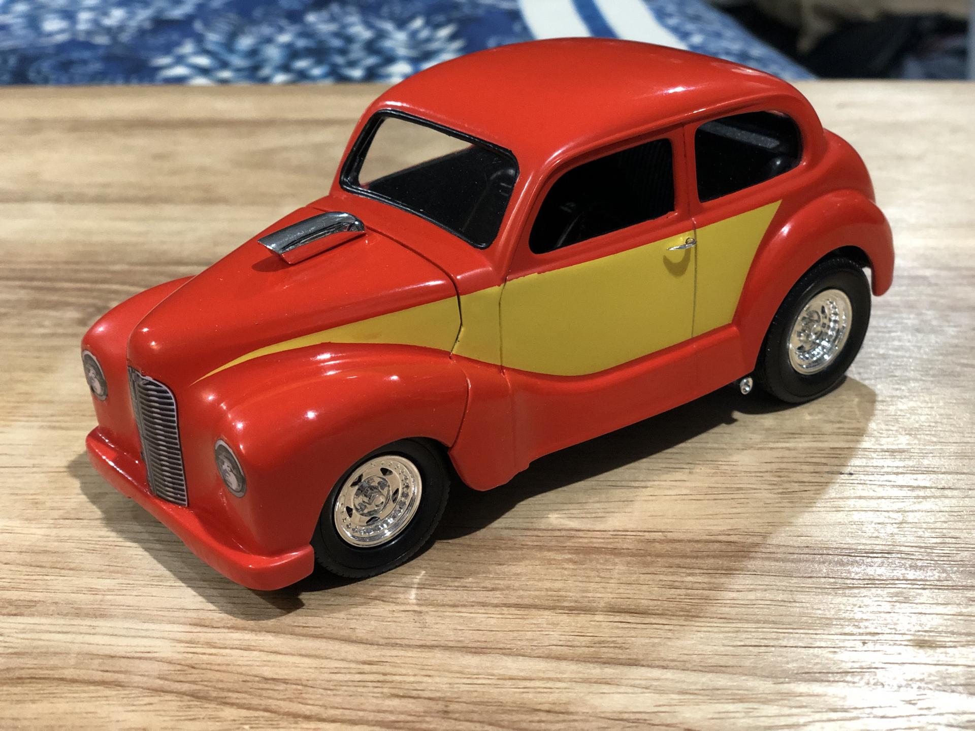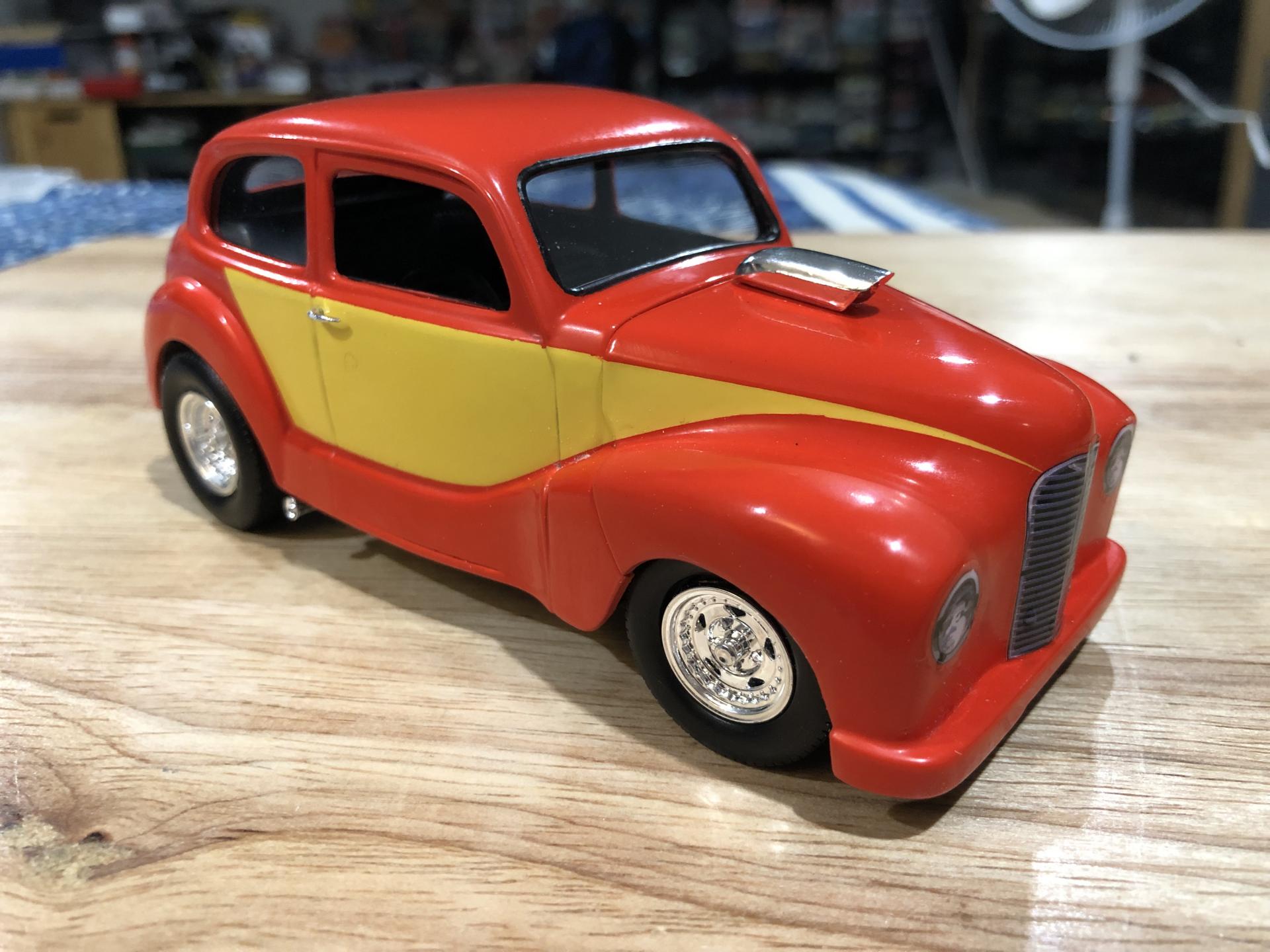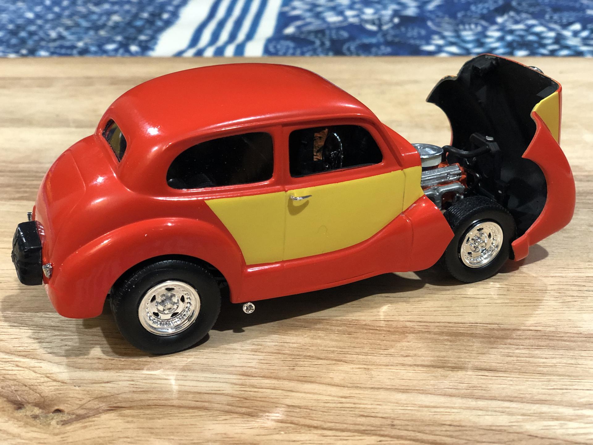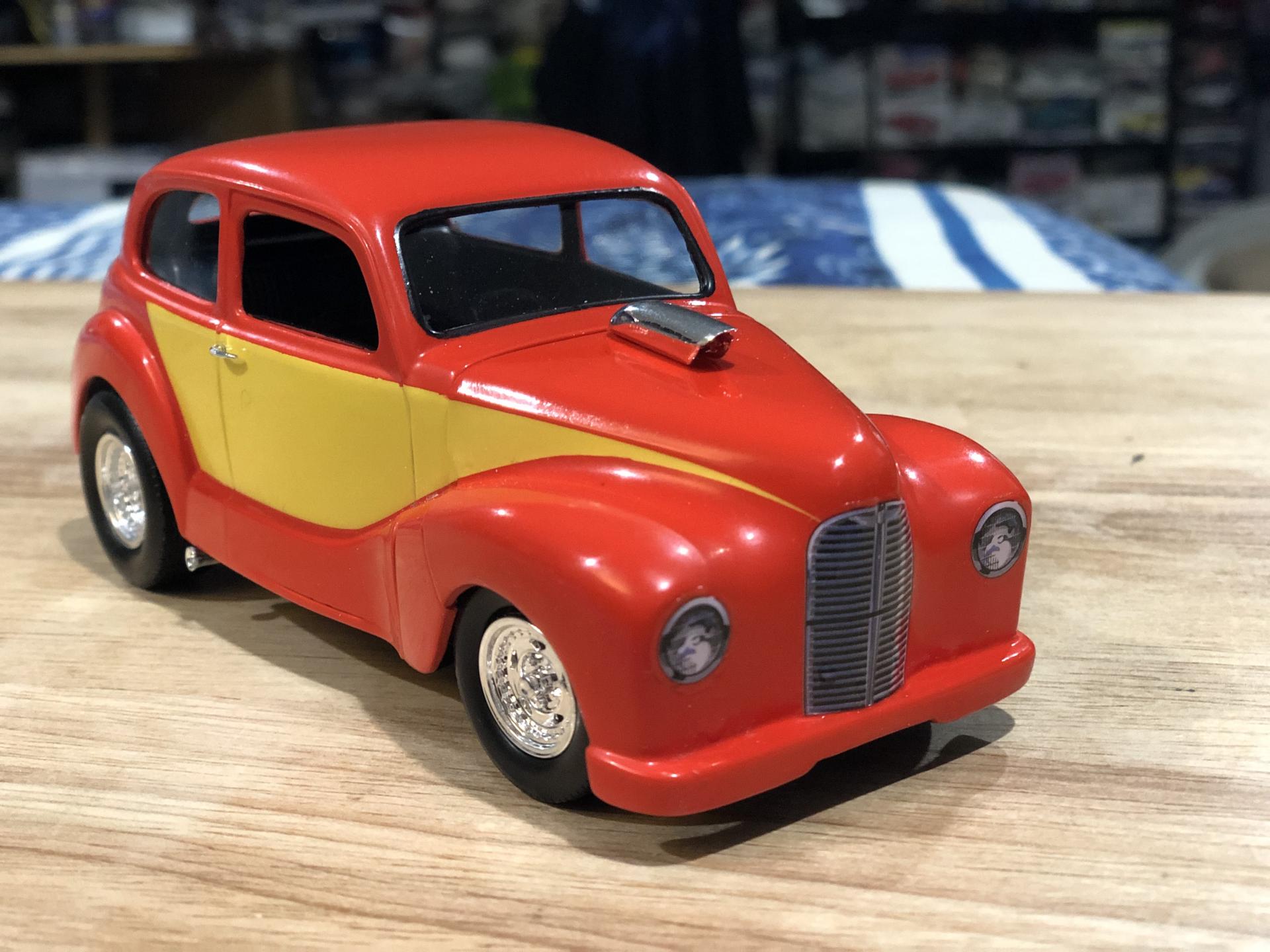 Revell Drag Austin... I've got a soft spot for slow English cars. So now I'm going to "restockify" this Austin. Gluing the doors shut because I hate hinges... New seats, new wheels, smaller diameter rear wheel well, taillights, grille... Cosworth 4 cylinder engine? Hmmm.... Here's what I'm starting with.