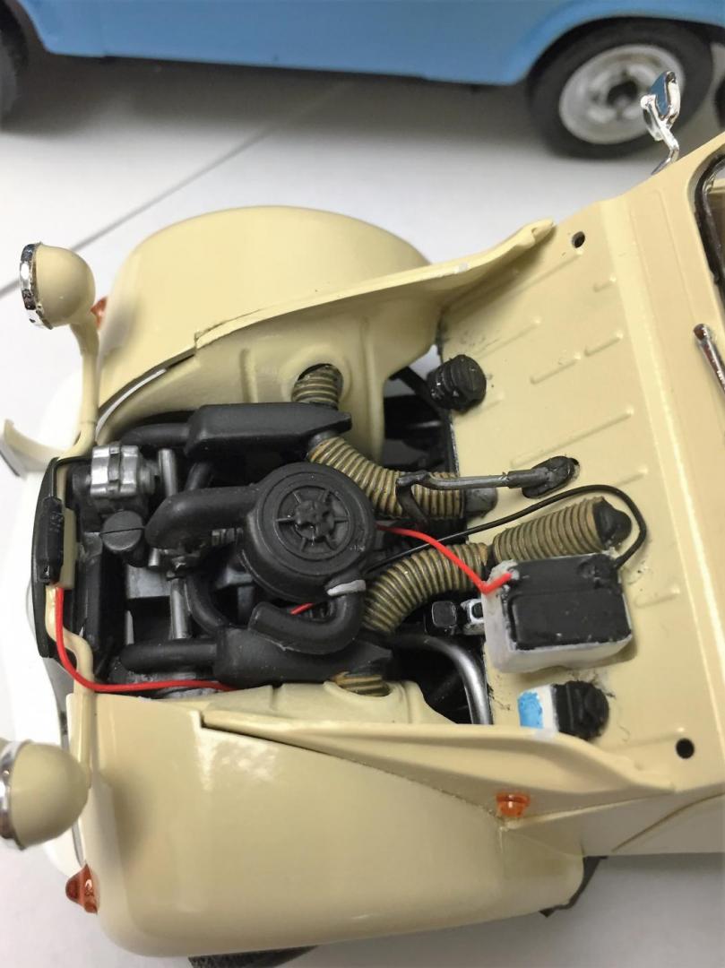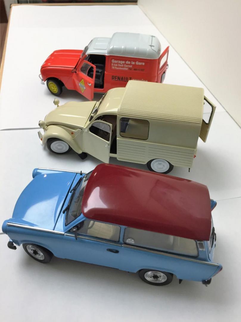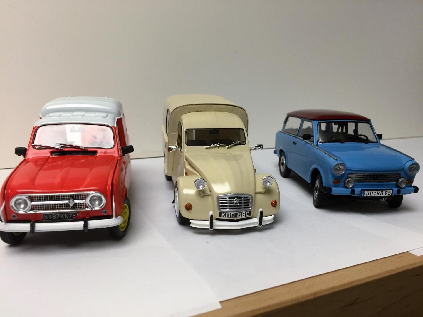 I can't believe how long it took me to get around to building these models. Maybe a year! I thought they would be Winter 2015 builds. Of the bunch, the Trabant was the toughest, mostly because of the trim. With the other builds, I tried my hand at making workable hinges and it turned out ok. I used reference photos of the 1:1 cars to decide on the color schemes. Purchased some aftermarket decals for the Renault.