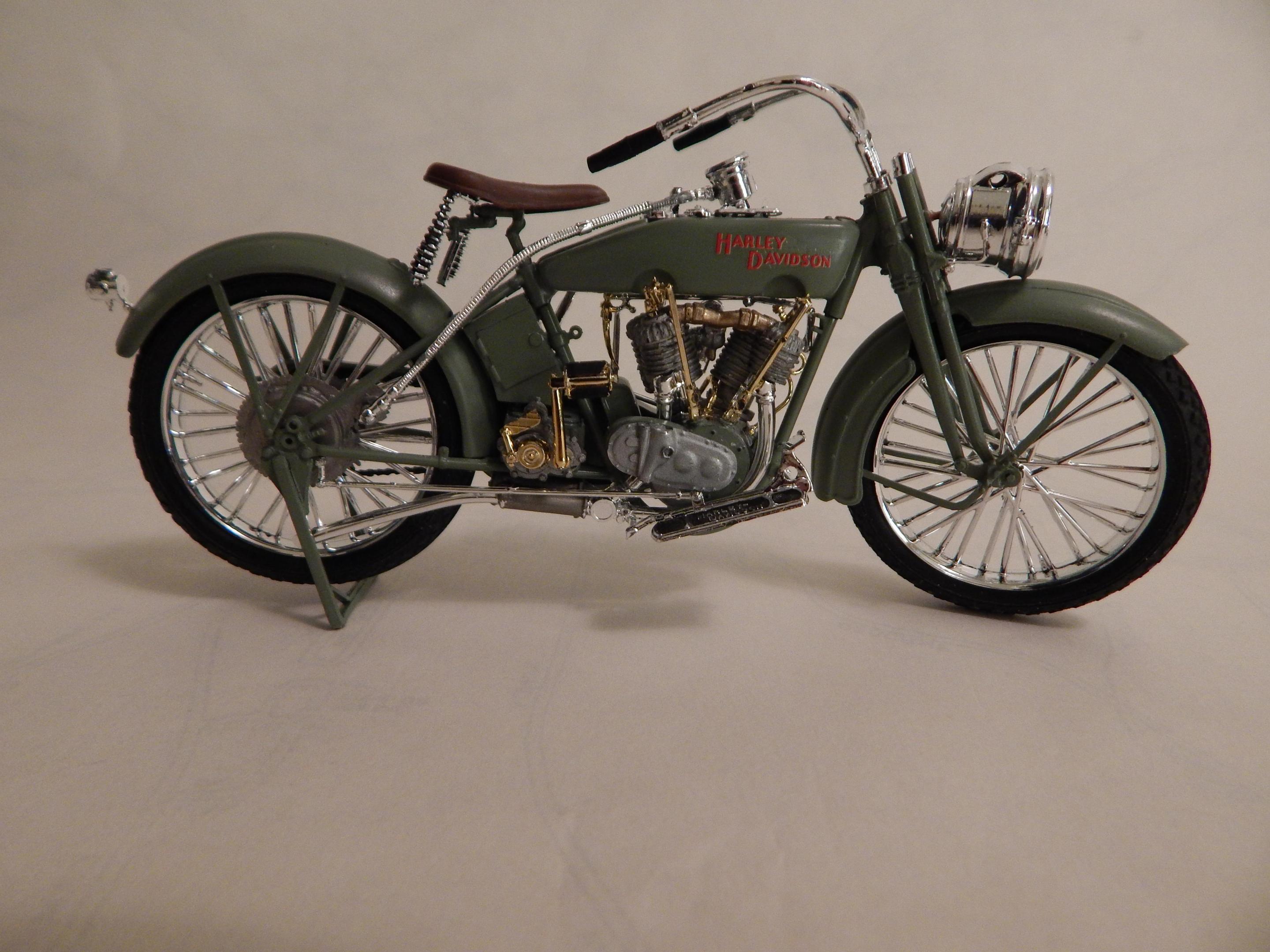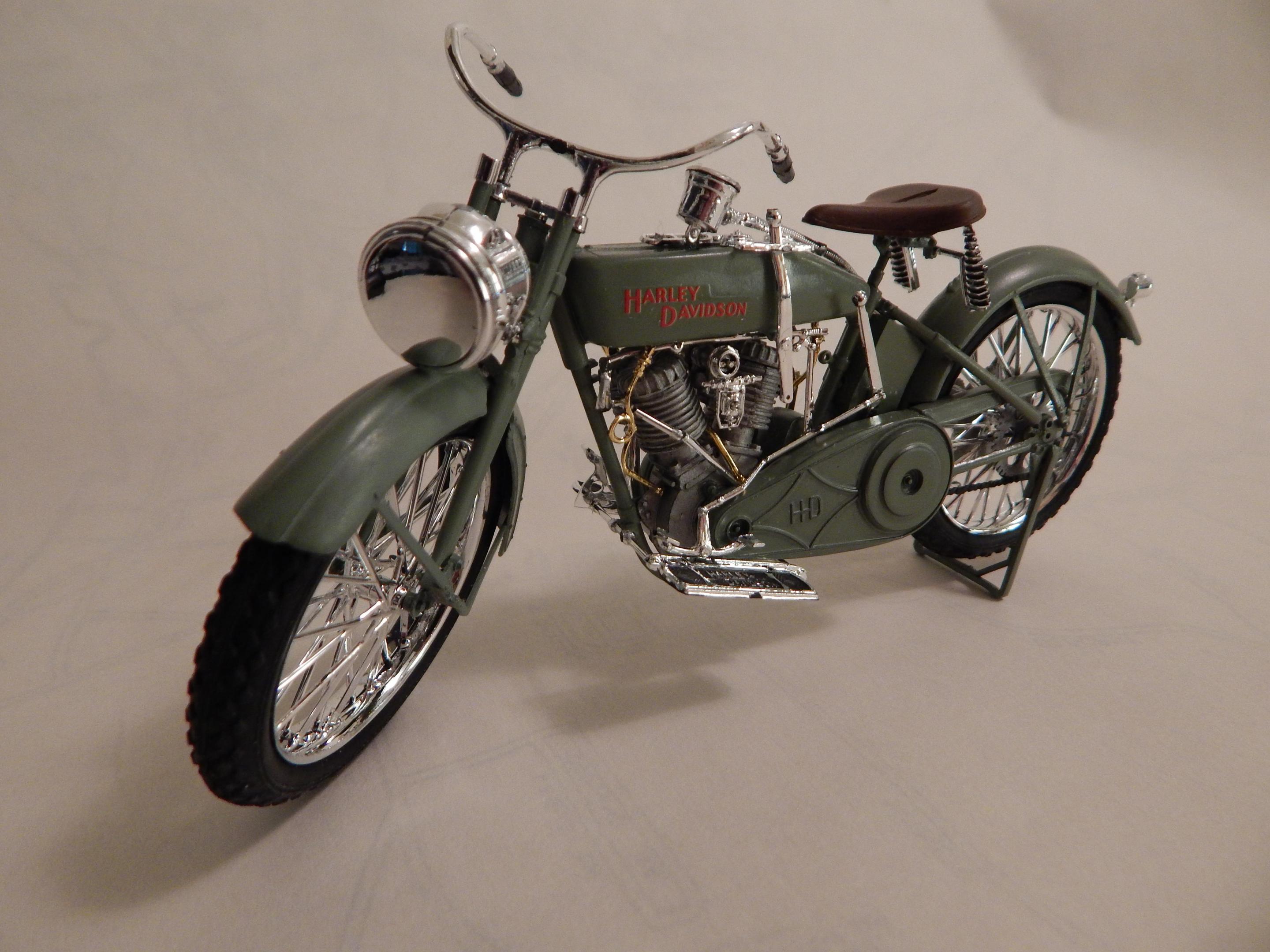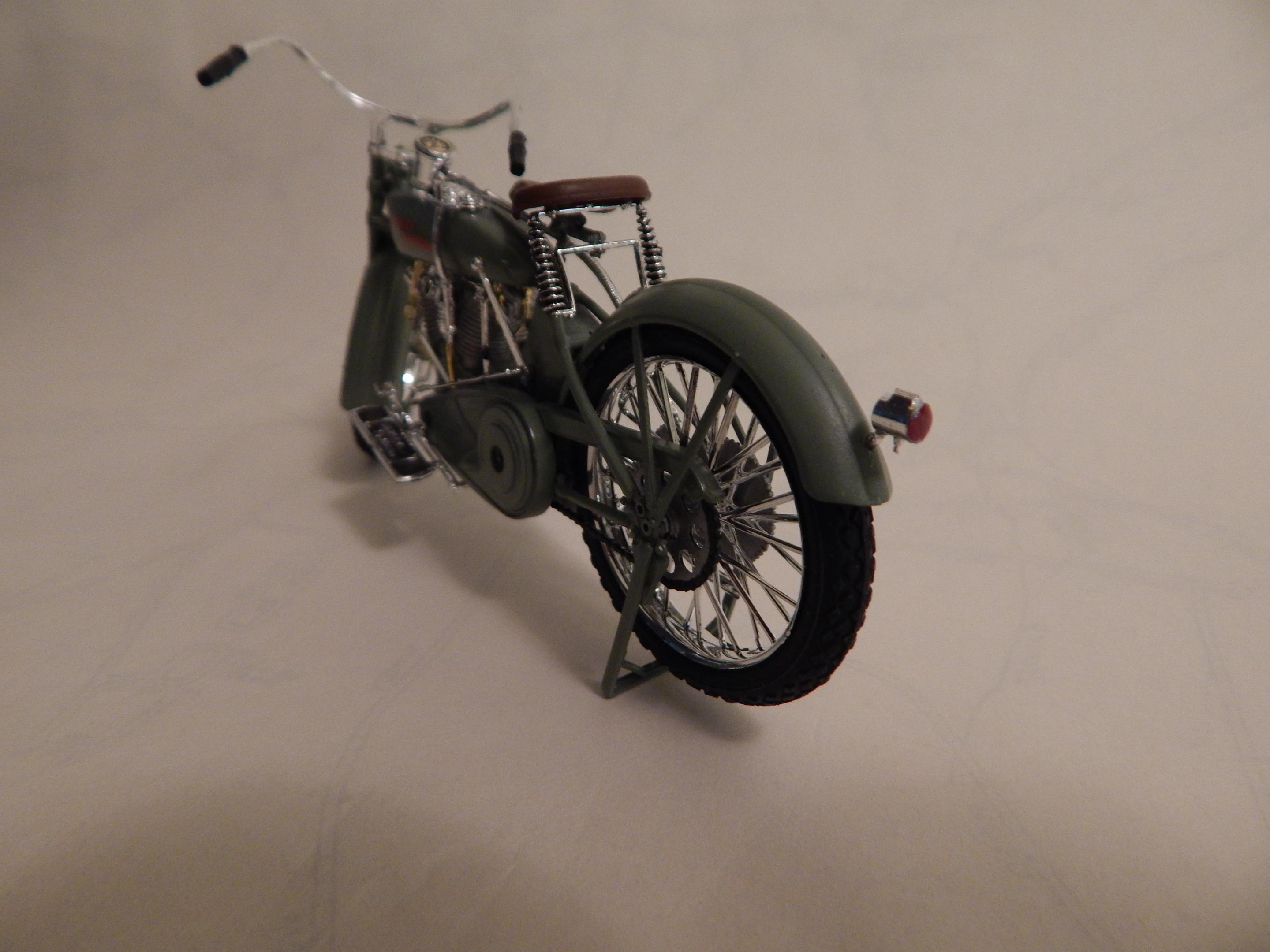 Happy spring to all,,just finished this up,,its actually 3 large scale Revell kits in one. Started with glue blob 1/2 assembled bag of parts from the swap meets. The Revell large scale police bike,circa mid to late 70's for the motor and frame,back wheel. And then I used some leftover parts from the large scale Triumph chopper kits for drive box,,rear fender + oil + battery box,, And drag style seat. Front springer ++ handlebars are from the large scale snap harley kit from the 1990's. Front wheel is from one of the ol Revell drag bike kits as is the speedometer+light. Scratch built the rear grab bar + and plate/rear light setup. Sprayed rattlecan testors orange,,hand painted everything else. Decent results from glueblob bag for 5 $ Thnx for lookin.